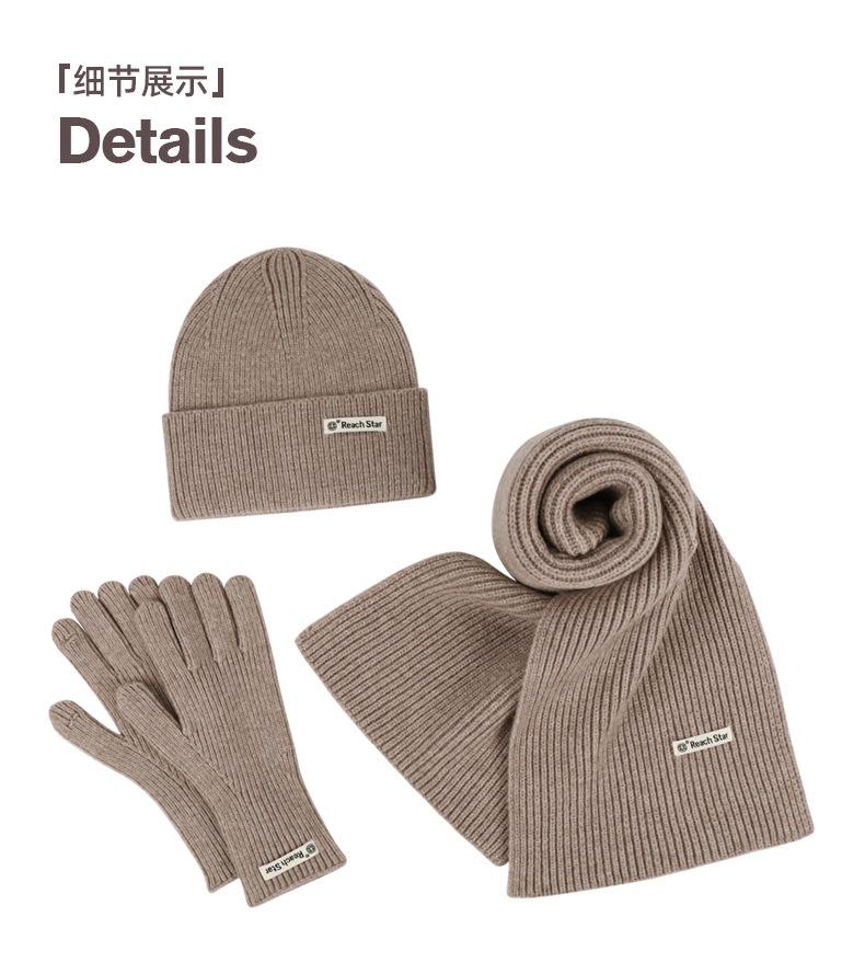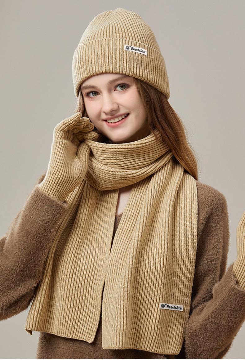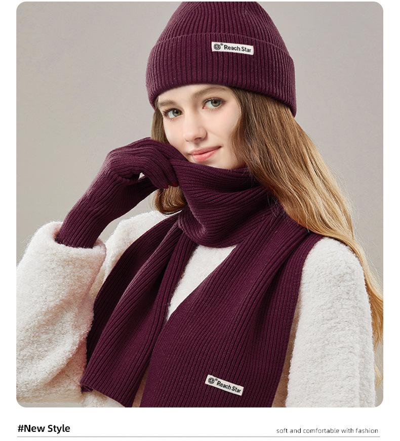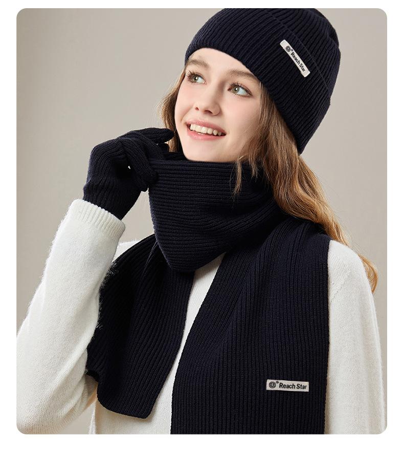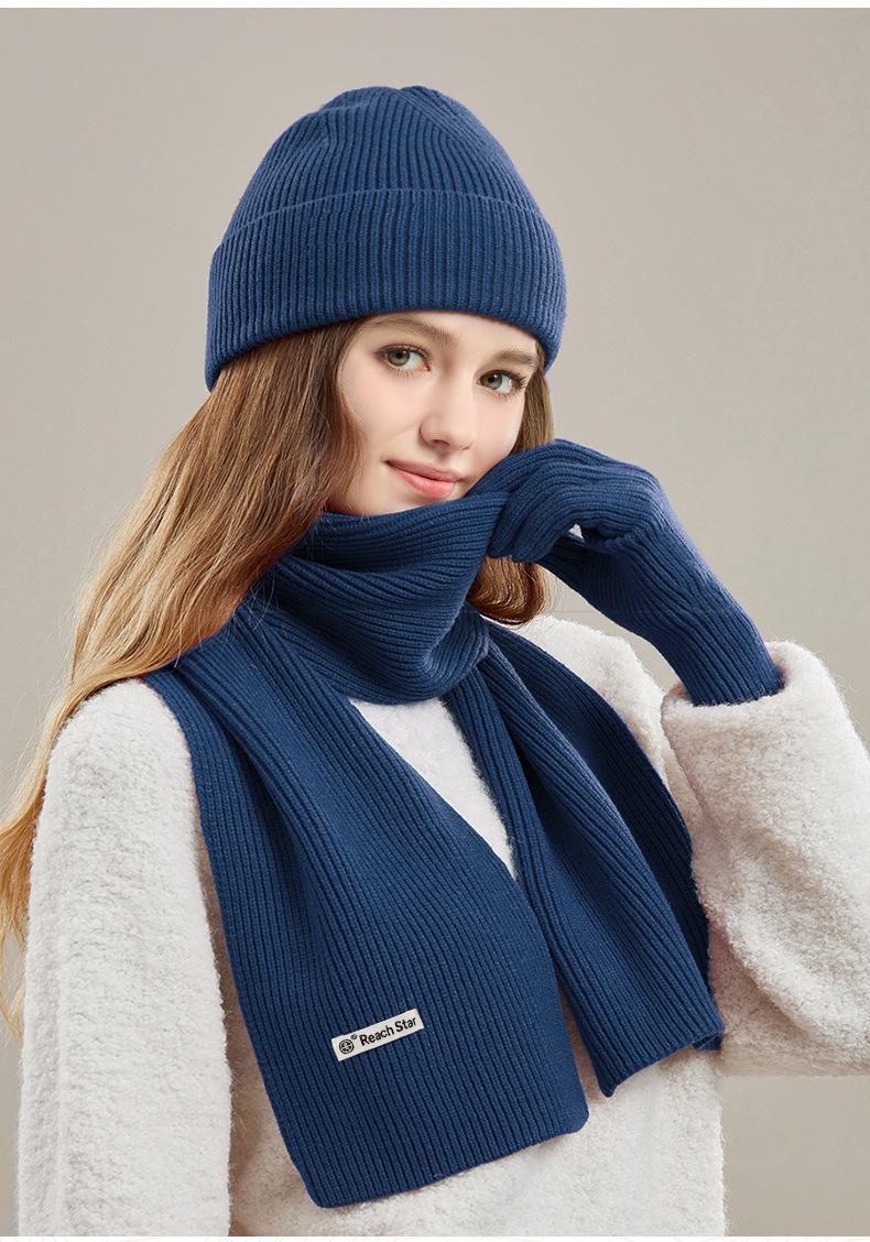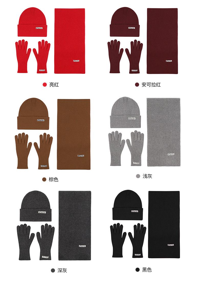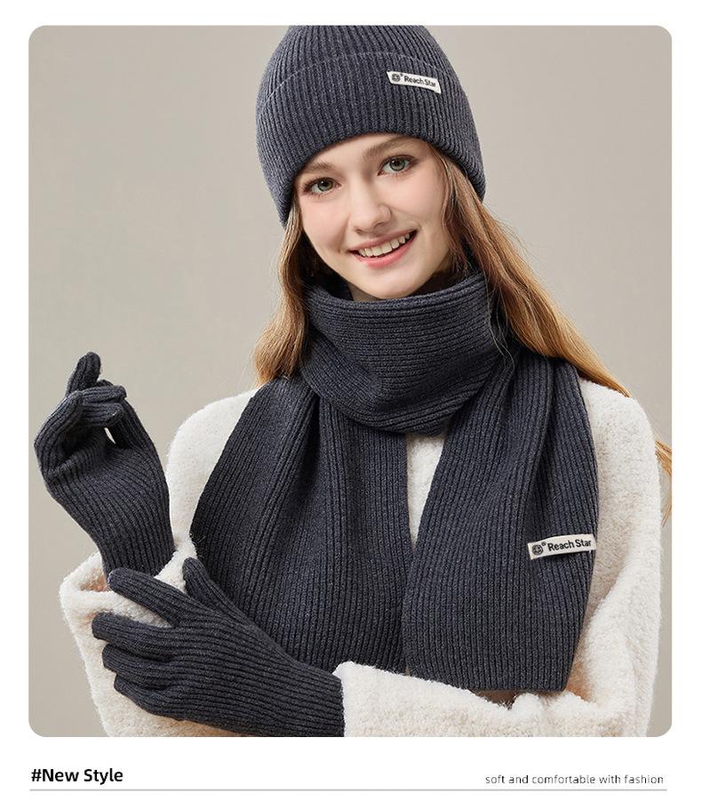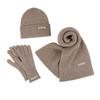 Conjunto de tres piezas de gorro de punto de color liso, cálido, resistente al frío, grueso, de lana para exteriores, bufanda y guantes.