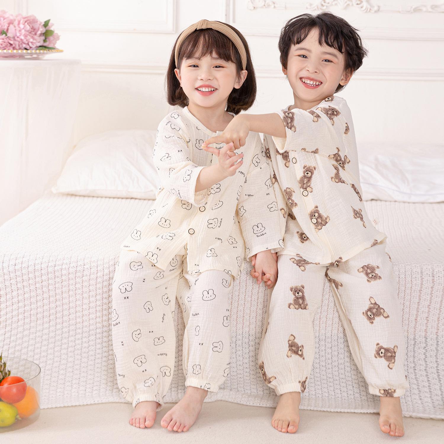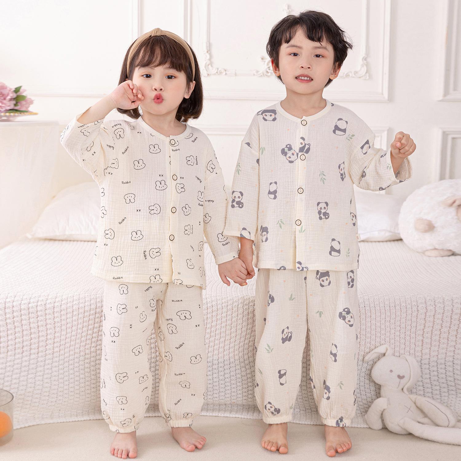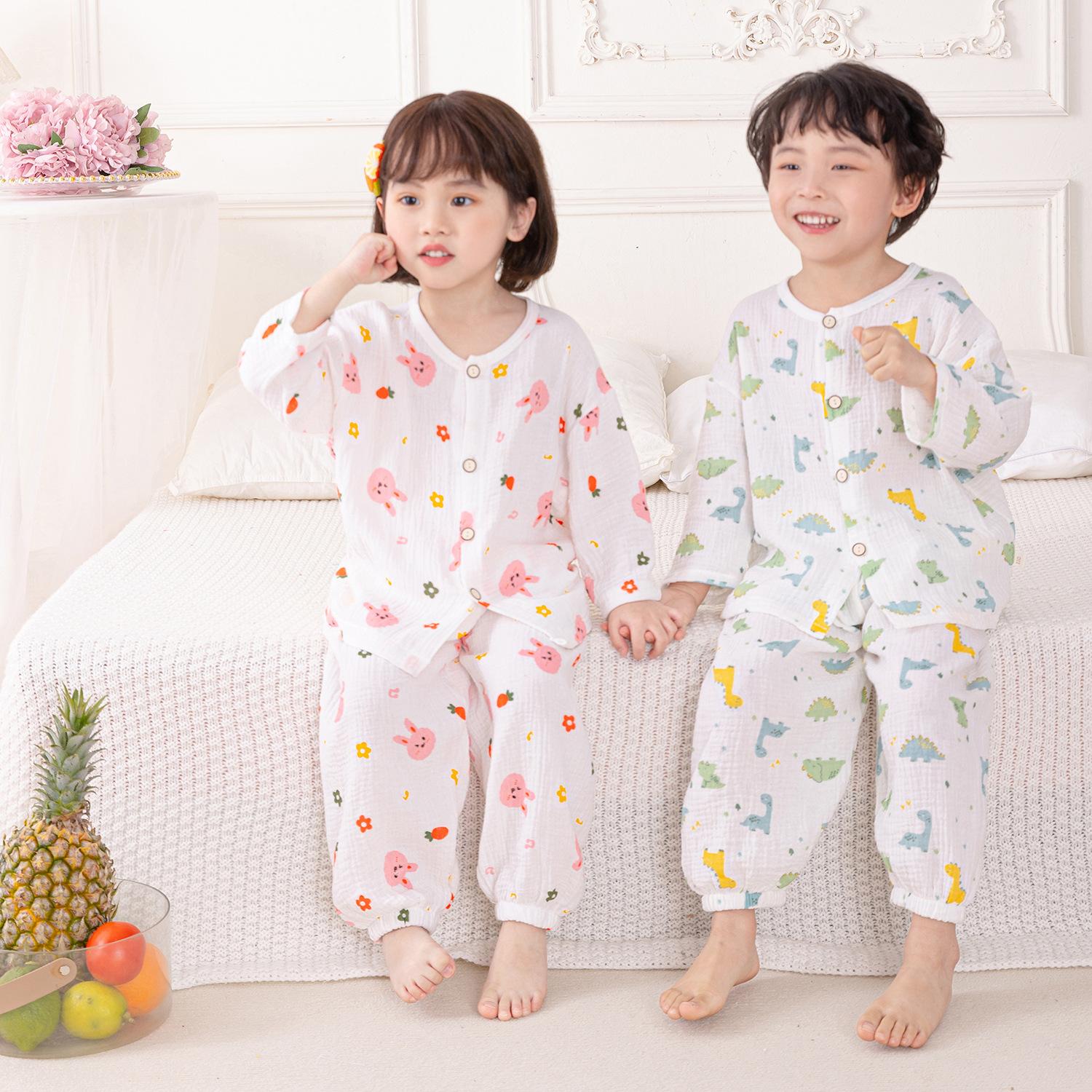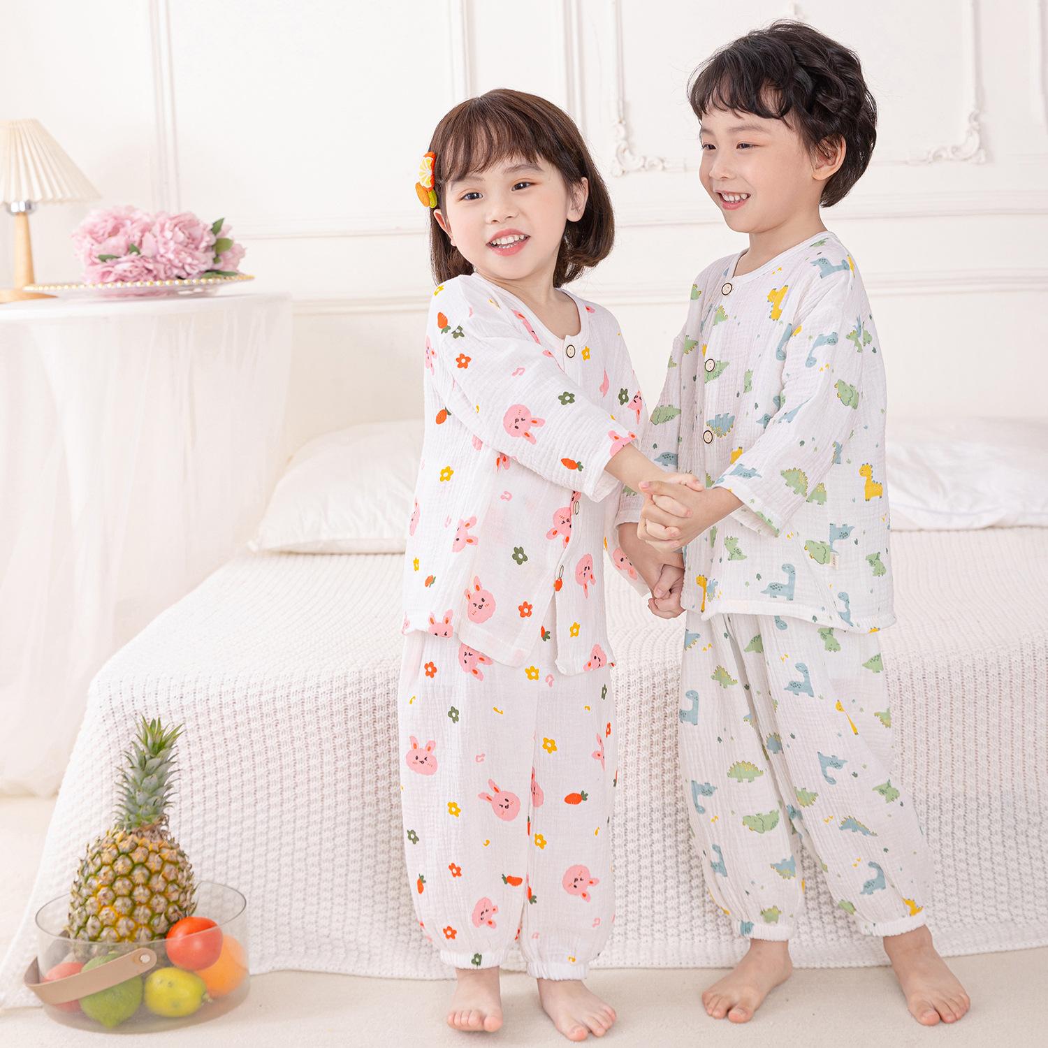 Omiocong Ropa de Verano de Gasa Doble para Niños para Aire Acondicionado para Niños y Niñas Algodón Puro Manga Nueve Cuartos Ropa para el Hogar Conjunto de Pijama