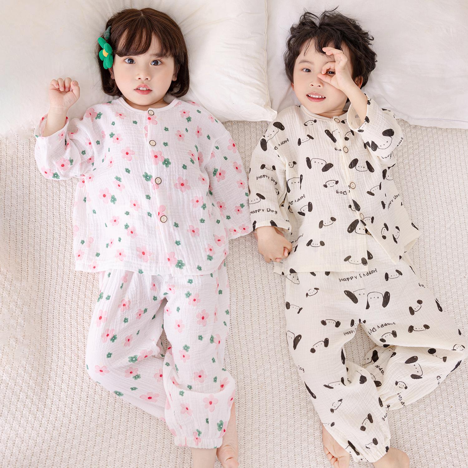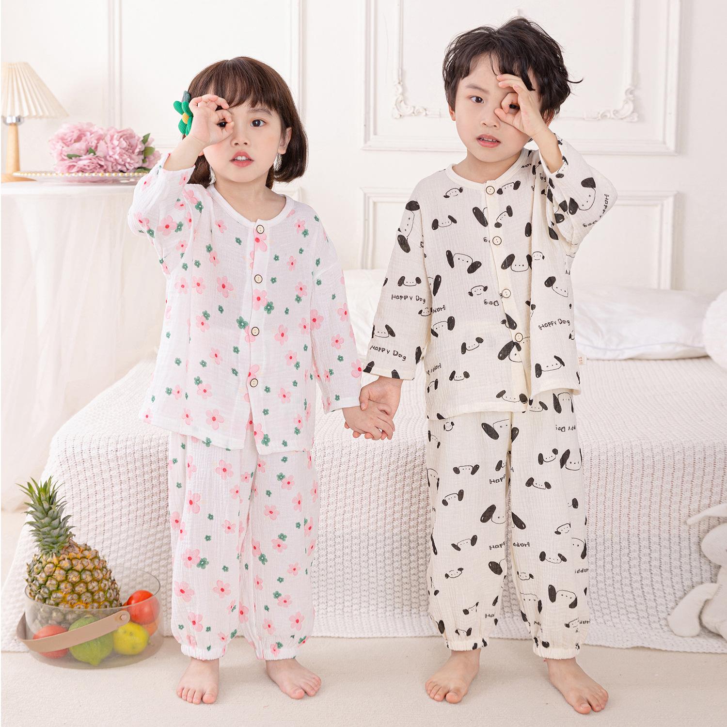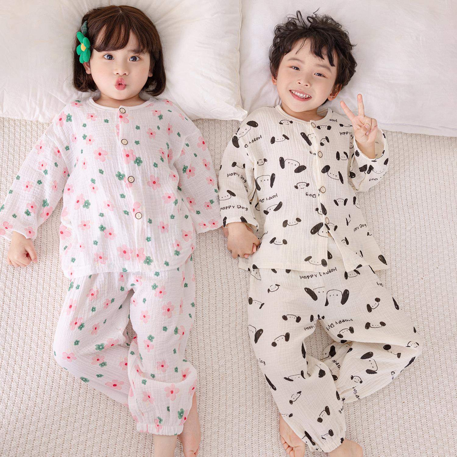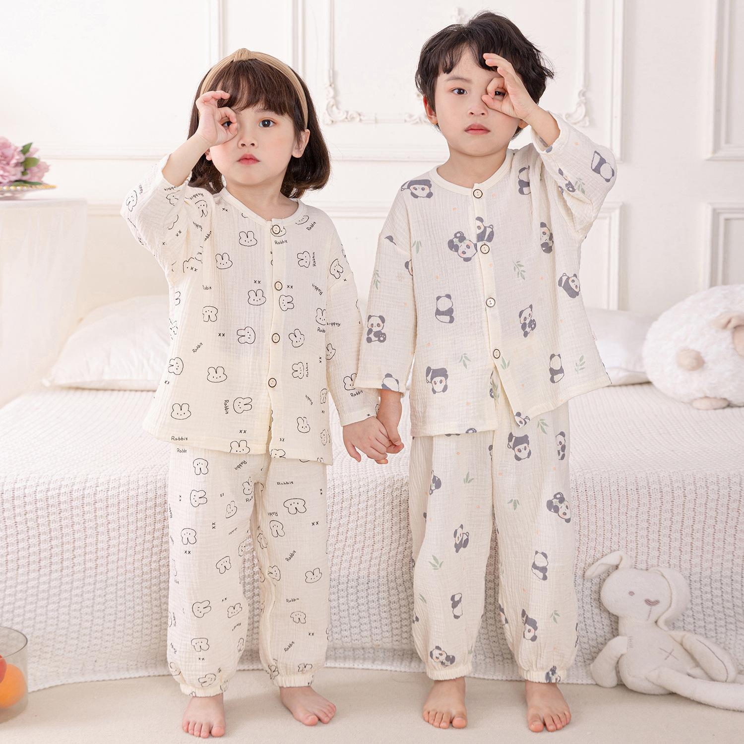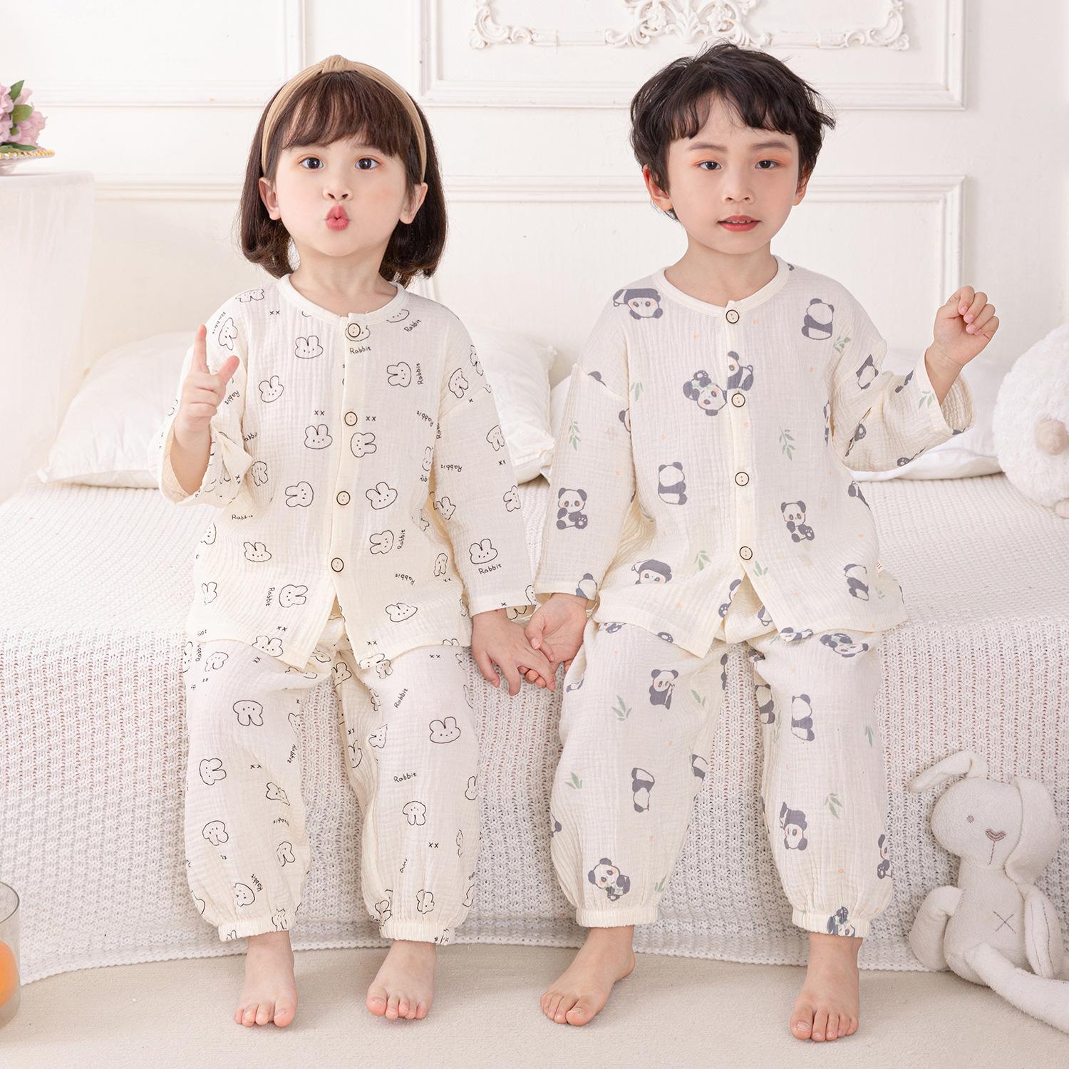 Omiocong Ropa de Verano de Gasa Doble para Niños para Aire Acondicionado para Niños y Niñas Algodón Puro Manga Nueve Cuartos Ropa para el Hogar Conjunto de Pijama
