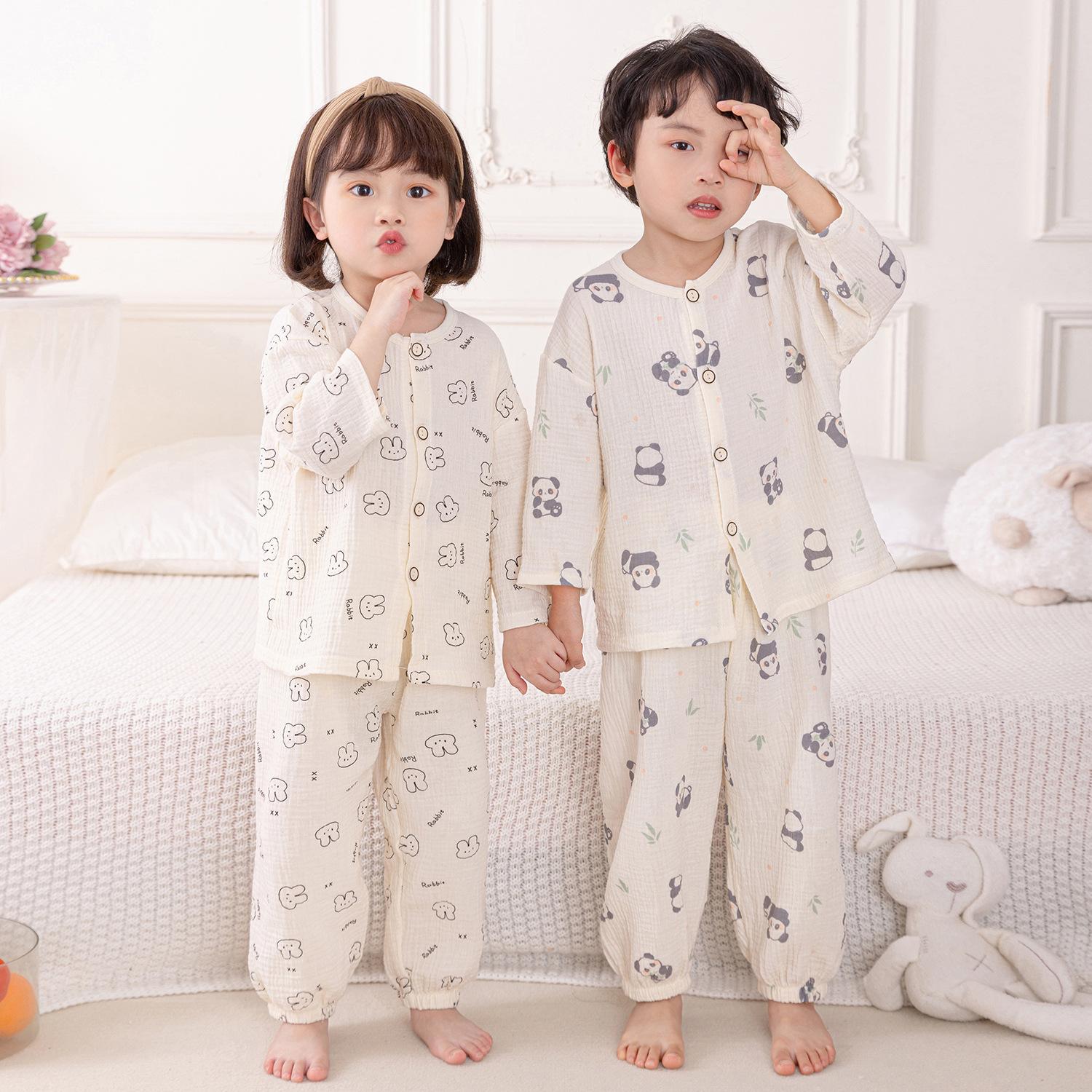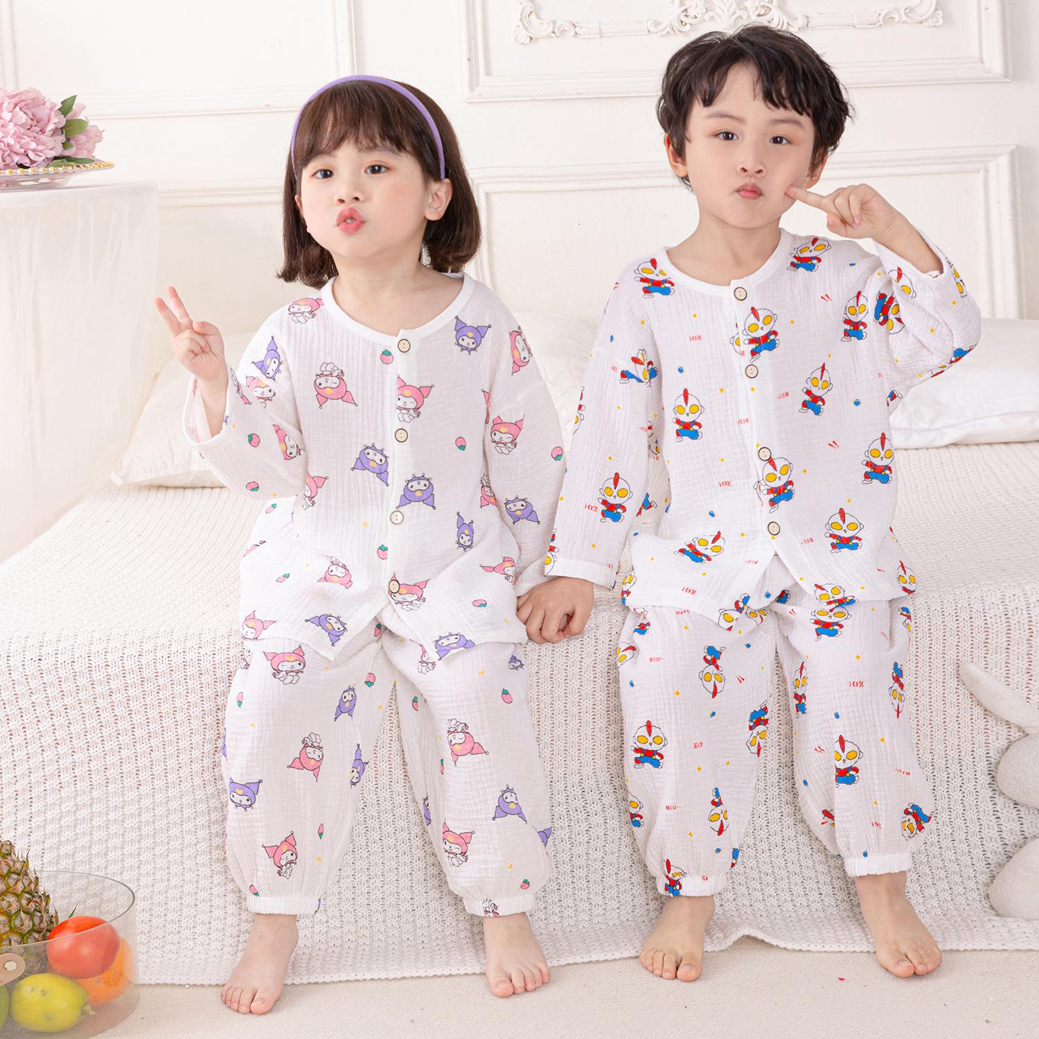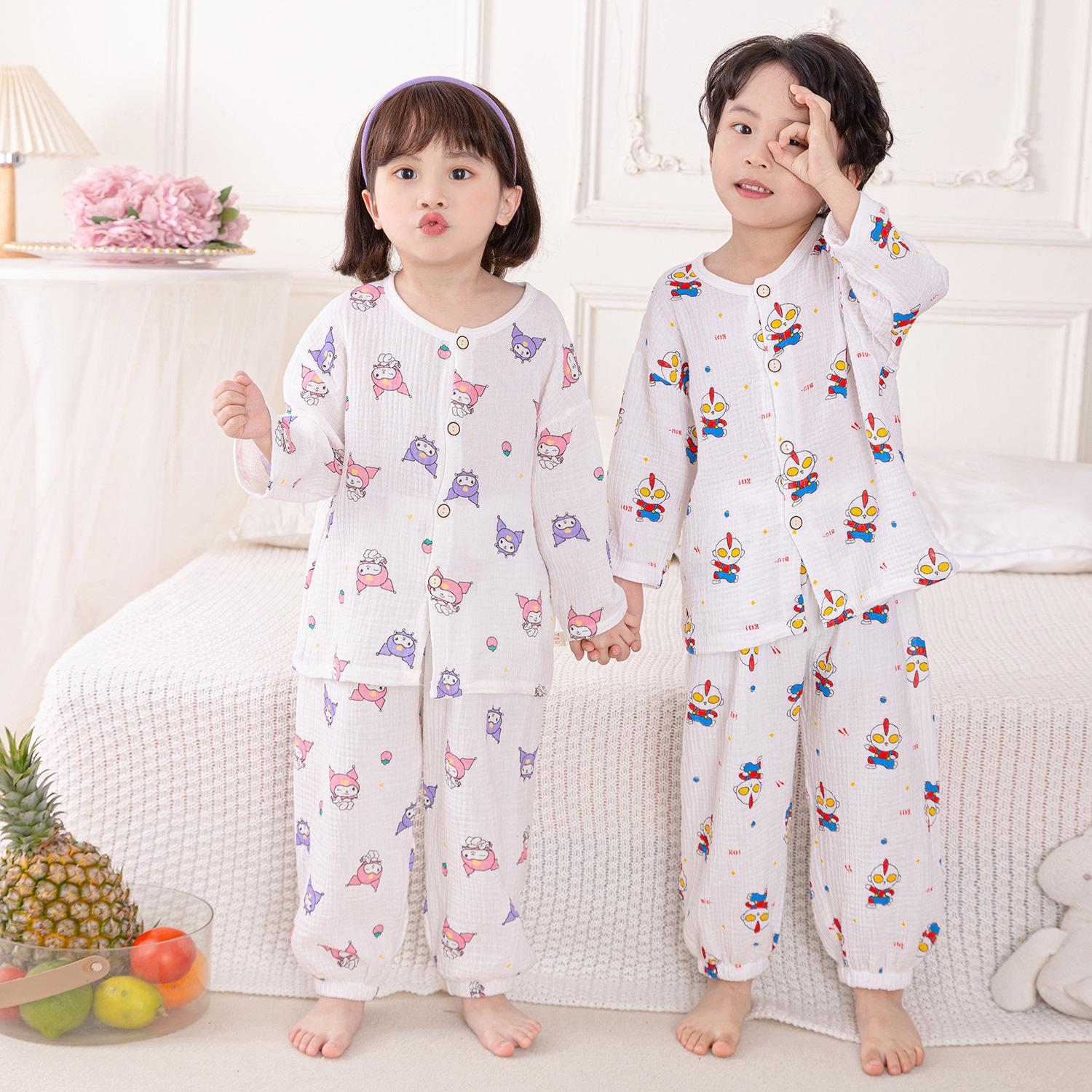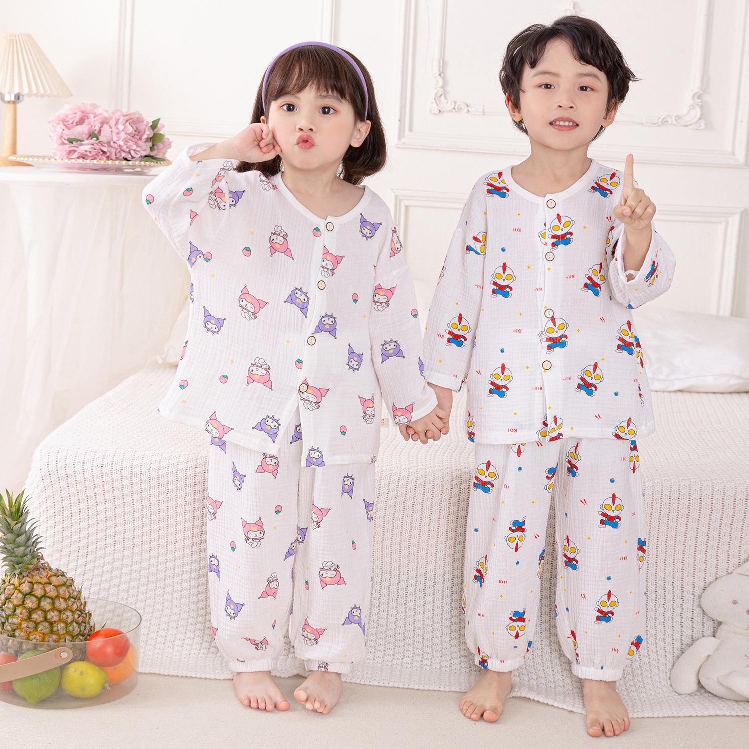 Omiocong Ropa de Verano de Gasa Doble para Niños para Aire Acondicionado para Niños y Niñas Algodón Puro Manga Nueve Cuartos Ropa para el Hogar Conjunto de Pijama