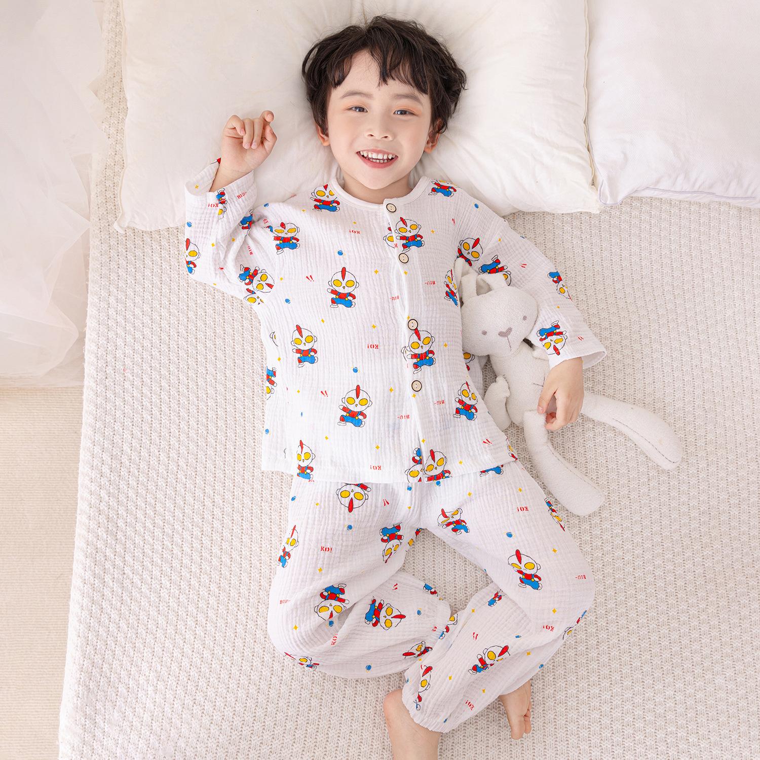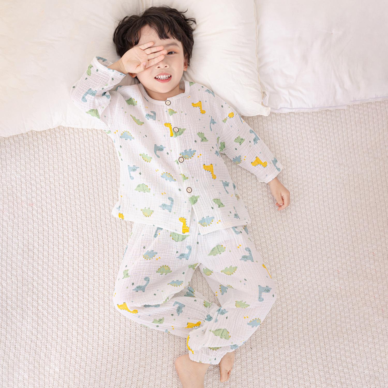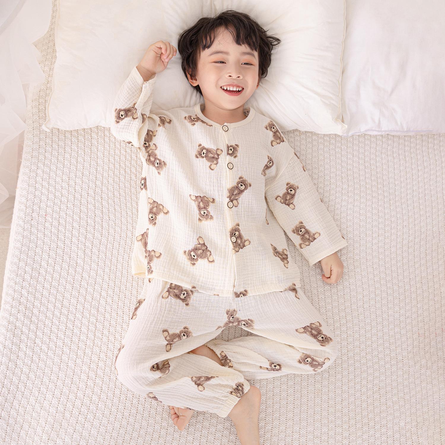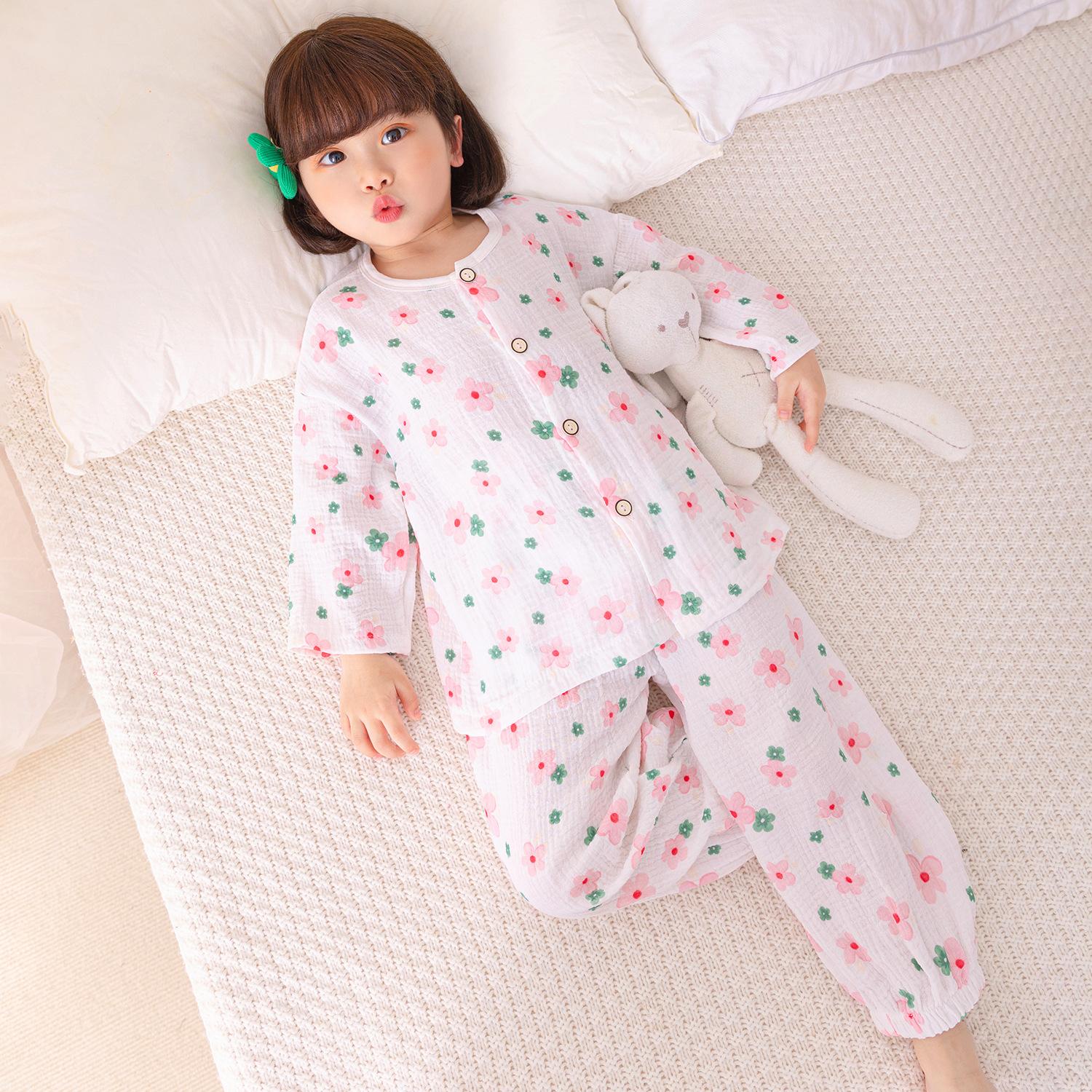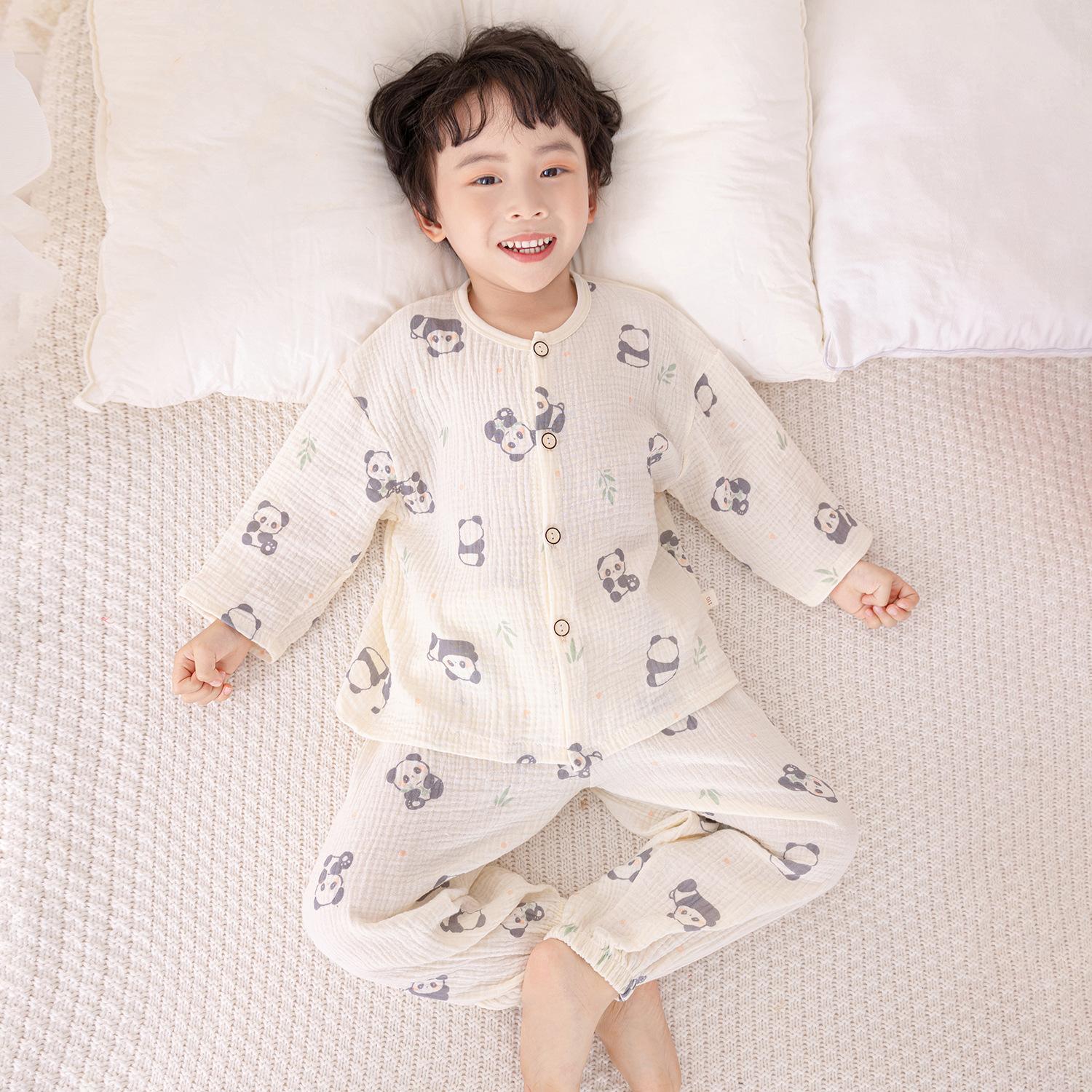 Omiocong Ropa de Verano de Gasa Doble para Niños para Aire Acondicionado para Niños y Niñas Algodón Puro Manga Nueve Cuartos Ropa para el Hogar Conjunto de Pijama