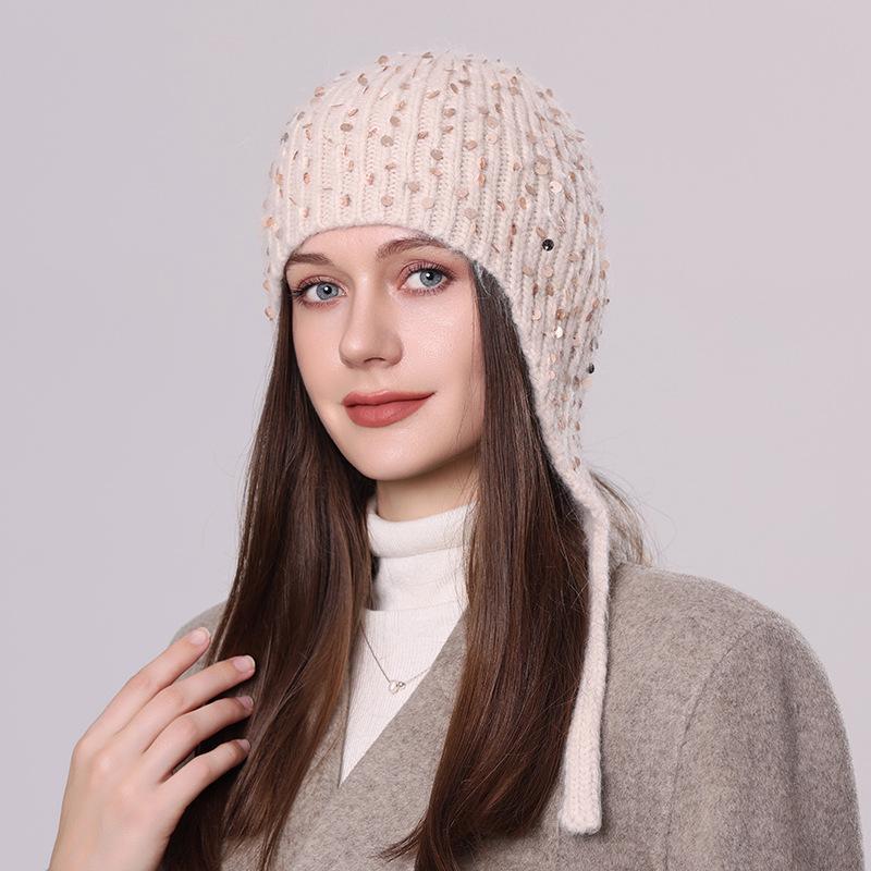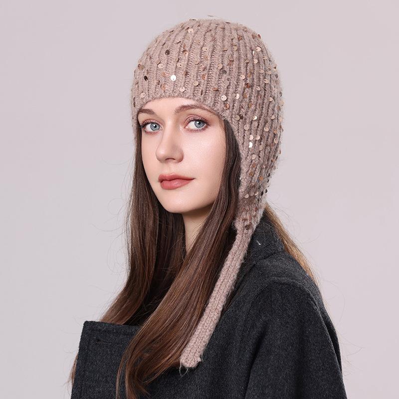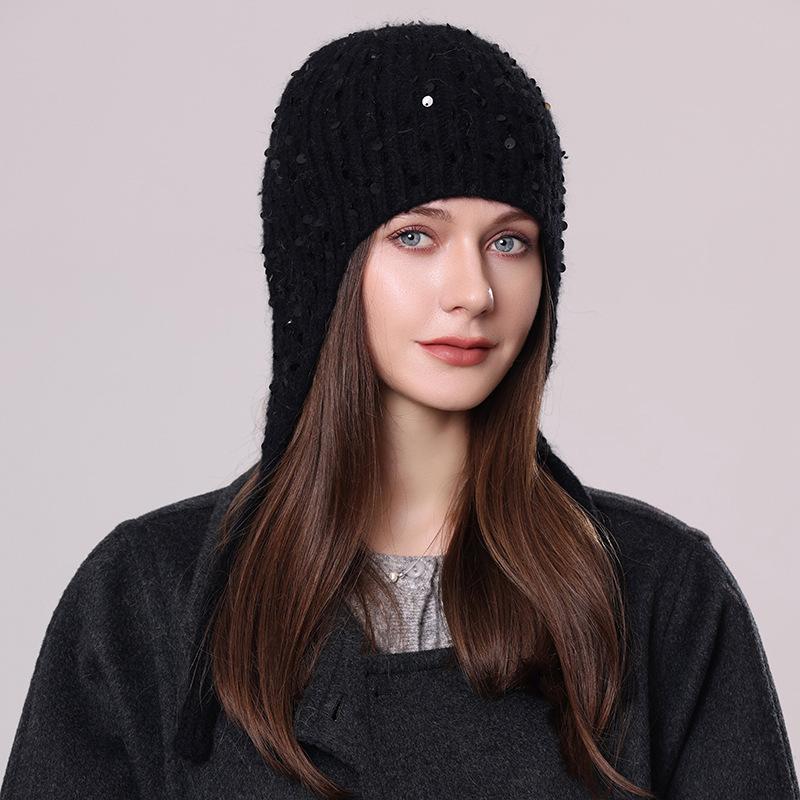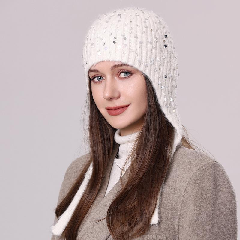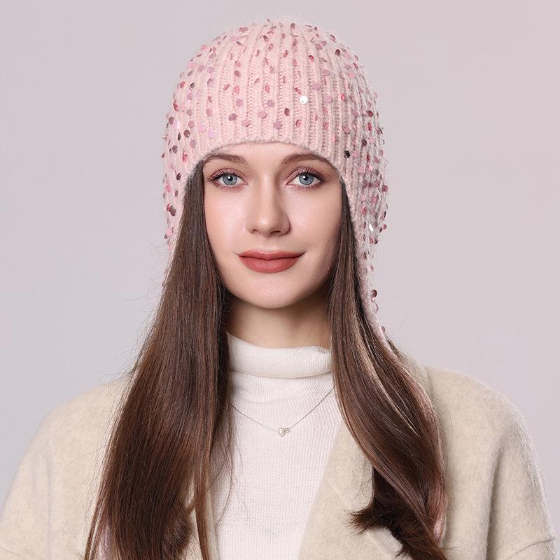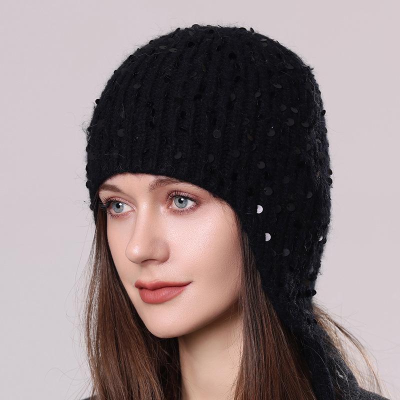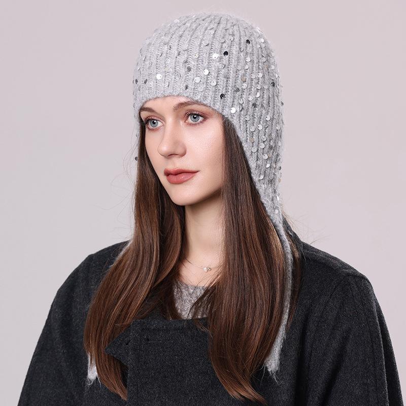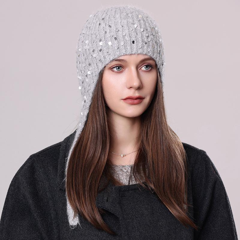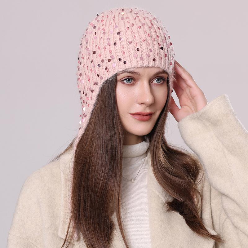 Sombrero de Punto de Piel de Conejo con Lentejuelas para Mujer Europea y Americana Invierno Cálido y Versátil Sombrero de Lana Moderno Protección para las Orejas Gorro Pulóver Transfronterizo