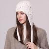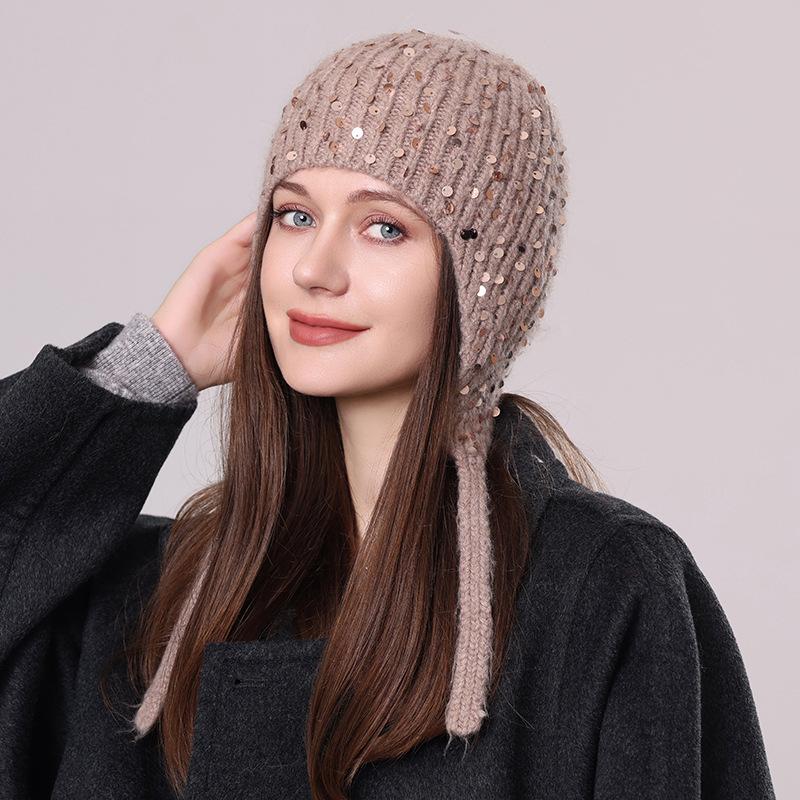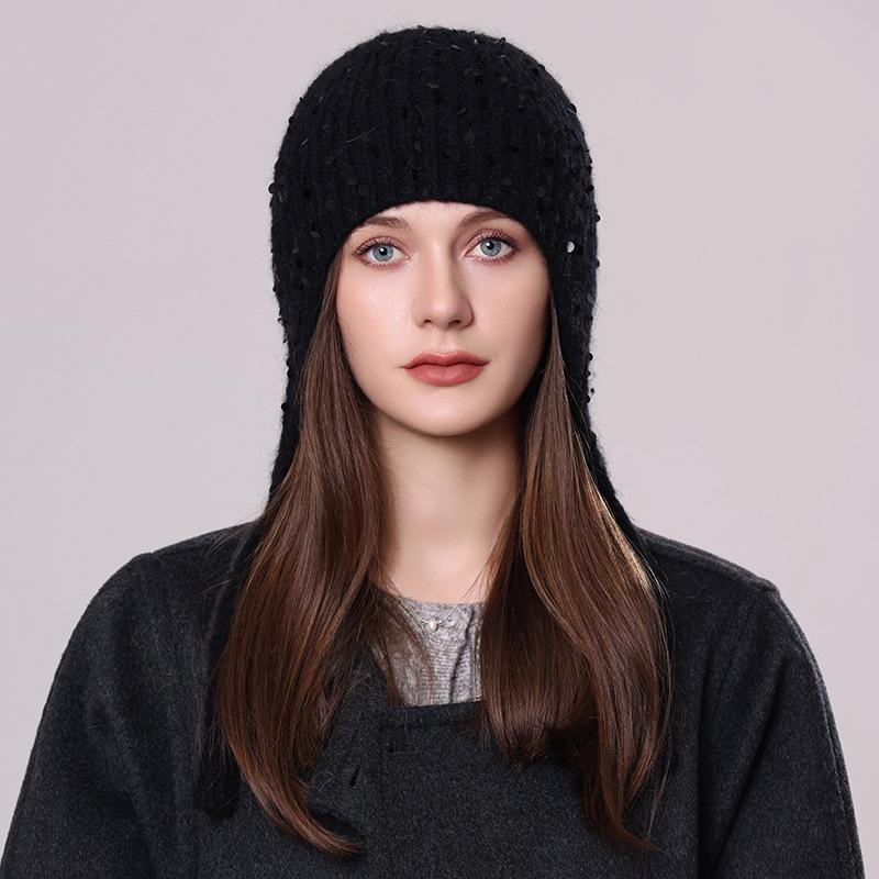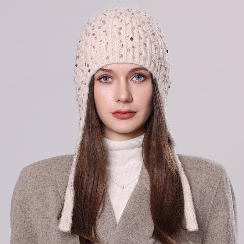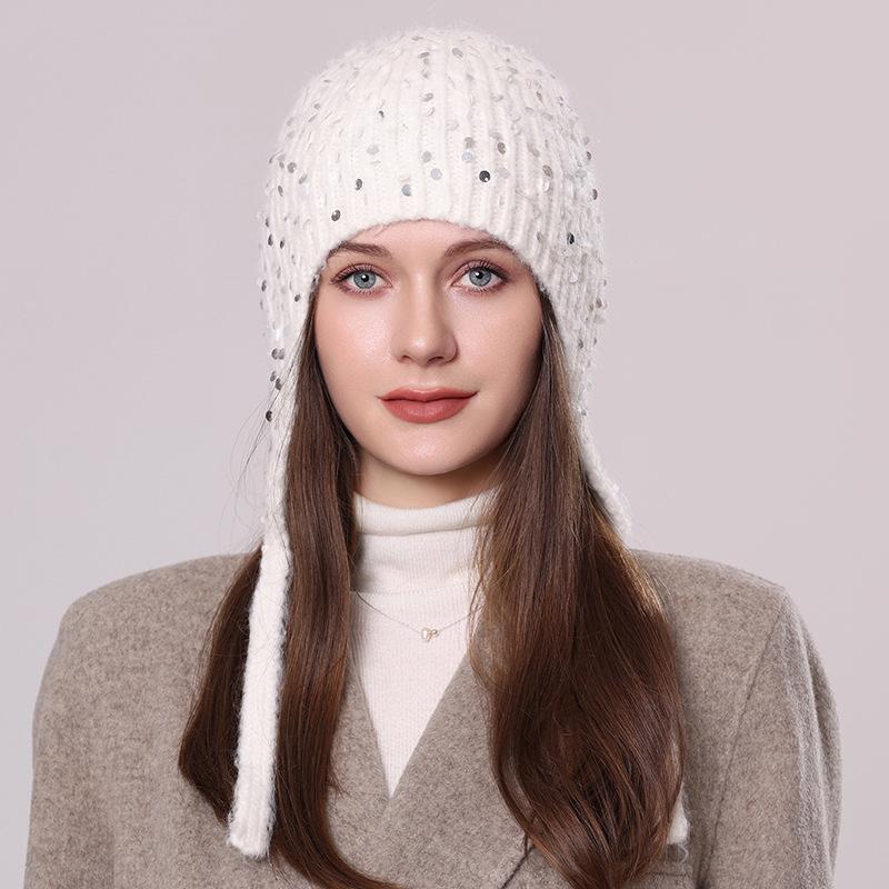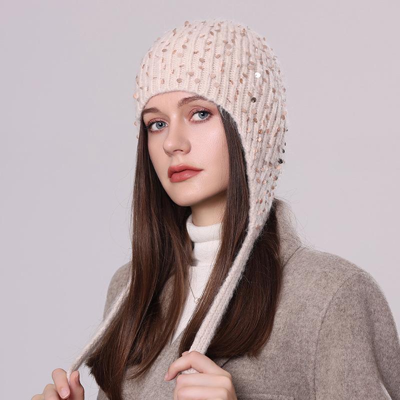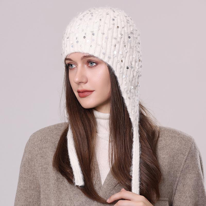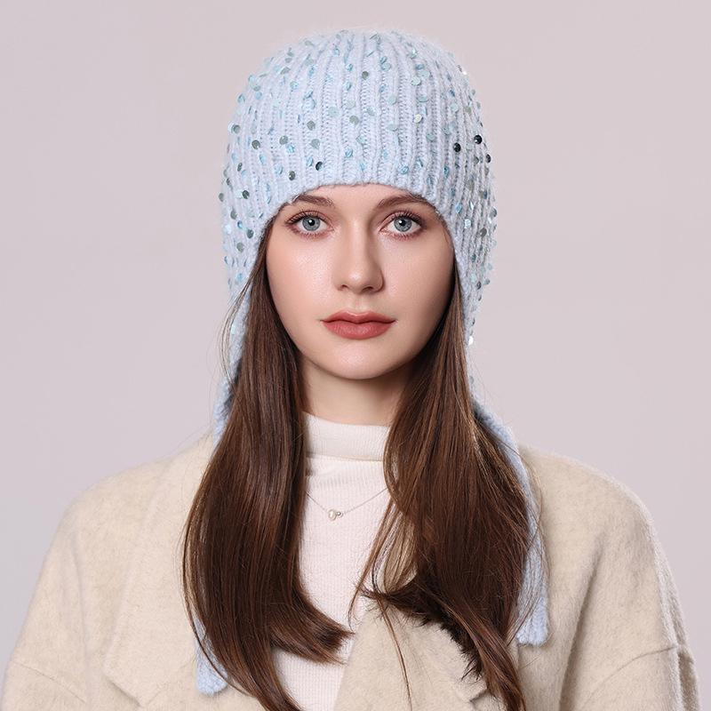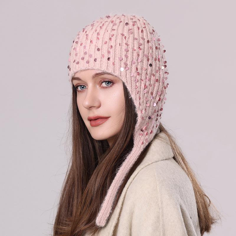 Sombrero de Punto de Piel de Conejo con Lentejuelas para Mujer Europea y Americana Invierno Cálido y Versátil Sombrero de Lana Moderno Protección para las Orejas Gorro Pulóver Transfronterizo