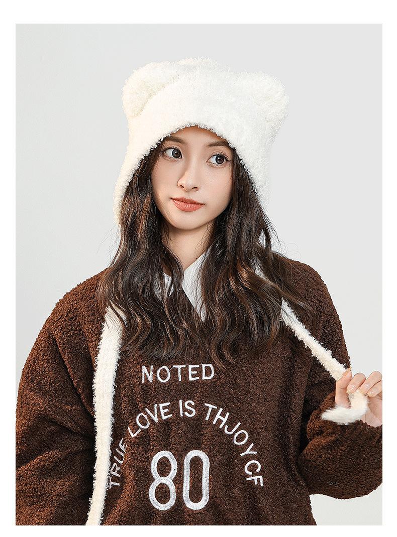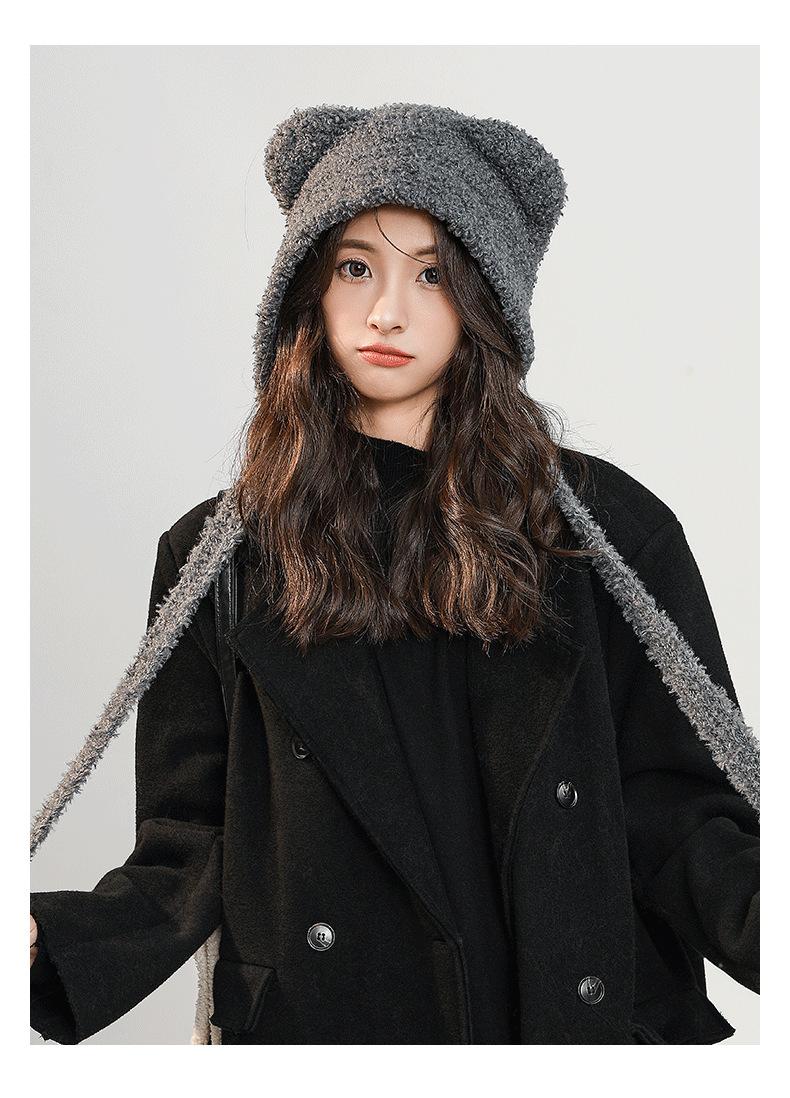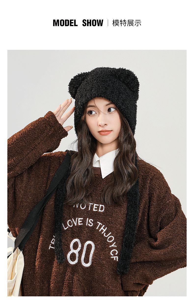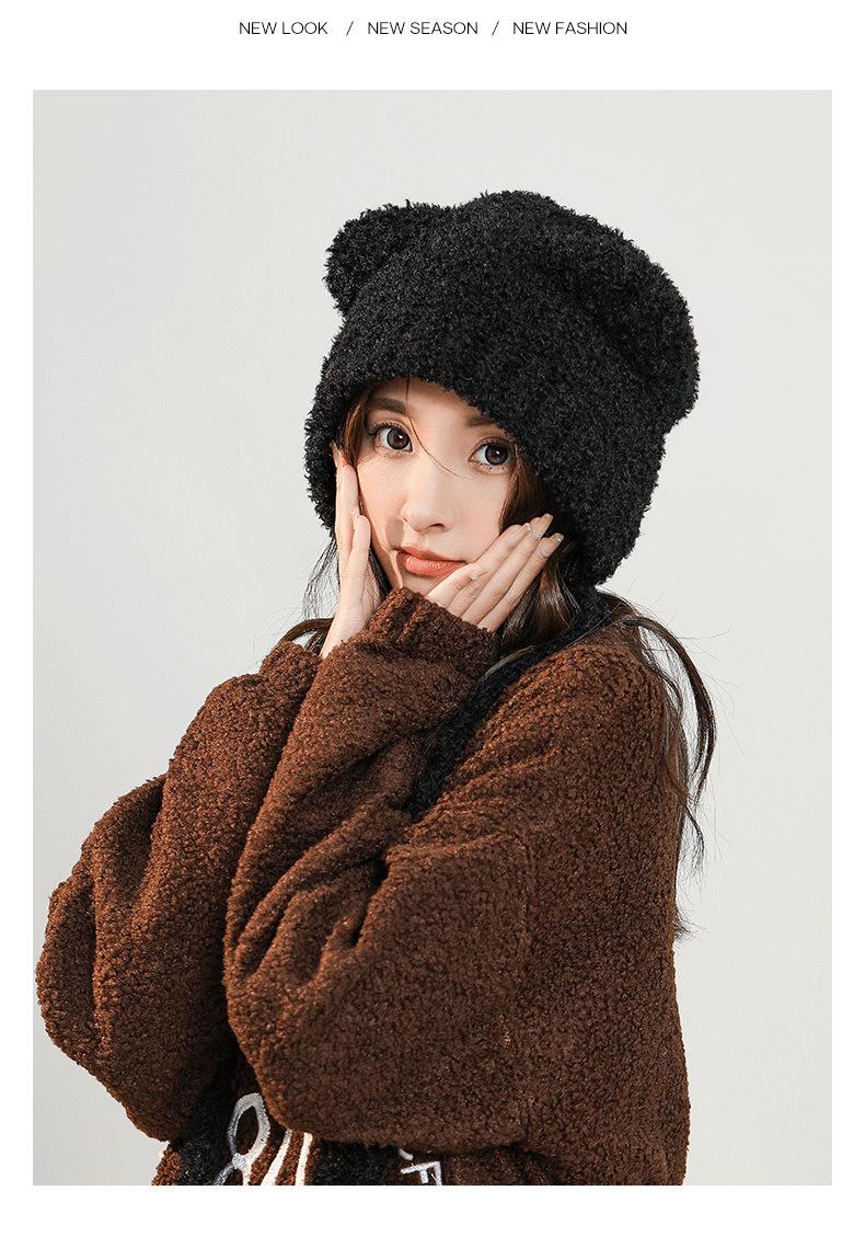 Gorro de punto con orejas de oso para mujer, de otoño e invierno, de felpa, grande, con protección para las orejas, cálido gorro de lana Baotou.