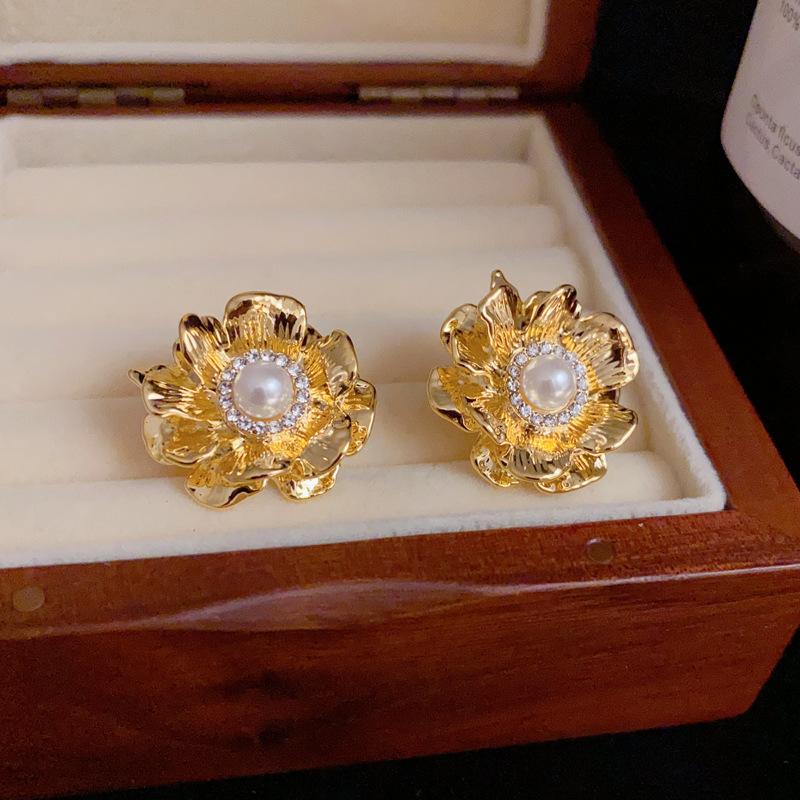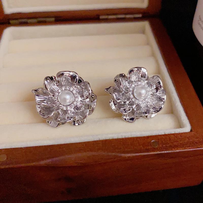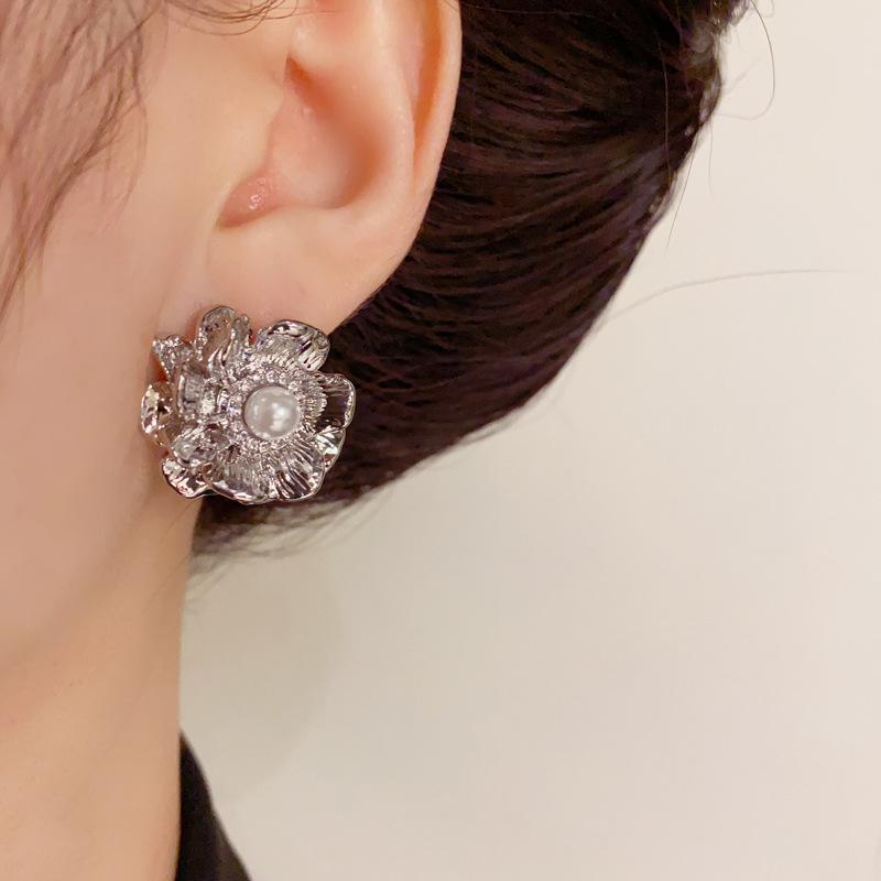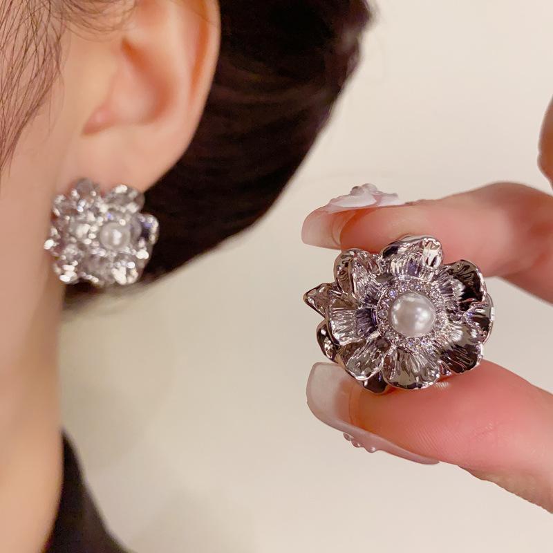 Pendientes de flor de perla de metal tridimensionales retro con personalidad europea y americana, pendientes femeninos de plata s925, pendientes de viento frío simples de moda