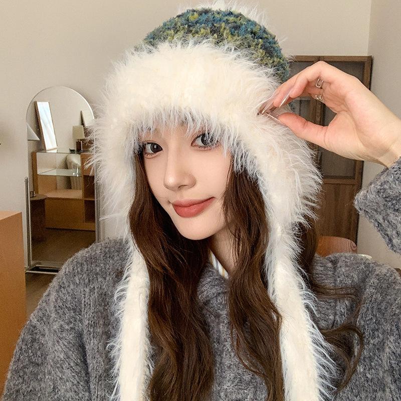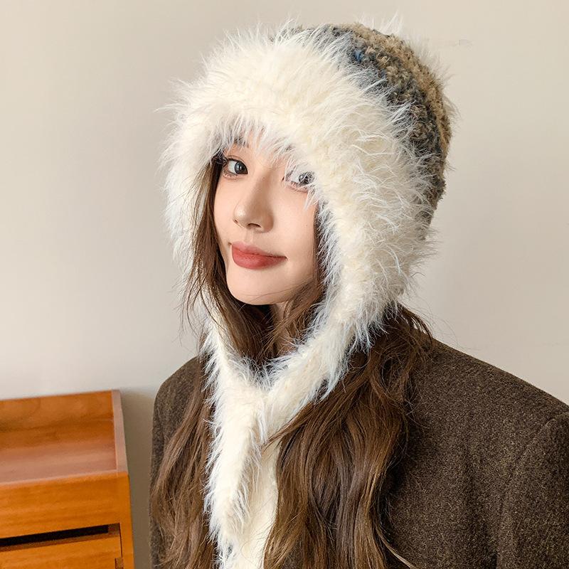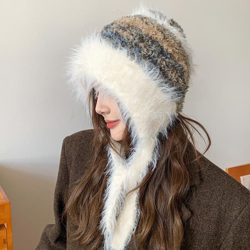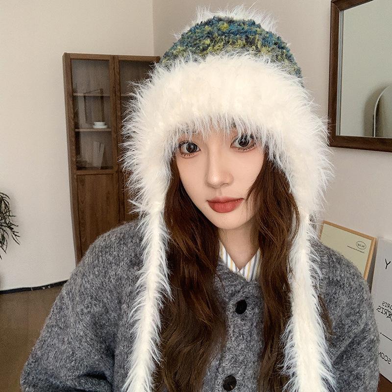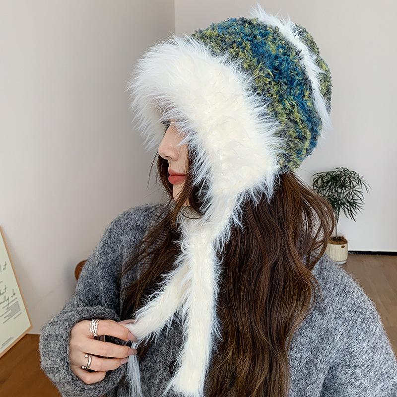 Gorro tejido de lana retro colorido de moda con vendaje de bola de lana para mujer, otoño e invierno, grueso, a prueba de frío, cálido, con protección para las orejas, gorro de lana