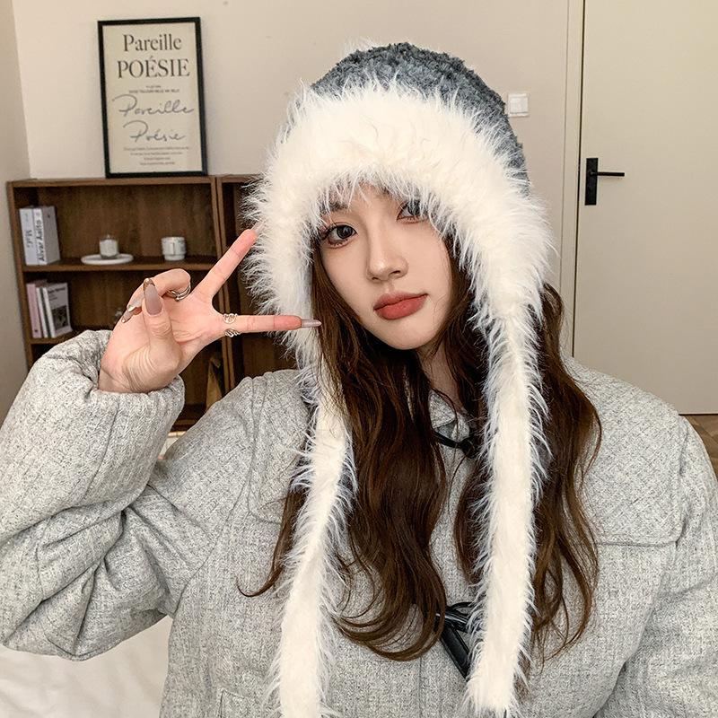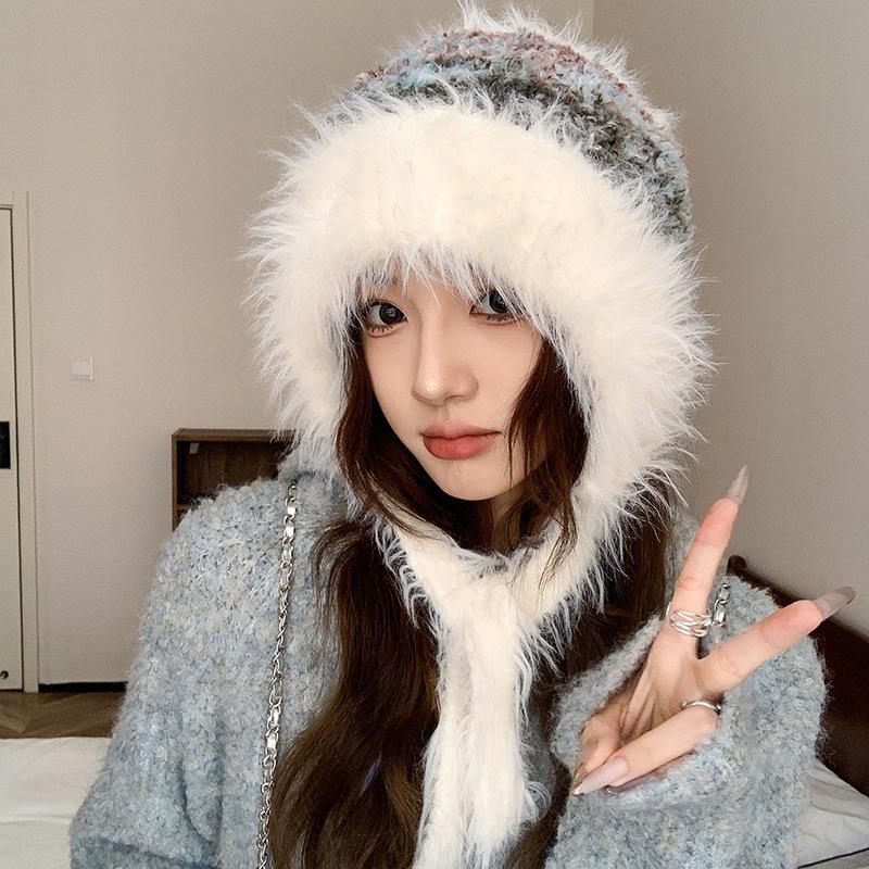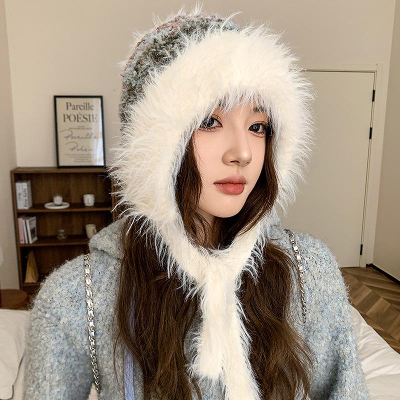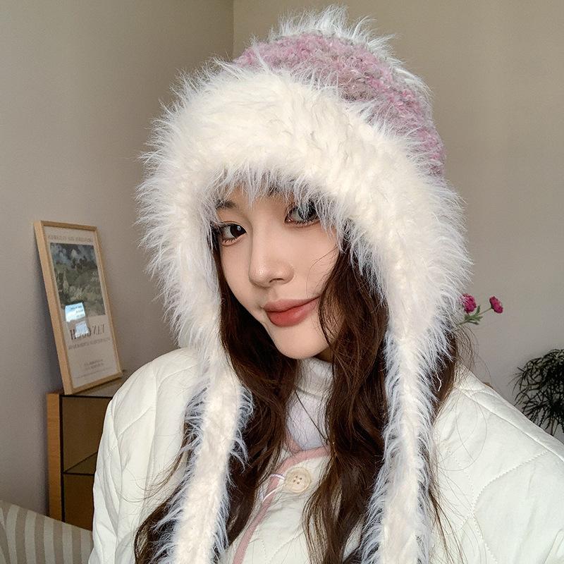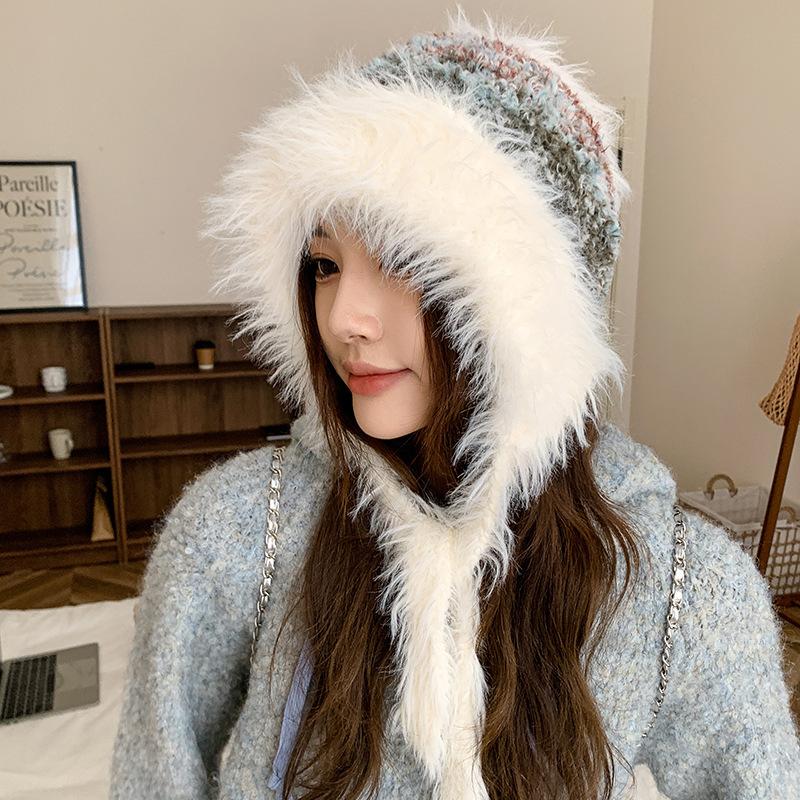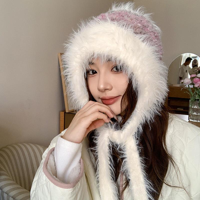 Gorro tejido de lana retro colorido de moda con vendaje de bola de lana para mujer, otoño e invierno, grueso, a prueba de frío, cálido, con protección para las orejas, gorro de lana