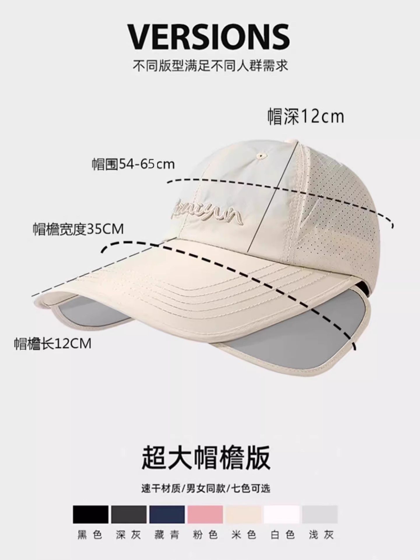 Black, stretchable brim, extended and widened brim, Light gray, stretchable brim, extended and widened brim, N...