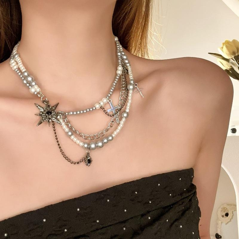 Lujo Ligero Diamante Elegante Estrella Cruz Cadena de Perlas Multicapa Cadena Clavícula Estilo Francés Elegante Elegante Collar de Alta Gama