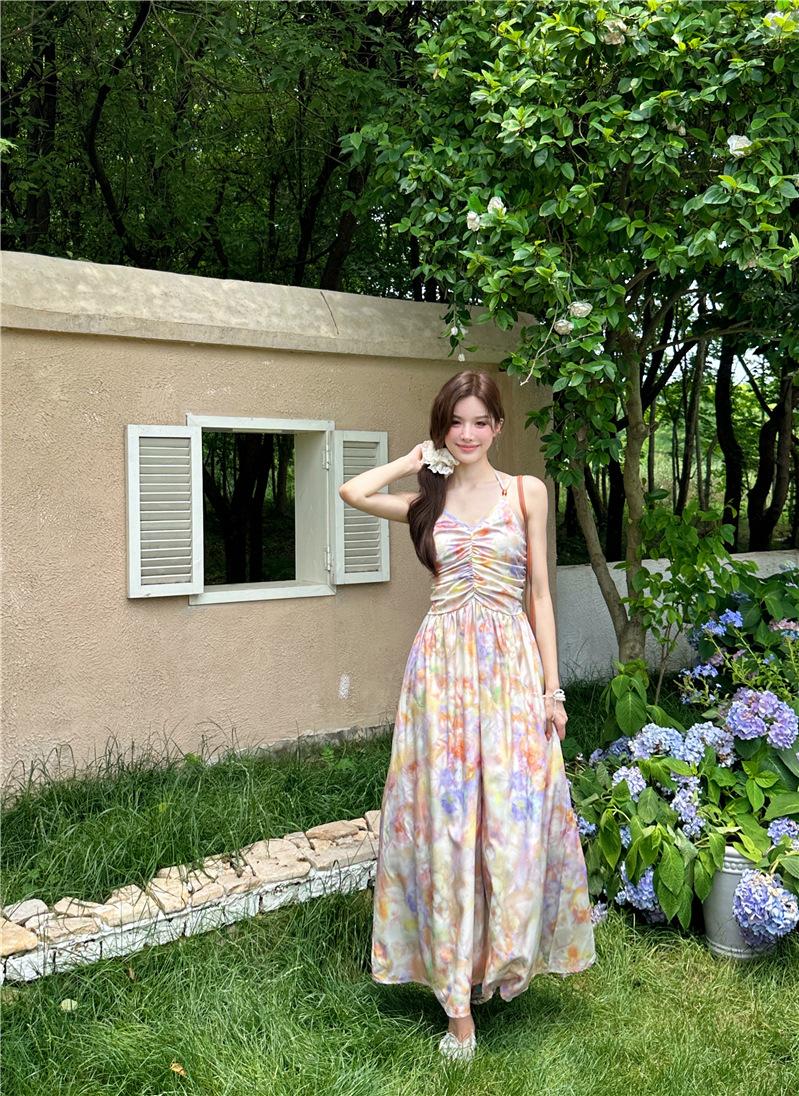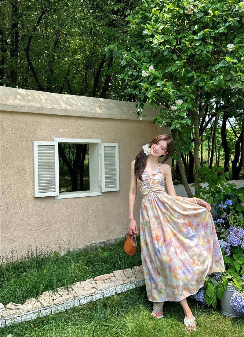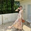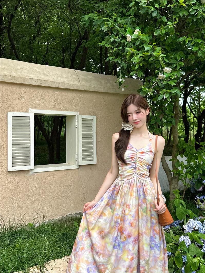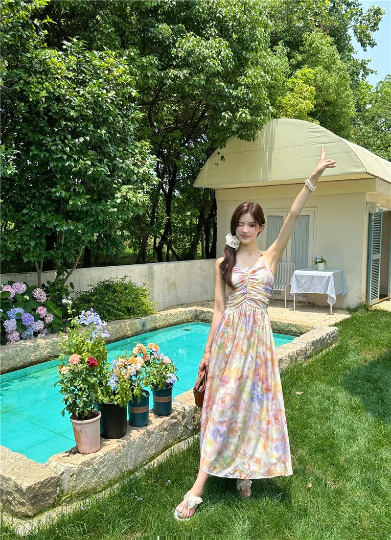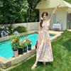 Vestido largo elegante con escote halter, espalda descubierta y estampado floral estilo retro francés para vacaciones de verano, para mujer