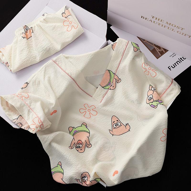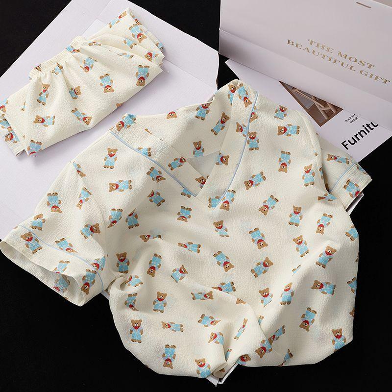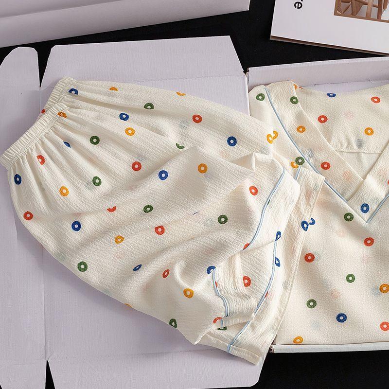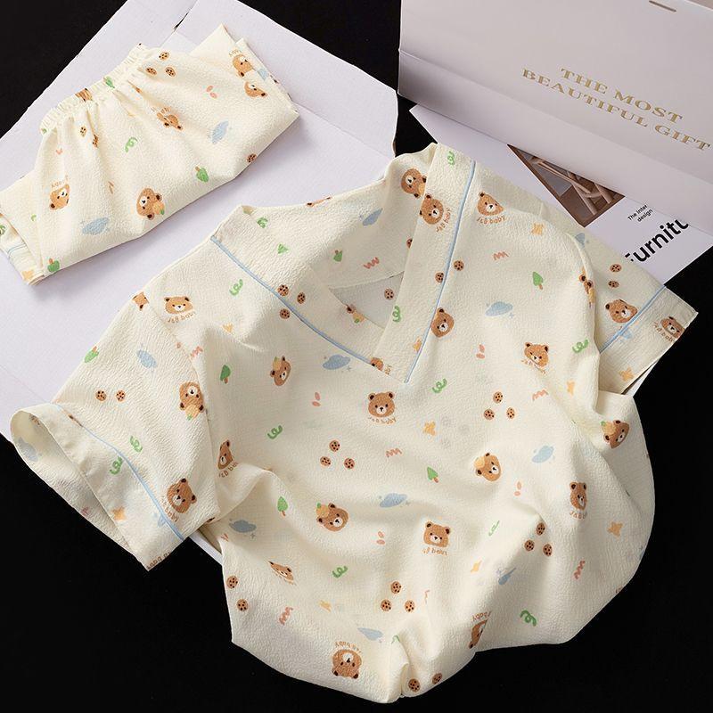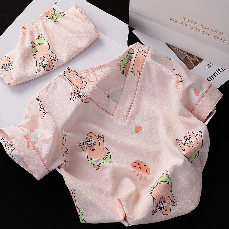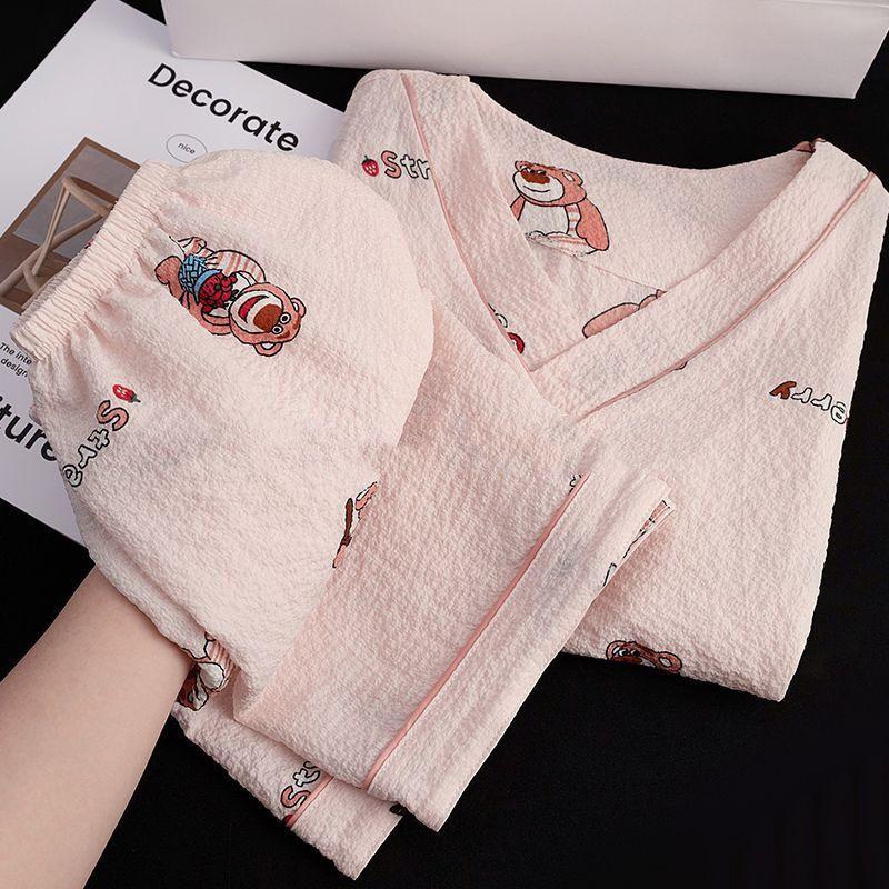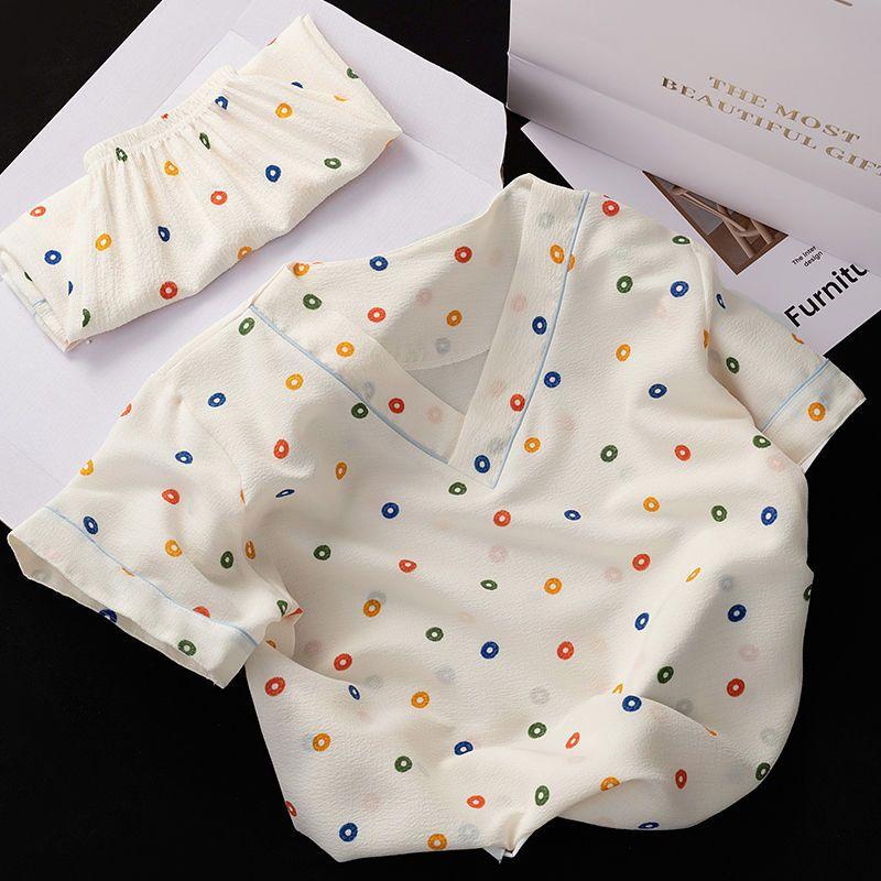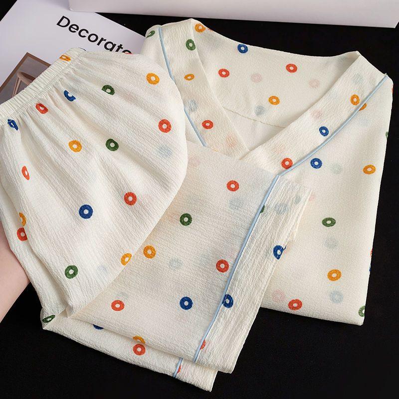 Pijama de tela Zou de algodón con burbujas para mujer, pantalones cortos de verano de manga corta, cuello en V fino, traje de verano para el hogar para estudiantes
