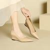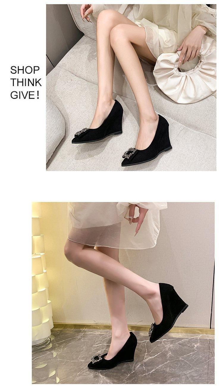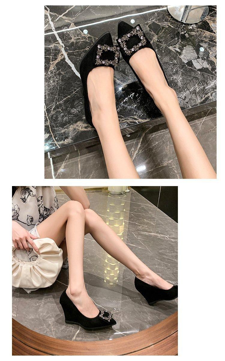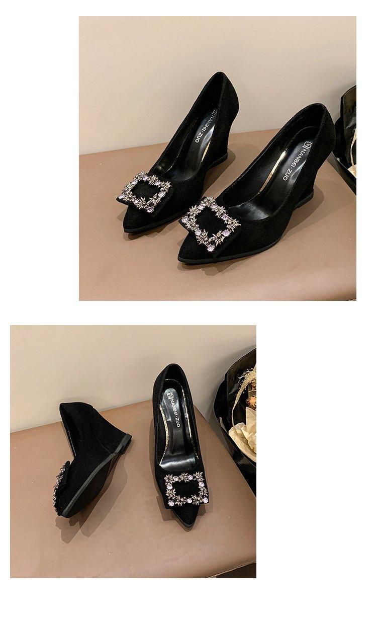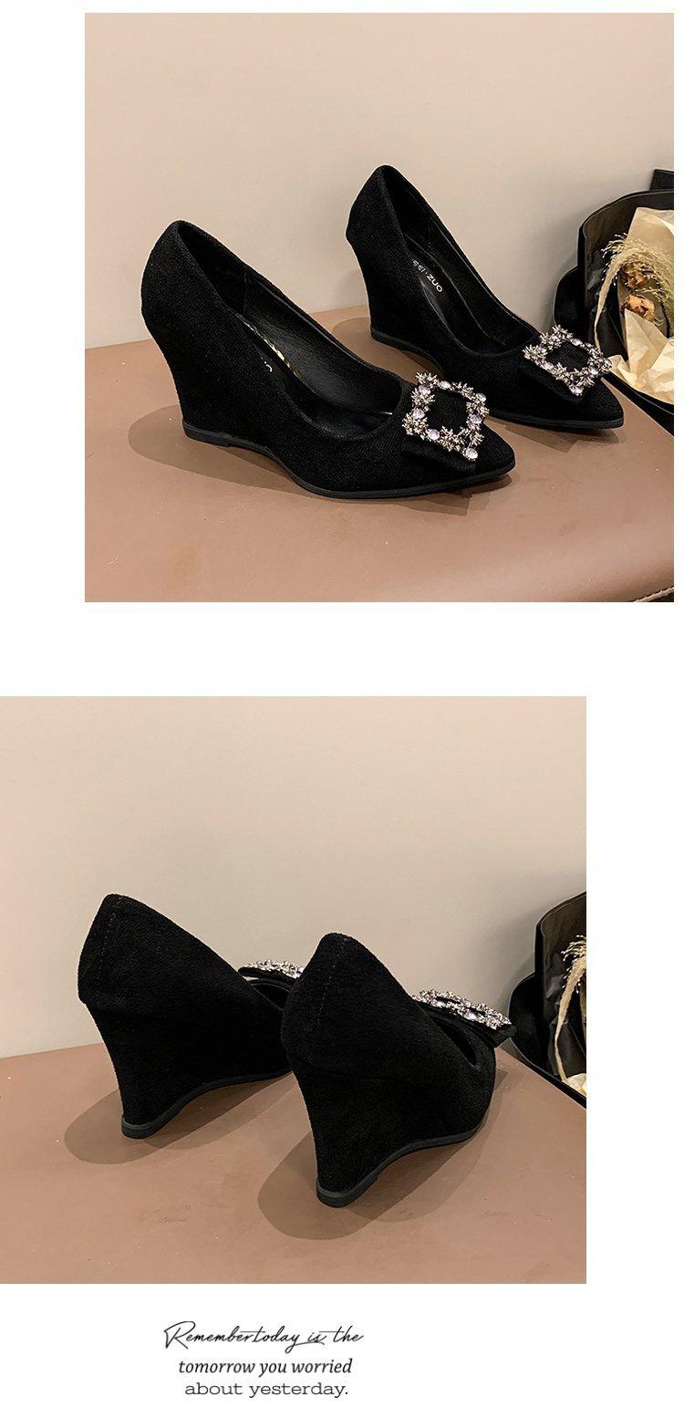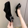 Zapatos de cuña negros con punta alta para mujer, primavera y verano 2024, nuevos zapatos bajos con hebilla cuadrada y diamantes de imitación.