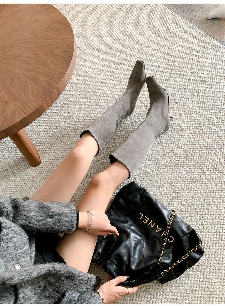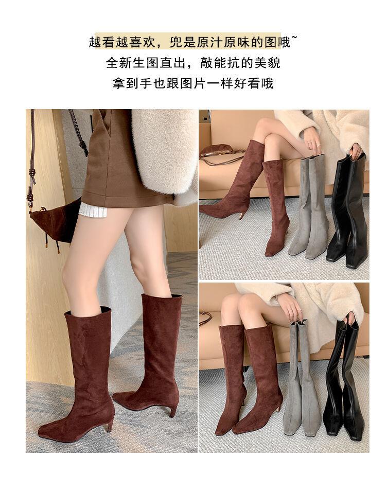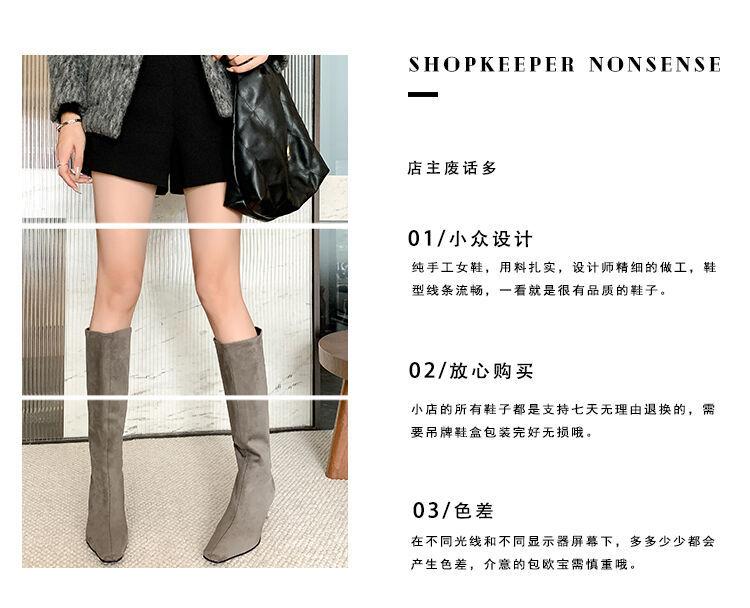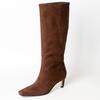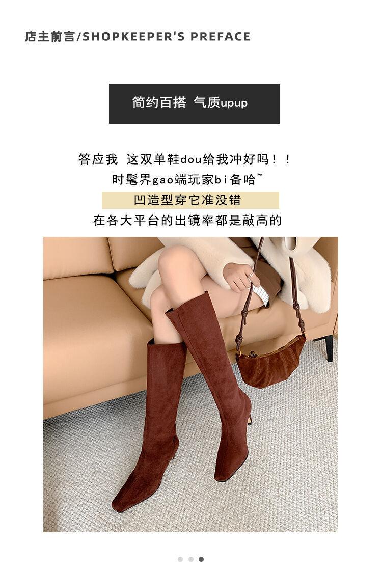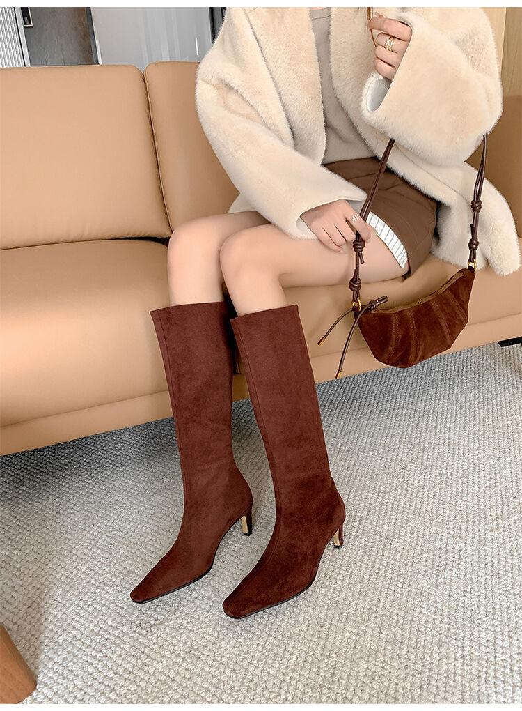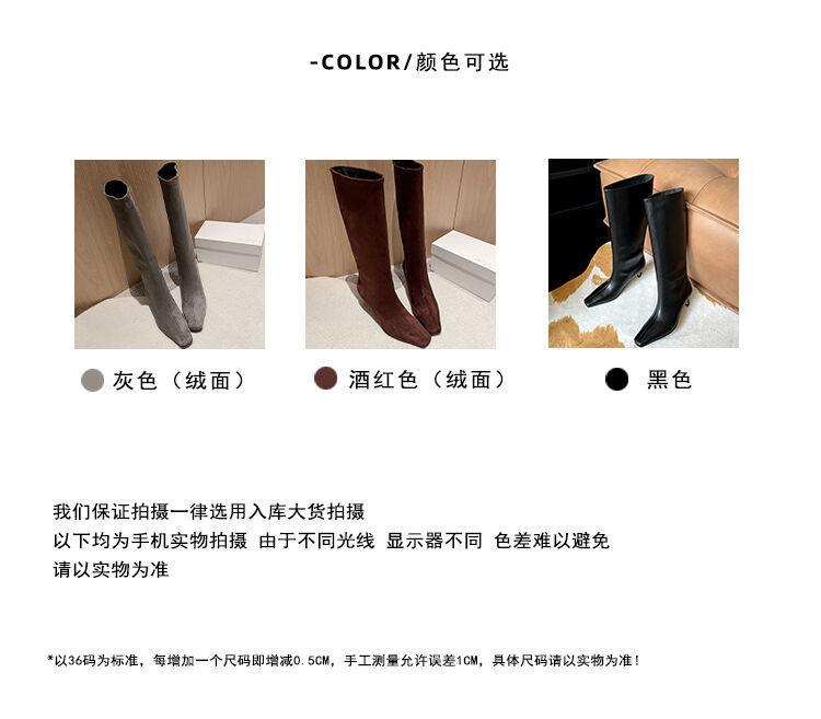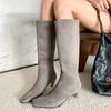 Botas de caballero elegantes, sencillas y cómodas, de ante cuadrado pequeño y tacón grueso, hasta la rodilla, para invierno 2024.