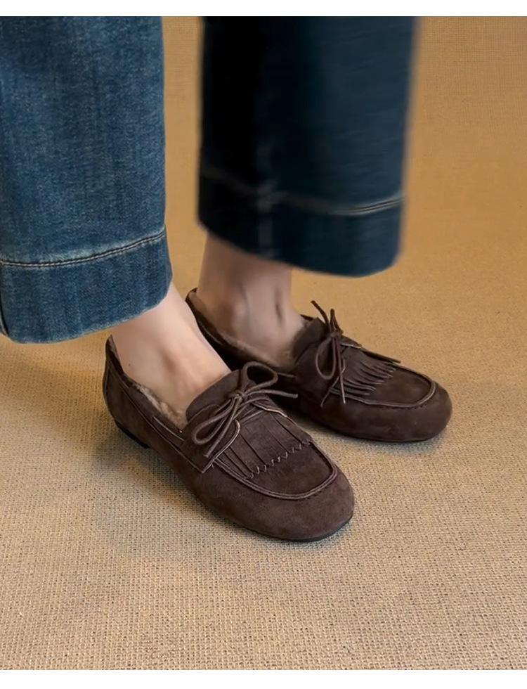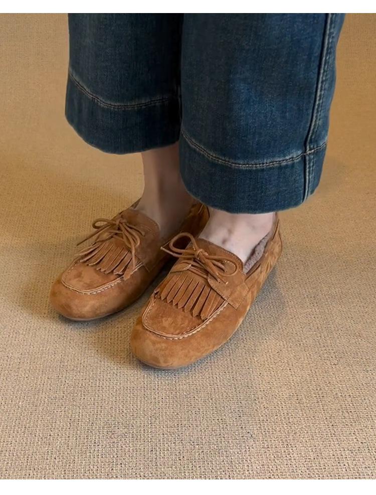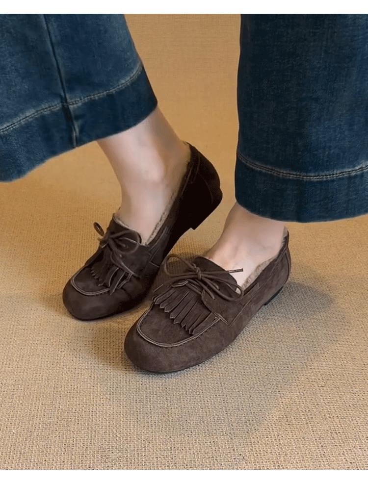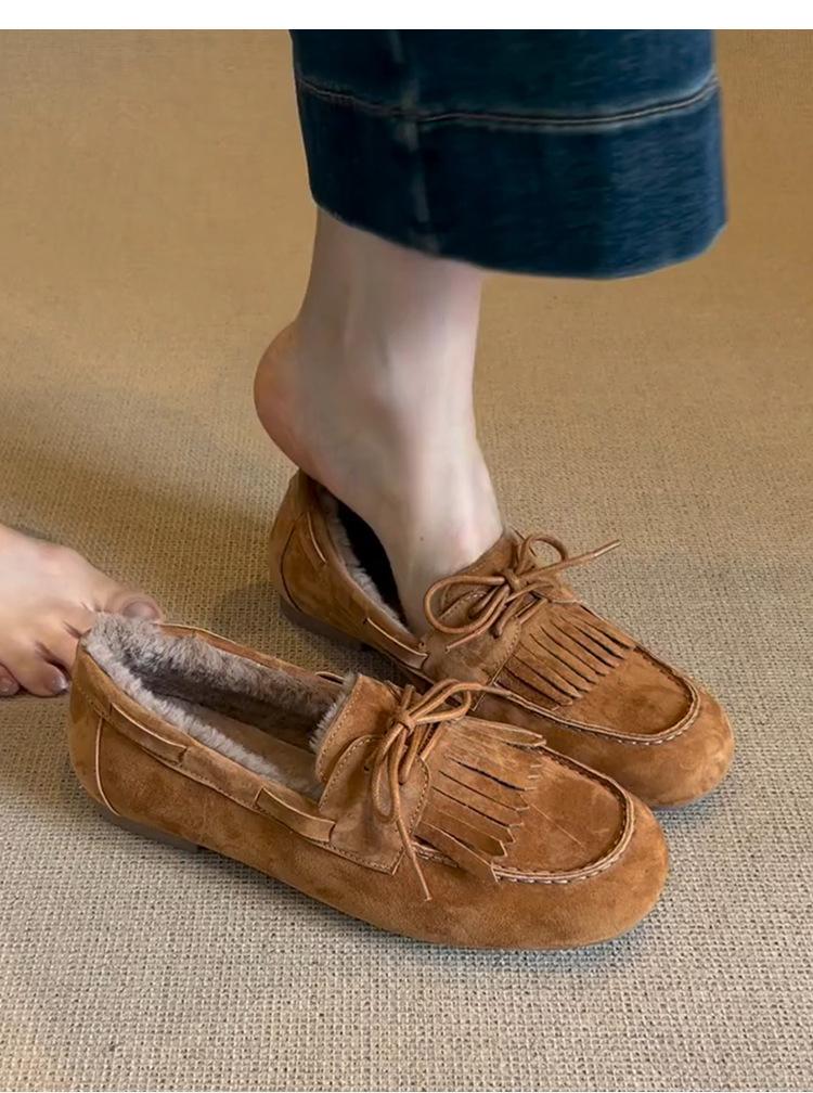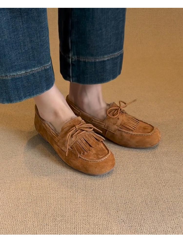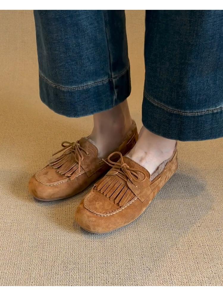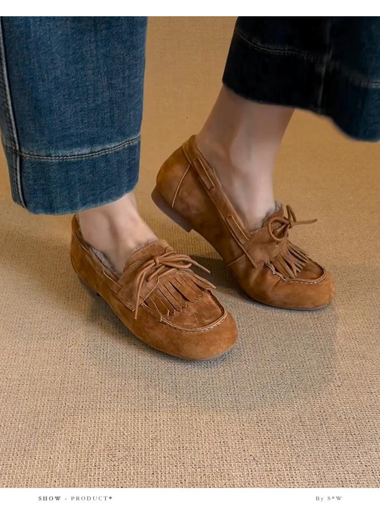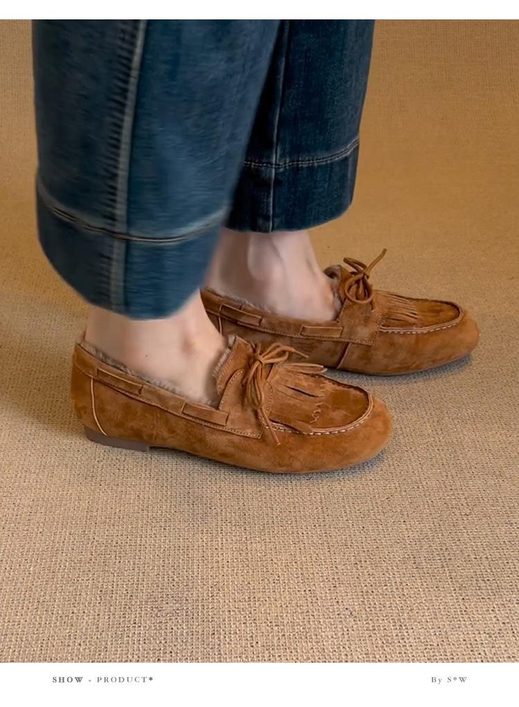 Mocasines planos con borlas y cordones de punta redonda para mujer, estilo vintage, sin cordones y forrados de polar.