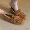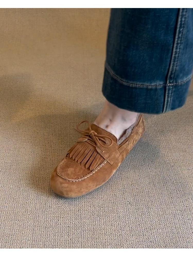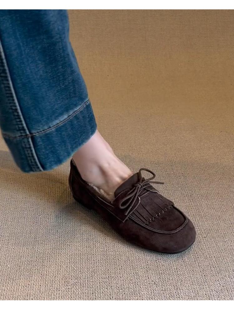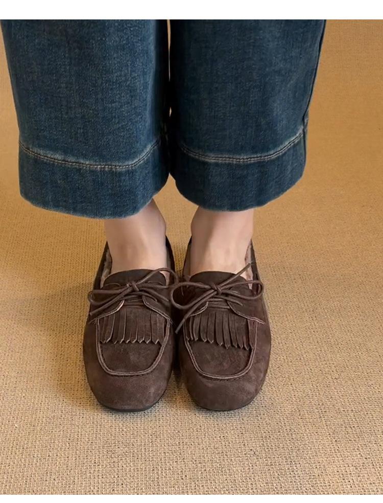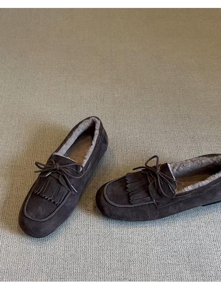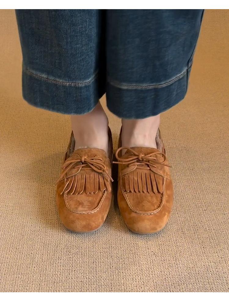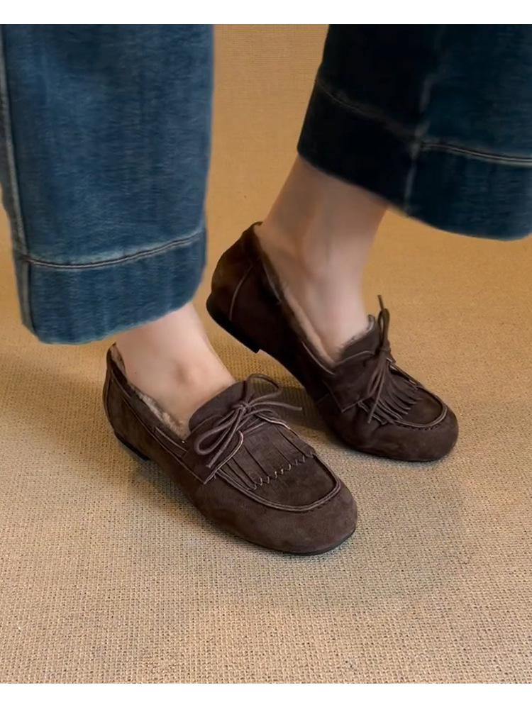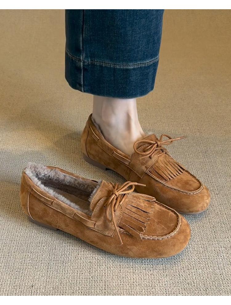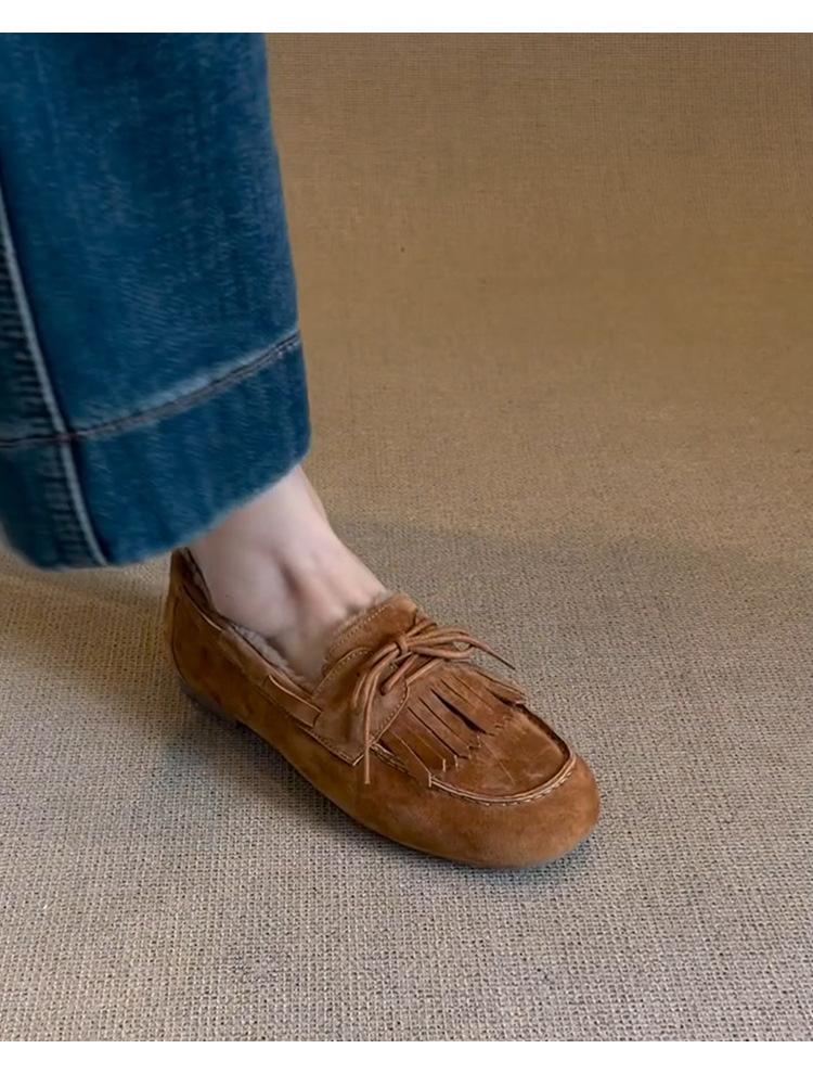 Mocasines planos con borlas y cordones de punta redonda para mujer, estilo vintage, sin cordones y forrados de polar.
