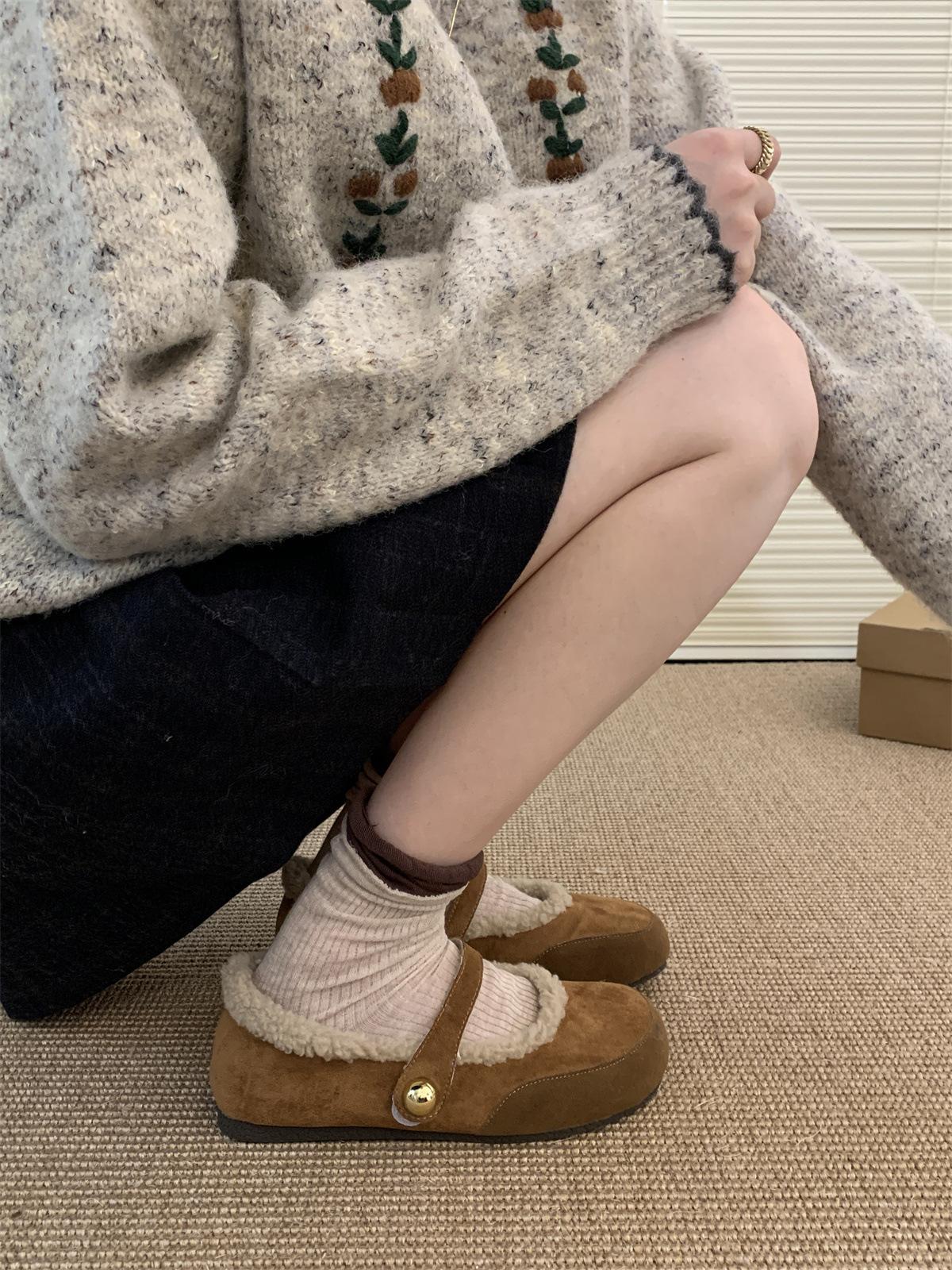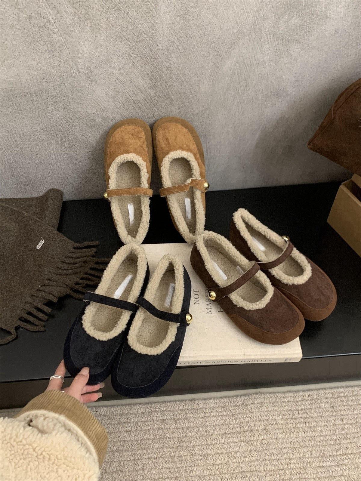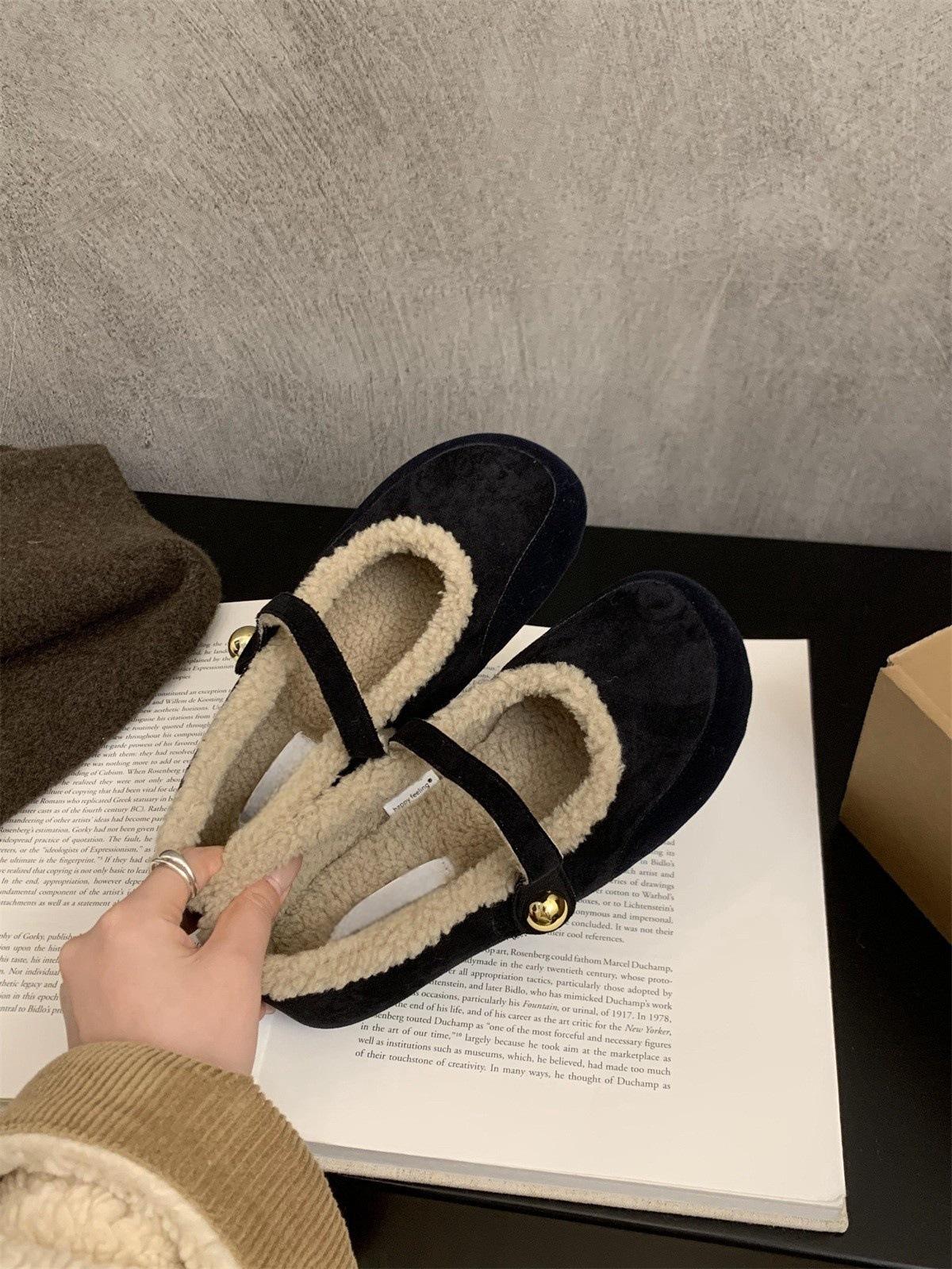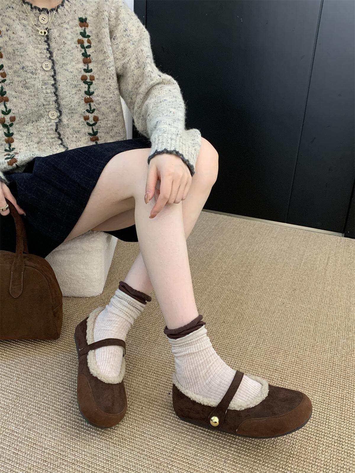Zapatos Mary Jane vintage Mori con forro polar para mujer, 2024, punta redonda, ante de cordero y algodón.