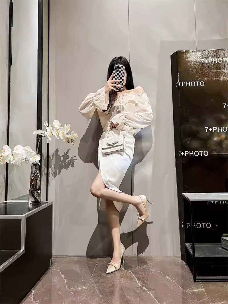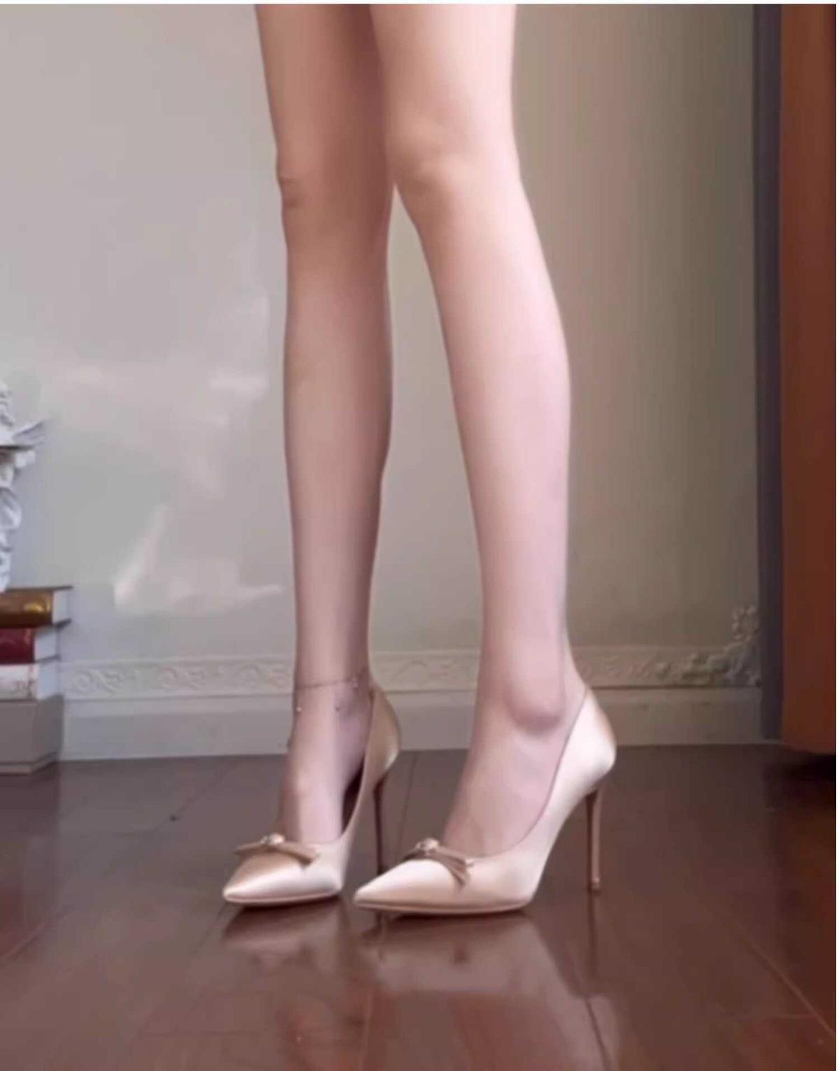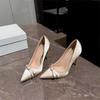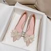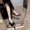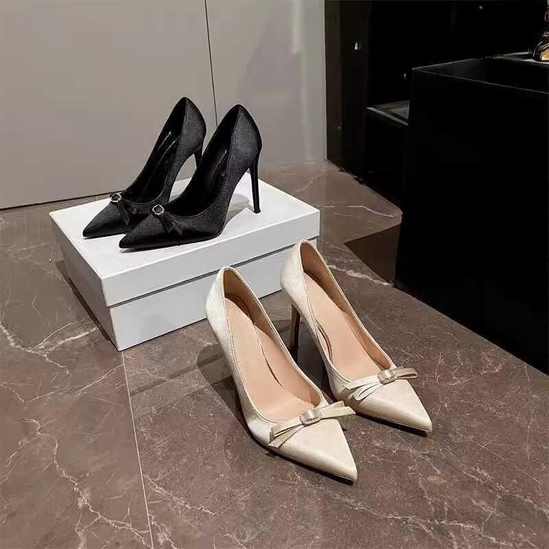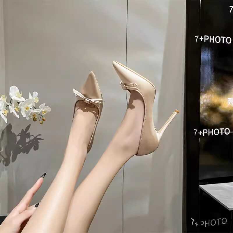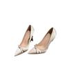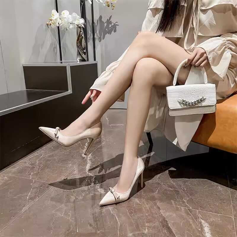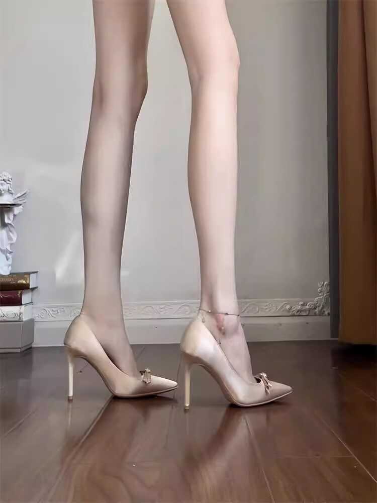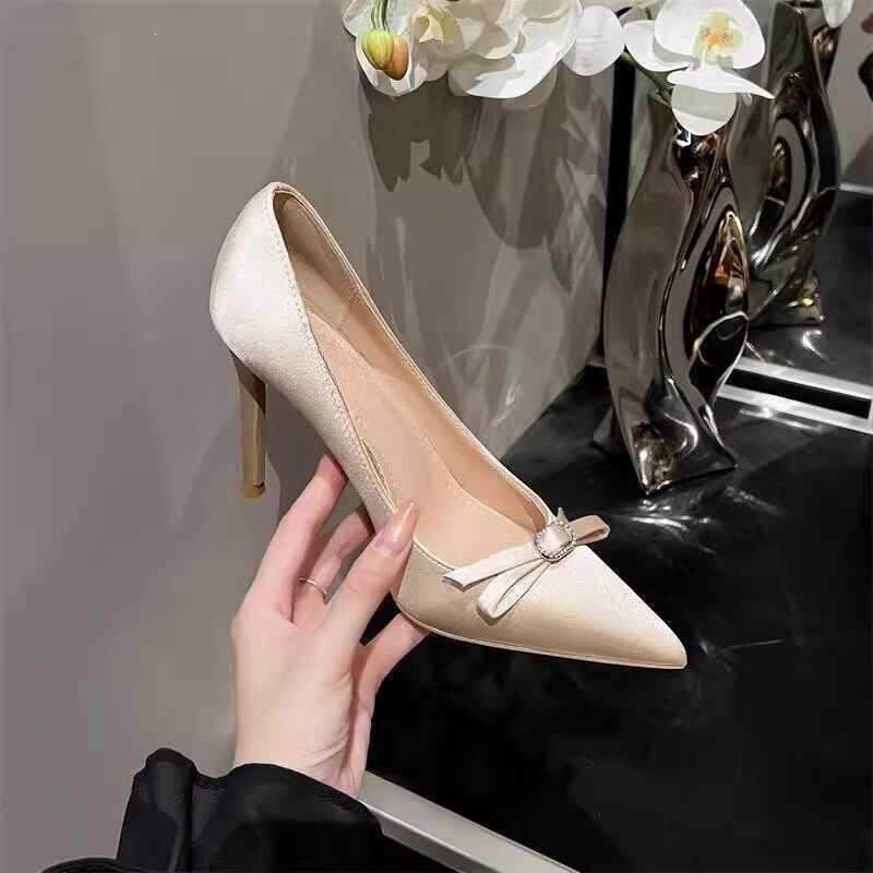 Otoño 2024, recién llegado, zapatos de tacón alto francés con punta color champán para mujer, zapatos de tacón de aguja con lazo, zapatos de boda para dama de honor