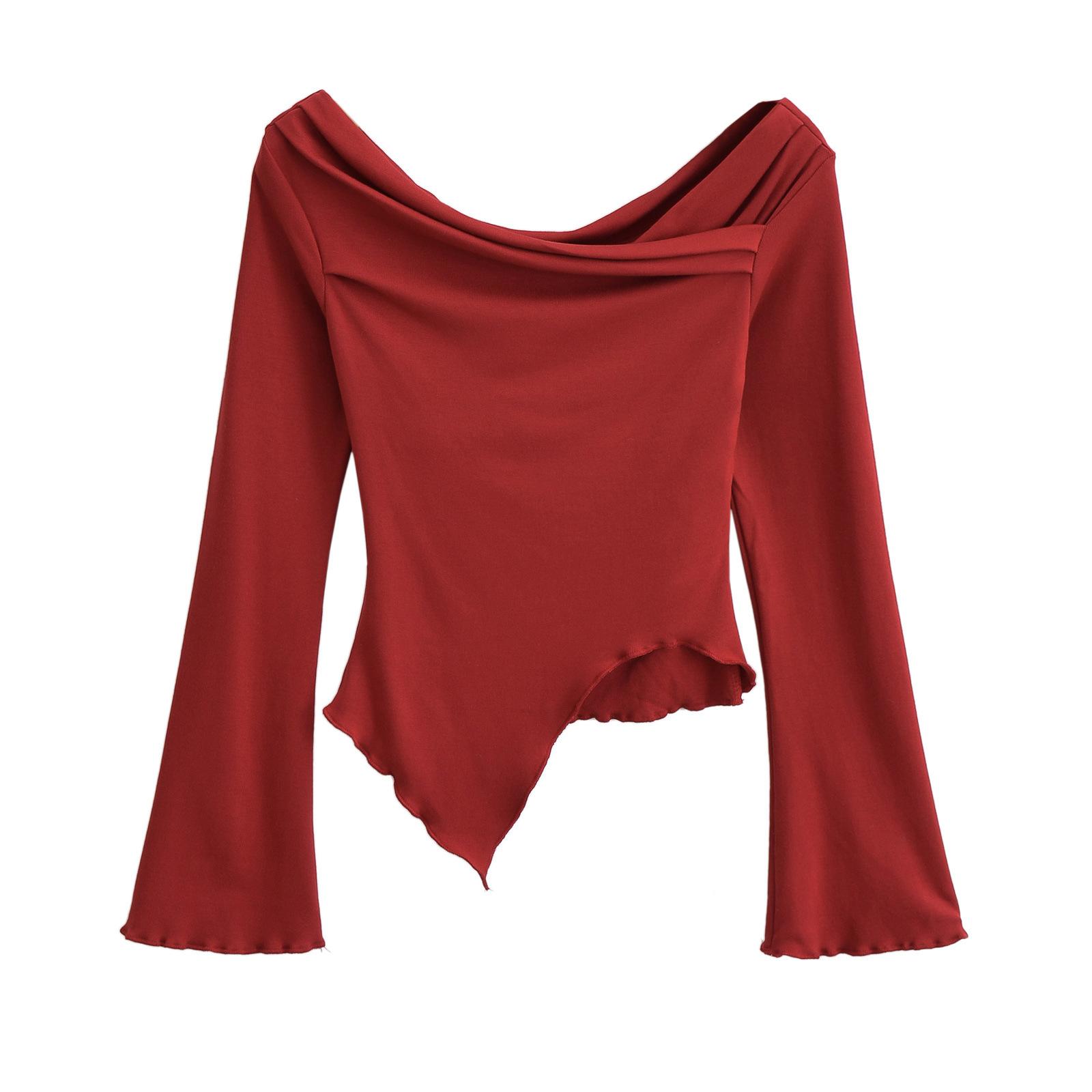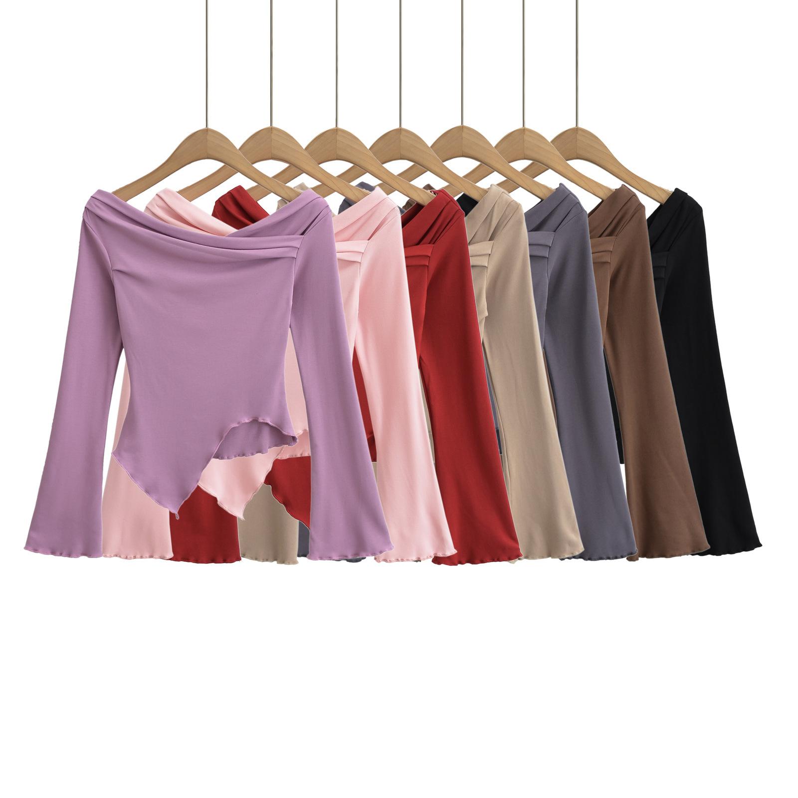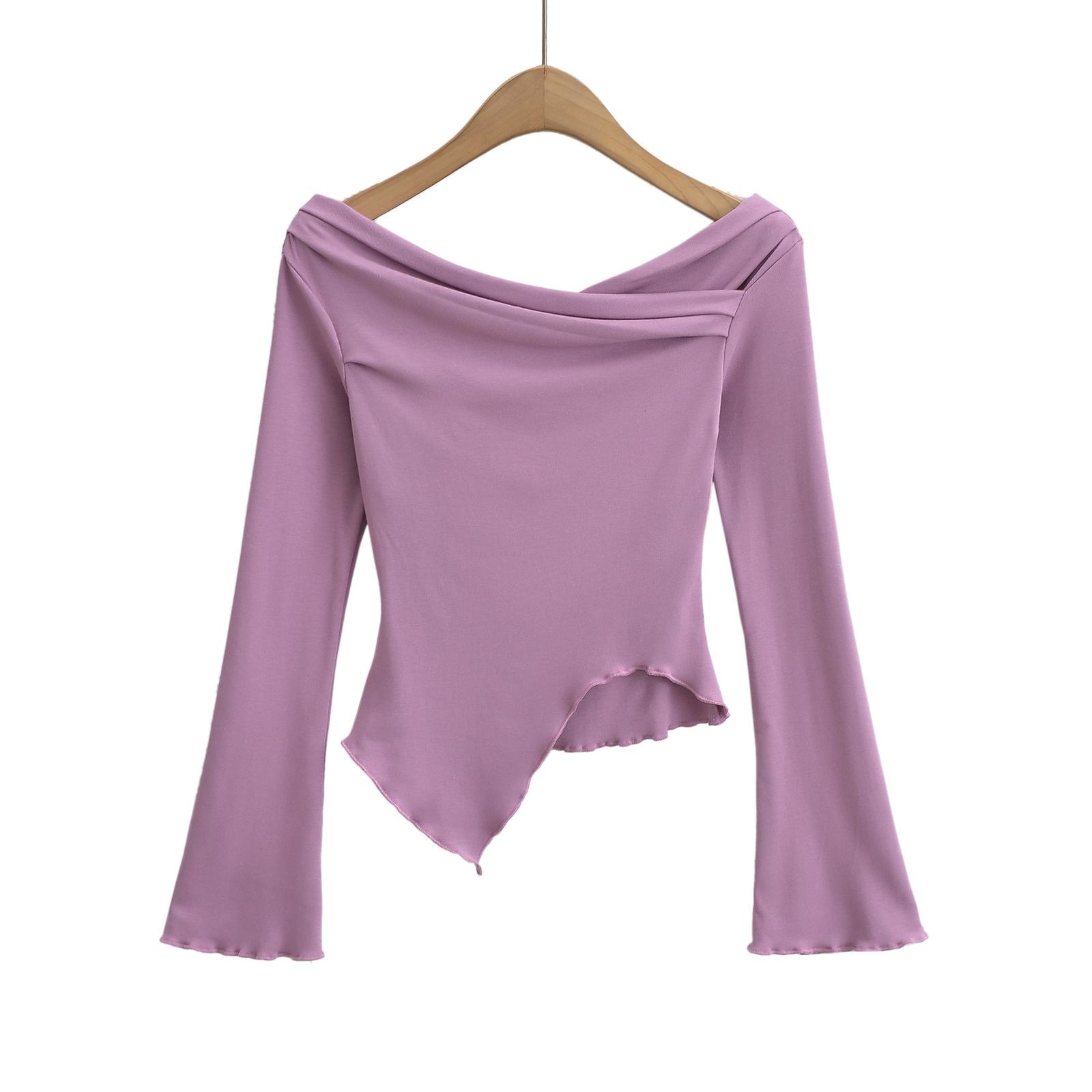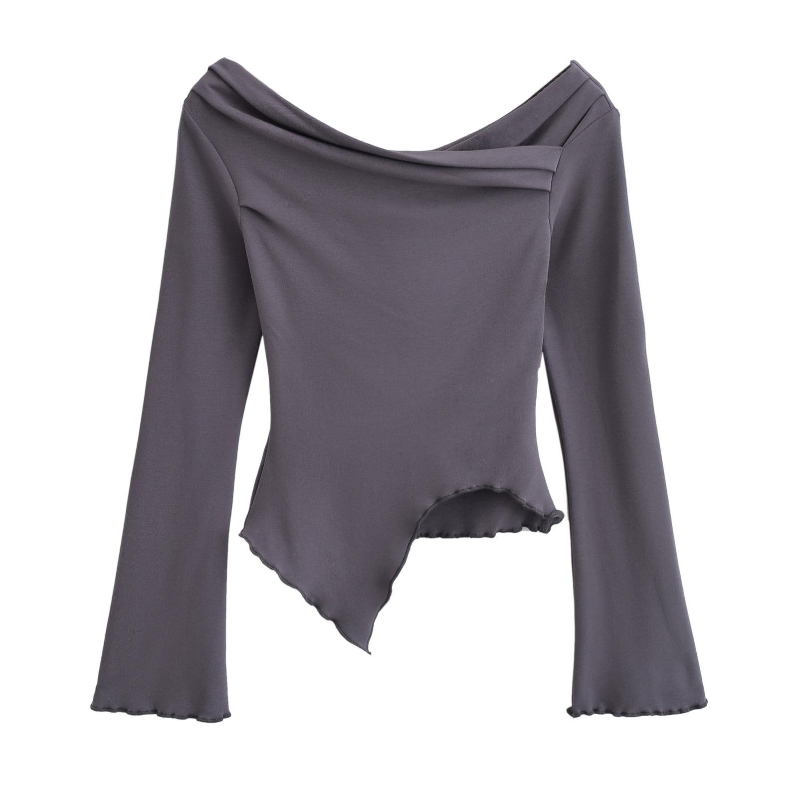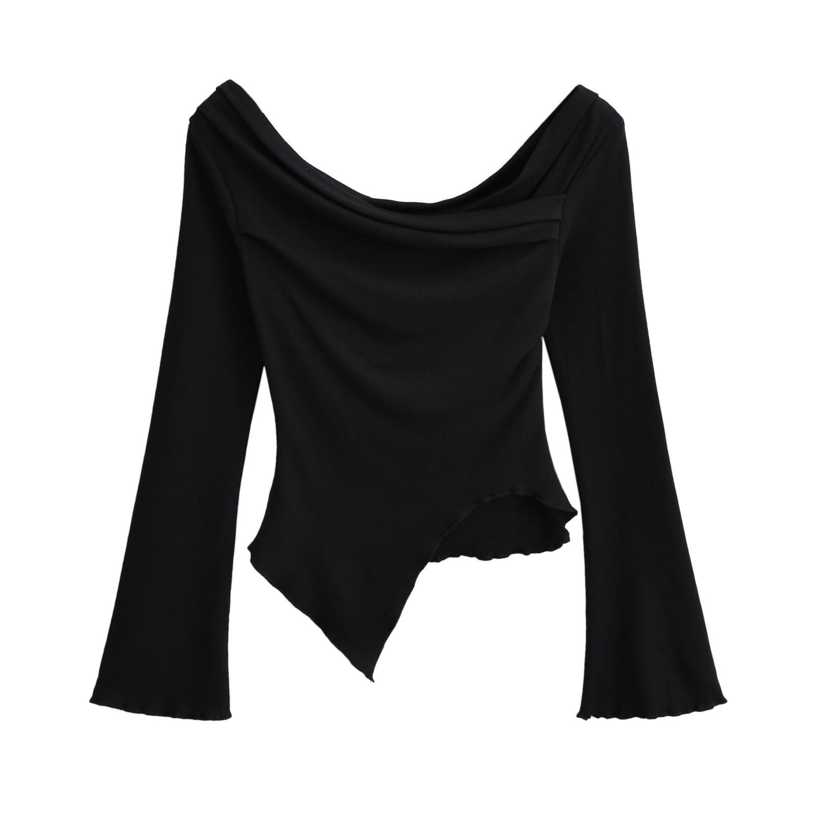 Camiseta de manga larga plisada con hombros descubiertos para mujer, top irregular ajustado con hombros descubiertos, otoño e invierno de 2023