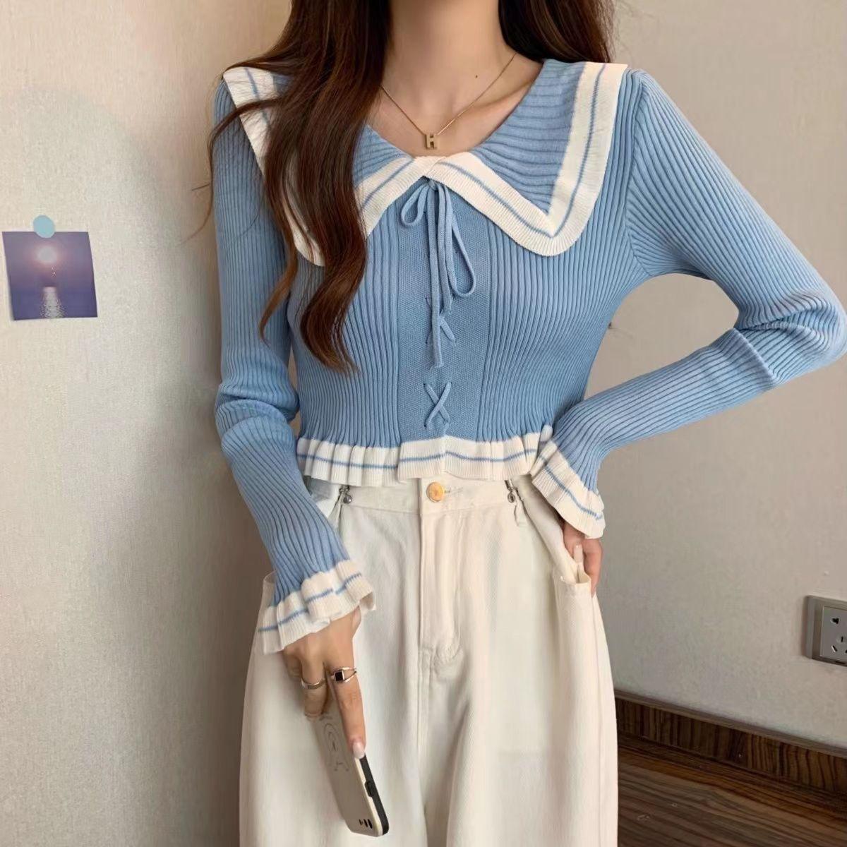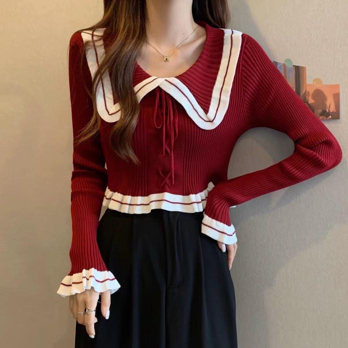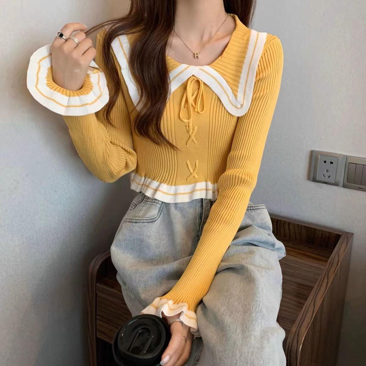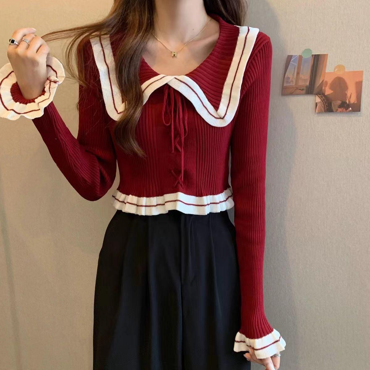 Suéter básico de manga larga con cuello de muñeca estilo francés para mujer Primavera y Otoño Nuevo suéter pequeño corto ajustado