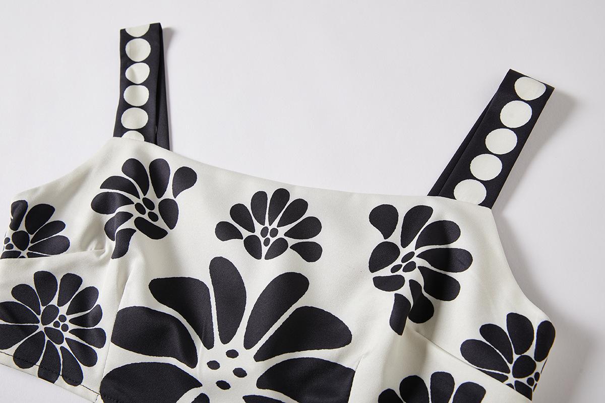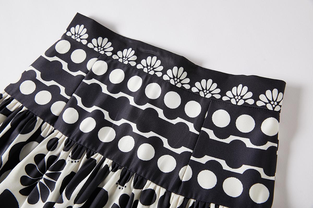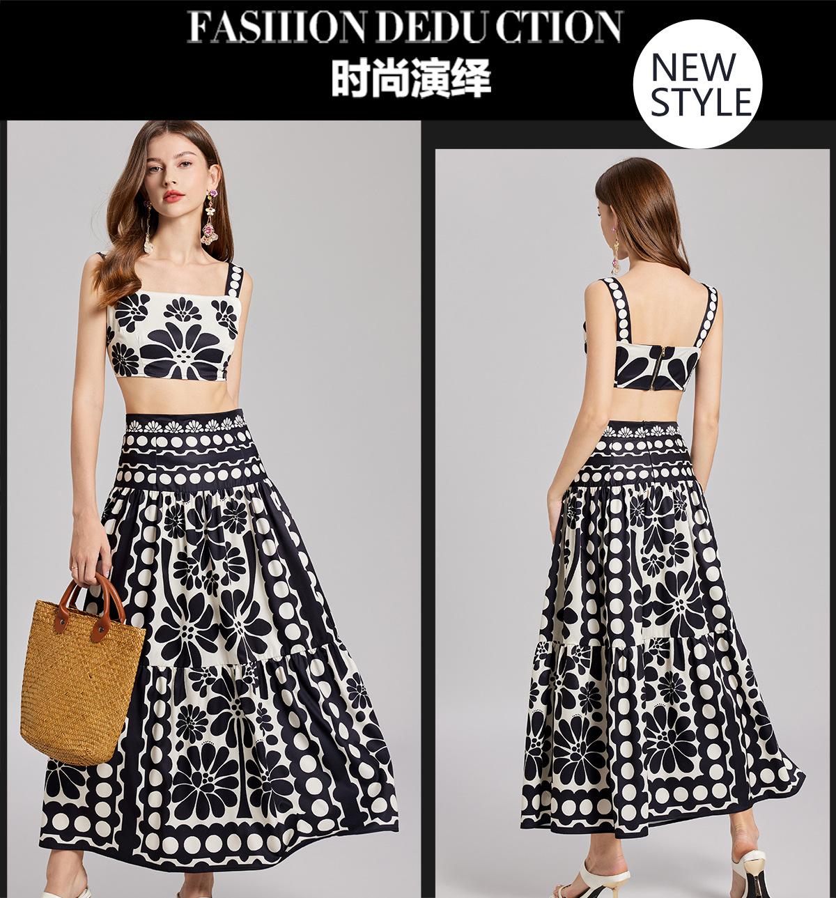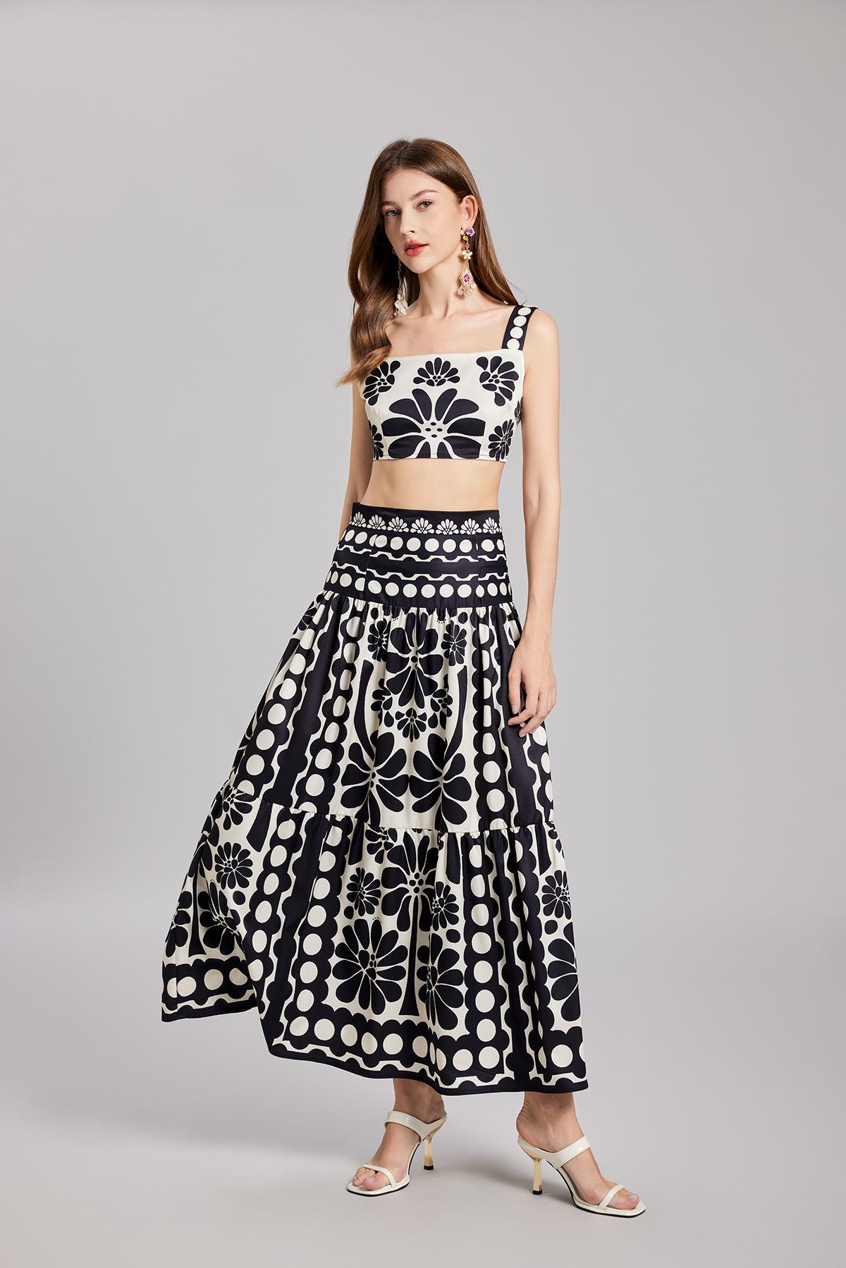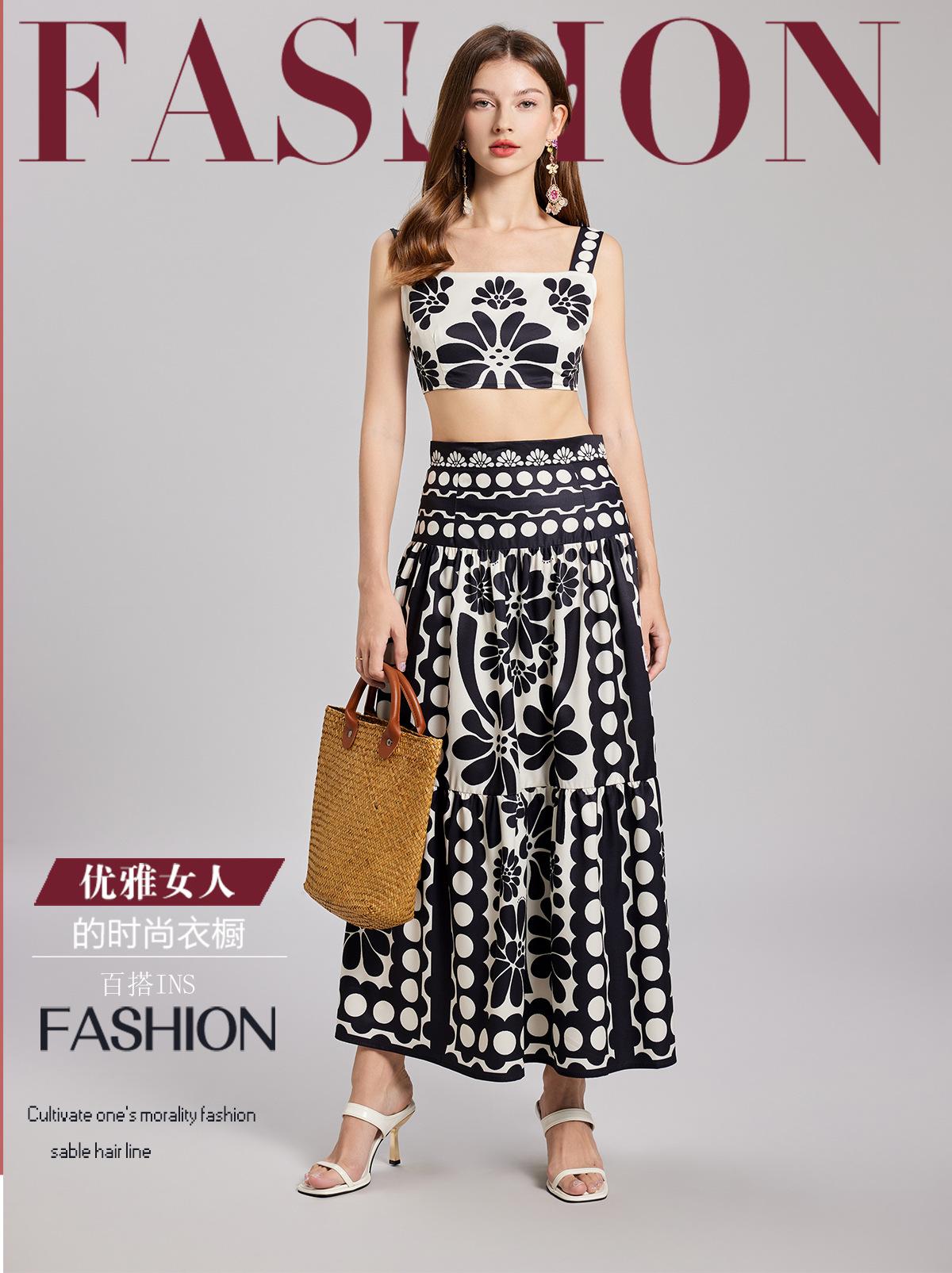 Traje de Moda Vacacional Estilo Europeo y Americano Camisola Floral Clásica en Blanco y Negro + Falda de Cintura Alta Conjunto de Dos Piezas