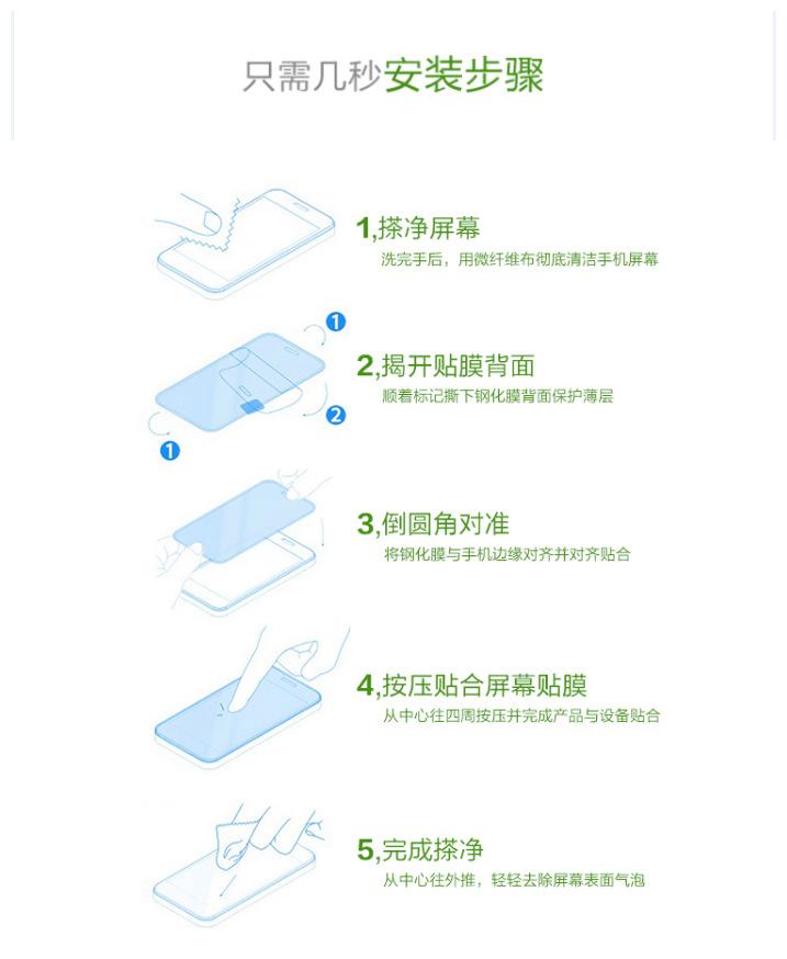 Fácil de usar, sin burbujas. La transmitancia de luz de la pantalla es del 98 %. Previene el daño de las ondas electrónicas al cuerpo humano. No afecta el uso de fundas ni otros accesorios para teléfonos móviles.