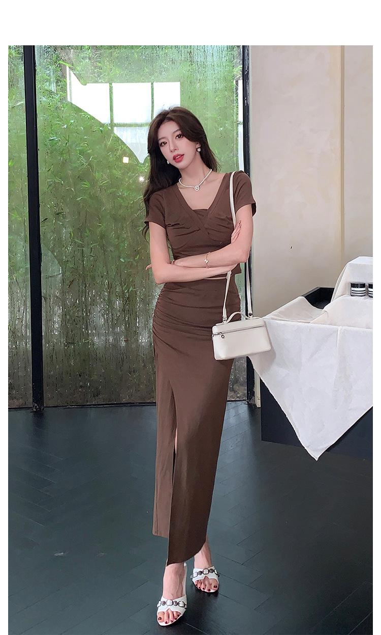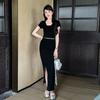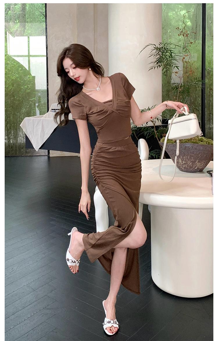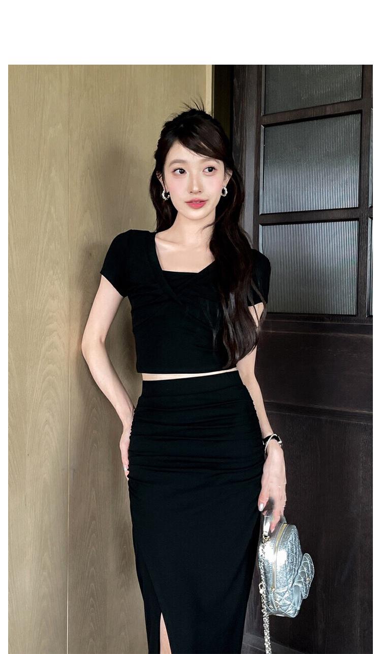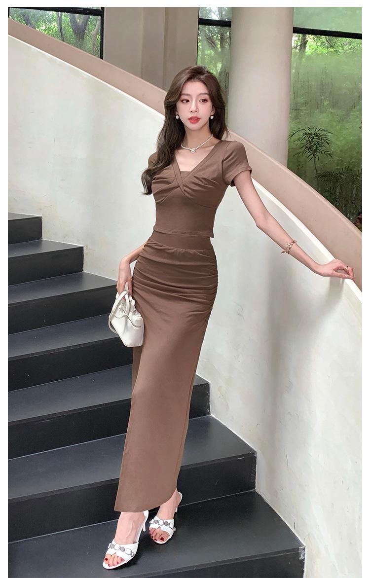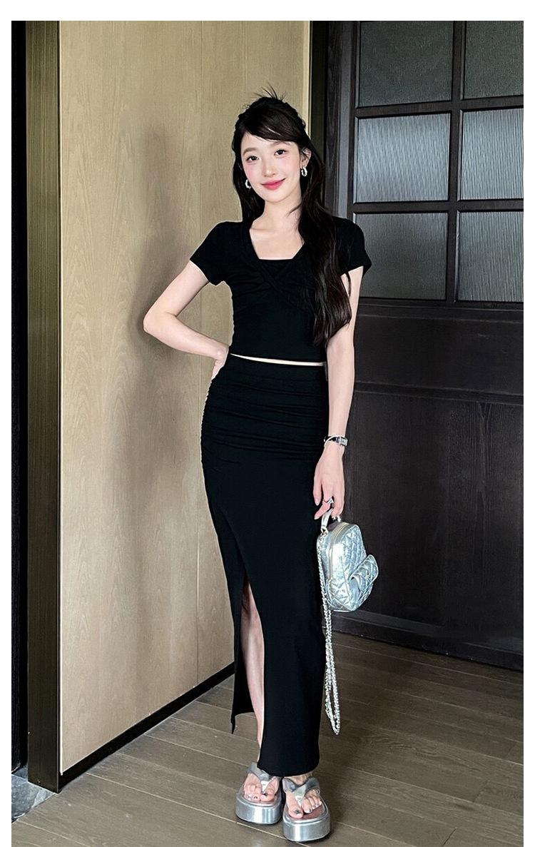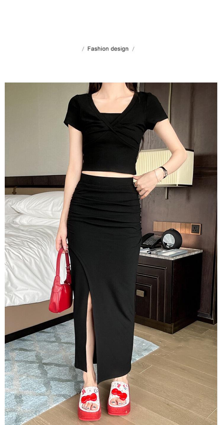 Foto real dulce genial chica sexy viento de deseo puro camiseta manga corta abertura lateral plisada cadera falda larga conjunto de dos piezas ropa de mujer