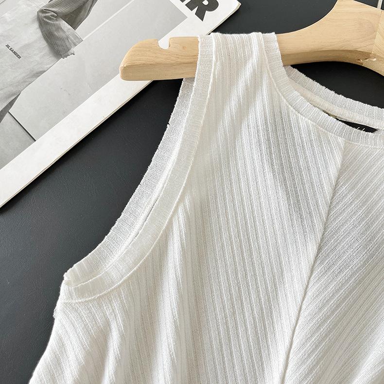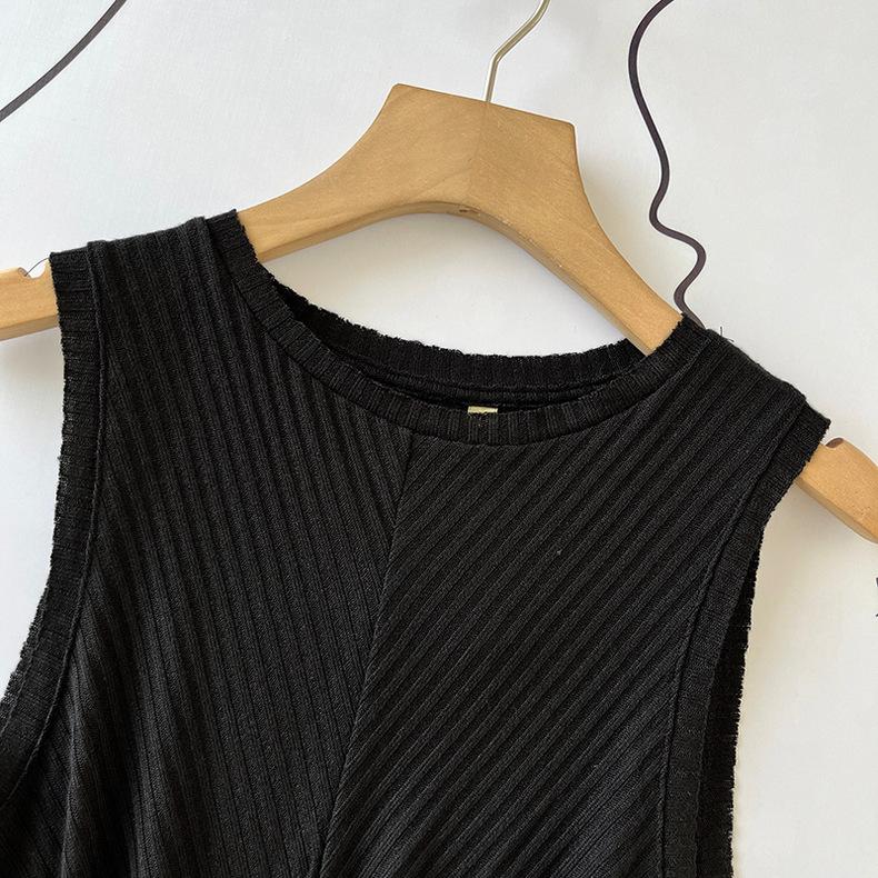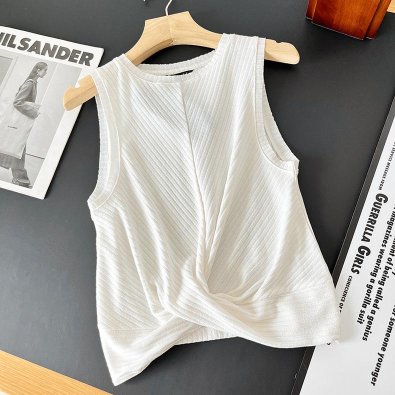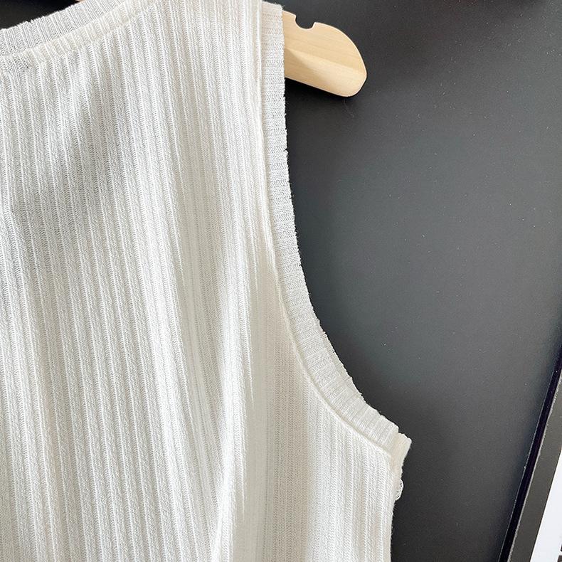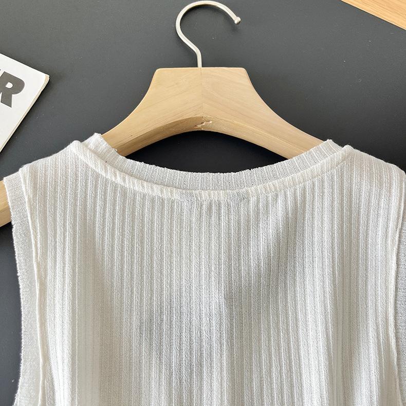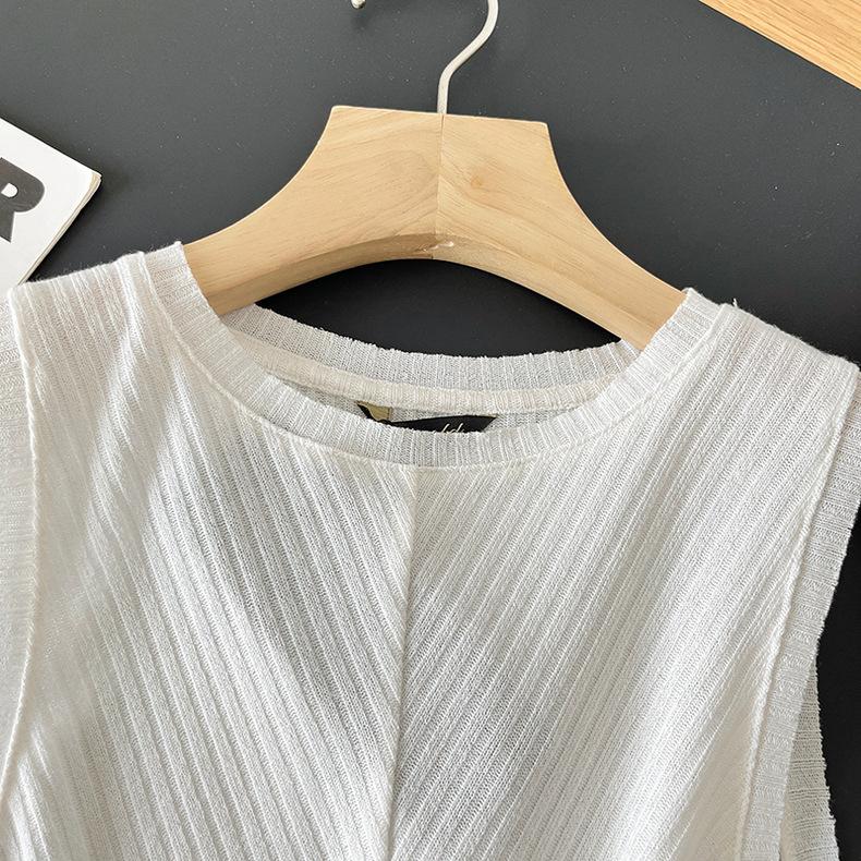 Top Corto Ligero de Lino Plisado de Cuello Redondo sin Mangas Estilo Europeo y Americano 2024 Verano Nuevo Camiseta Chaleco de Color Puro para Mujer
