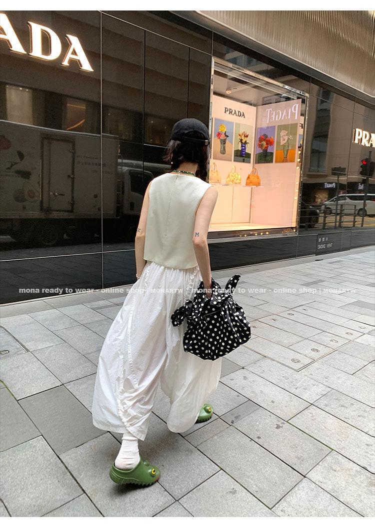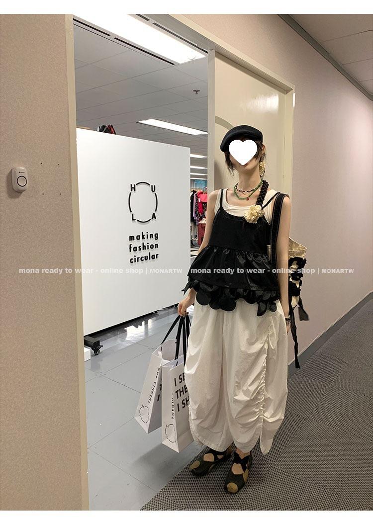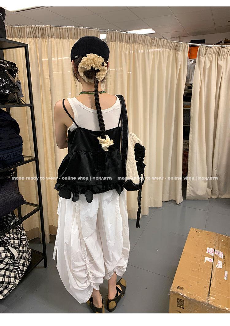 La parte delantera y la trasera están conectadas por un diseño de canal, y el cordón hecho de la tela original se inserta en el canal