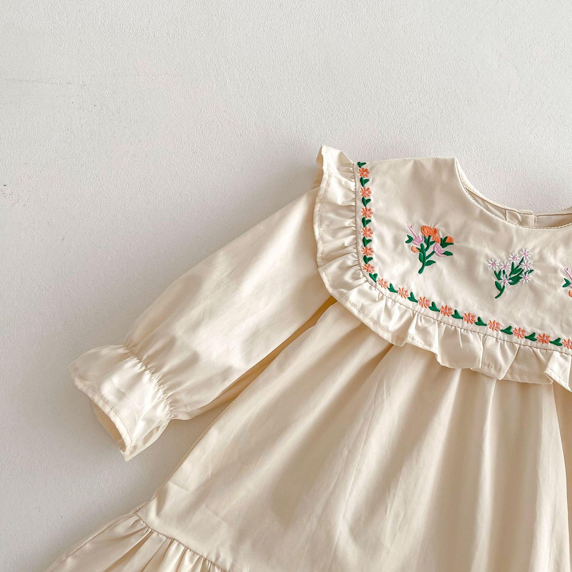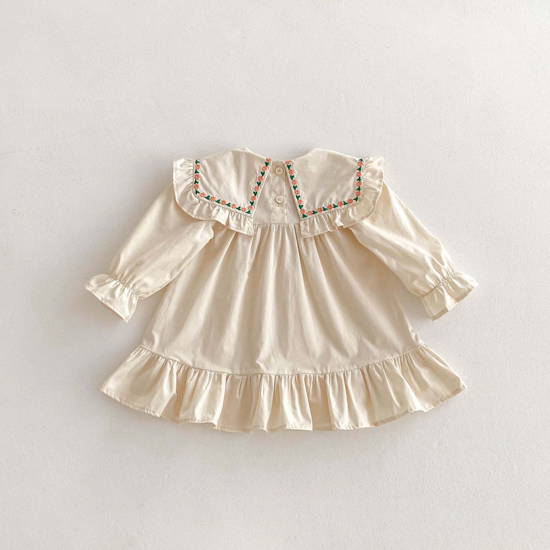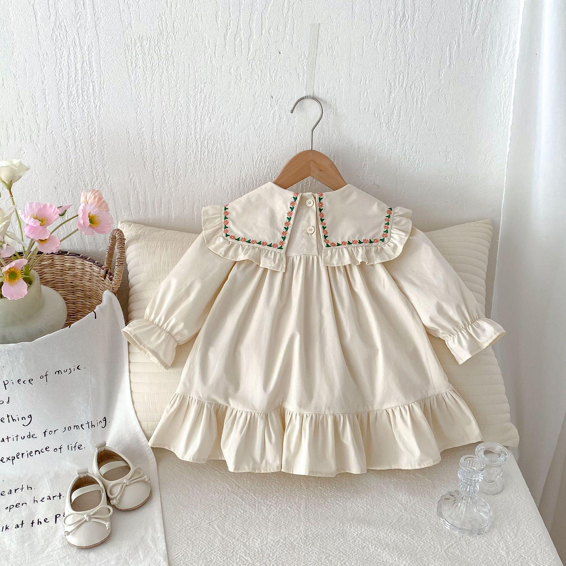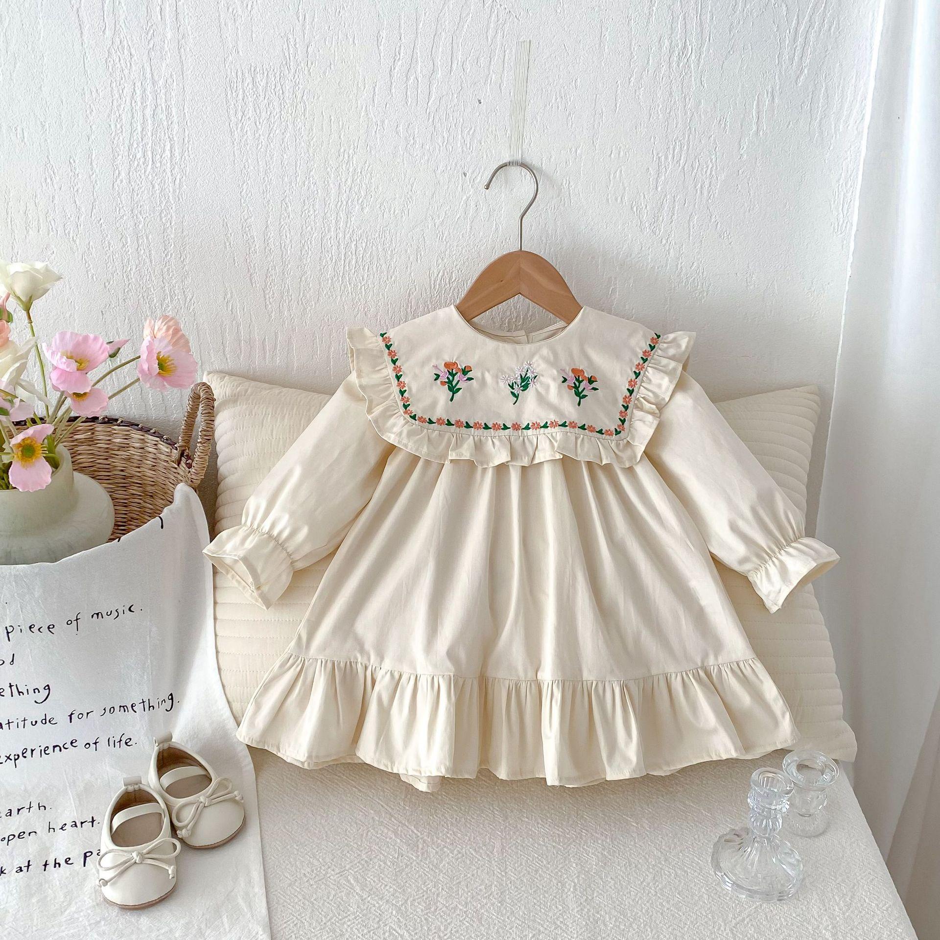 Vestido de niña primavera 2025 para niños, solapa grande, bordado con flores, volantes, manga larga, falda de princesa de algodón