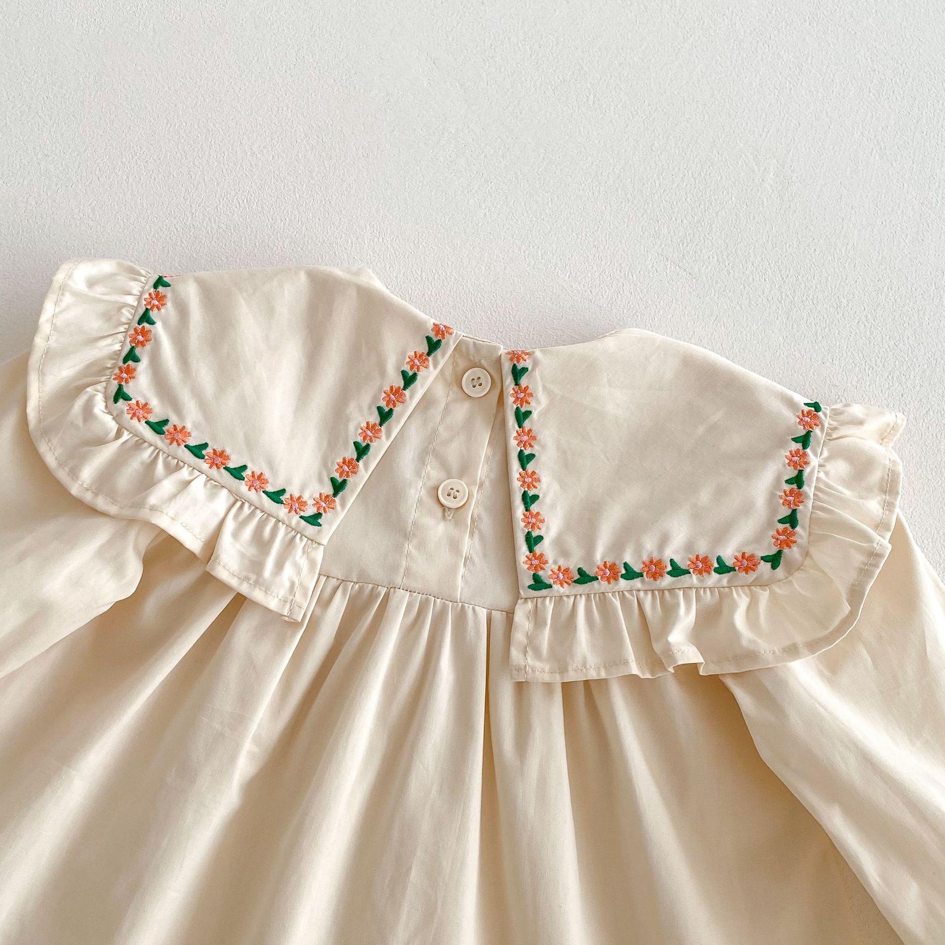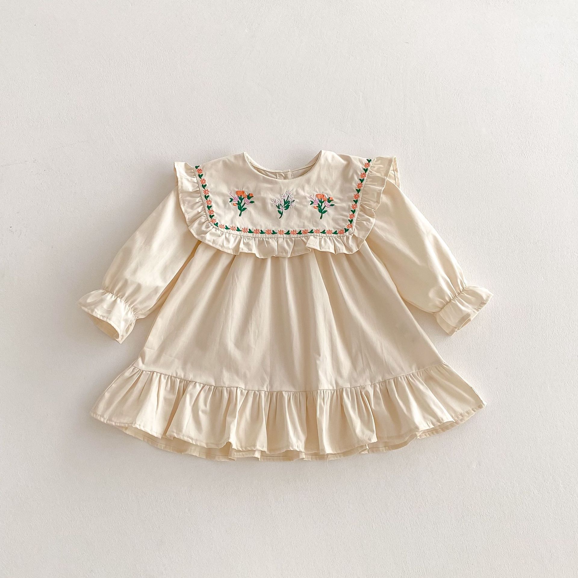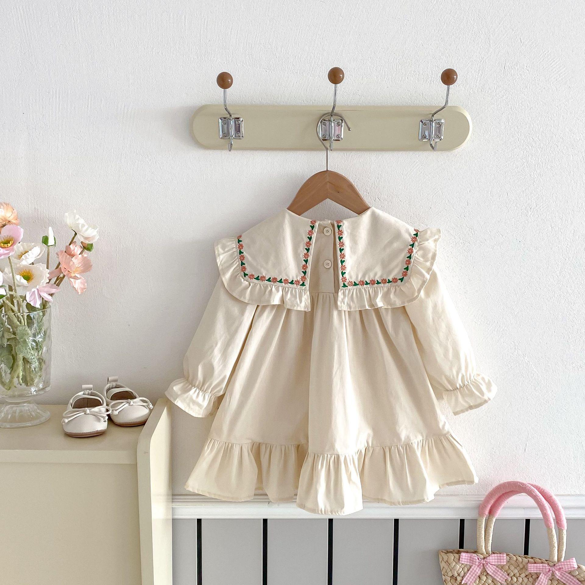 Vestido de niña primavera 2025 para niños, solapa grande, bordado con flores, volantes, manga larga, falda de princesa de algodón