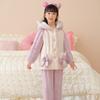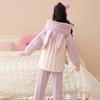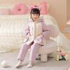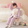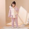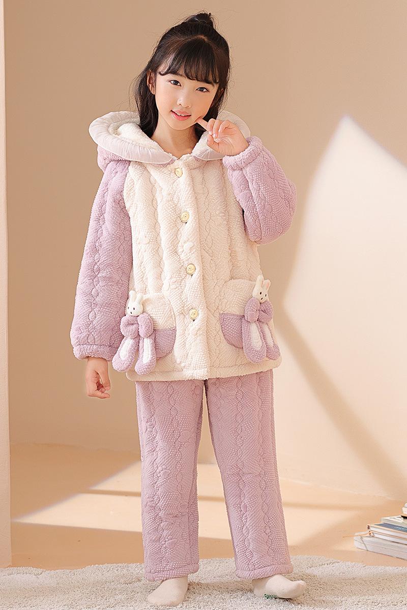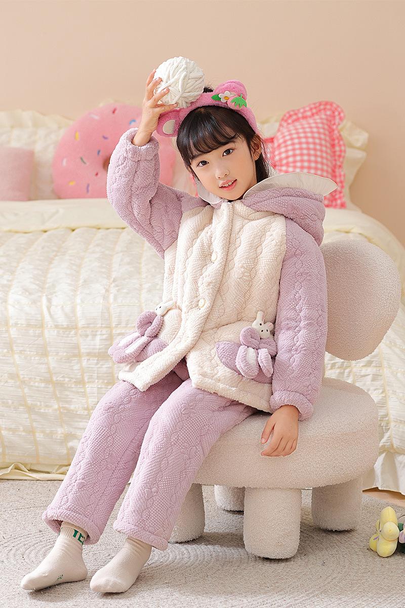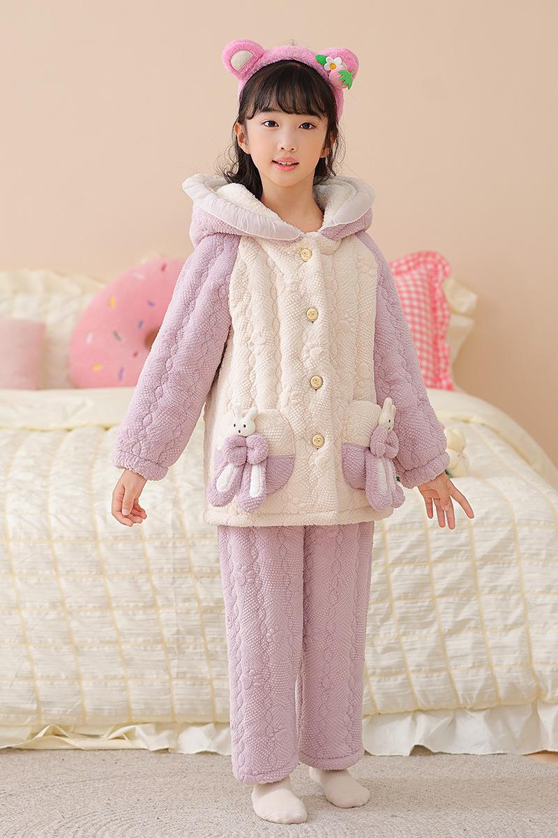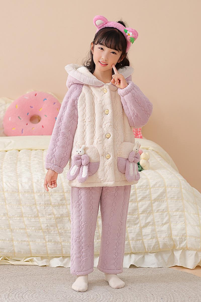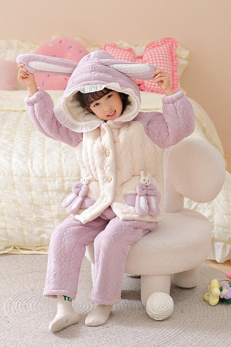 Pijama de invierno acolchado de tres capas con orejas de conejo y capucha para niña pequeña, color morado, de franela con forro polar, ropa de casa gruesa.