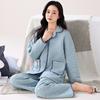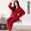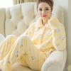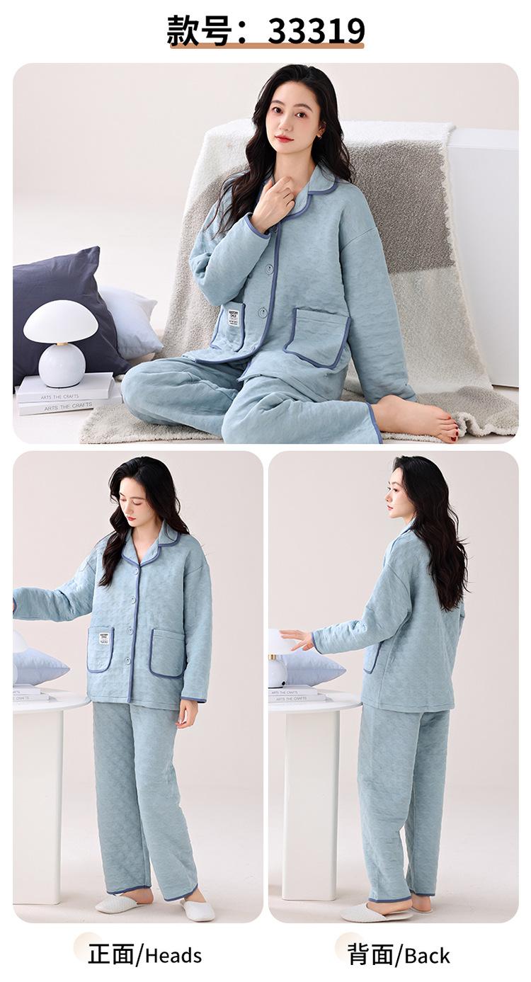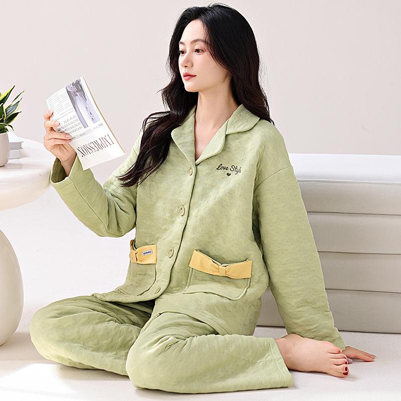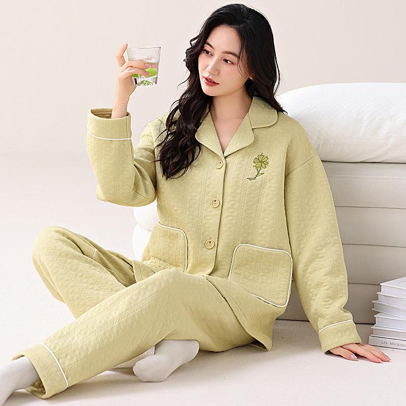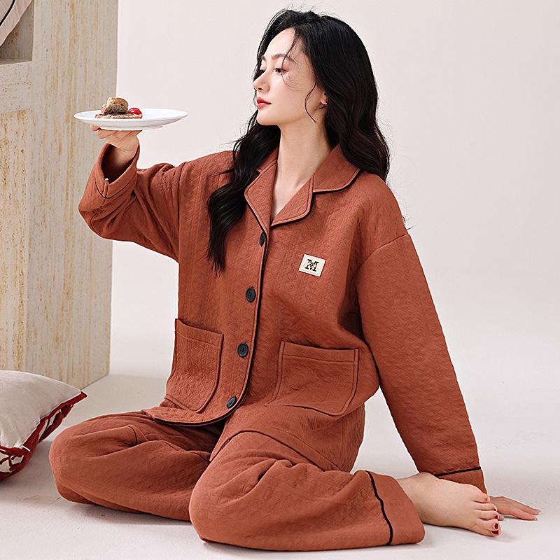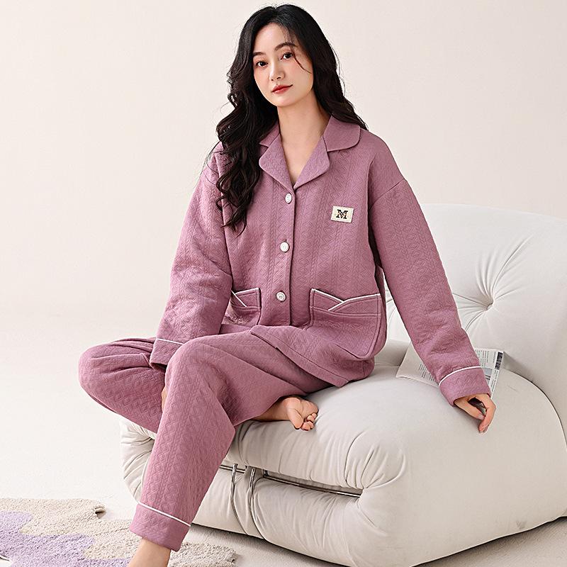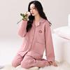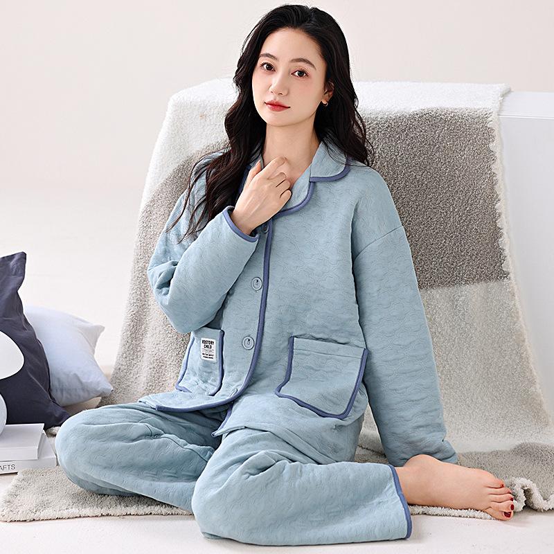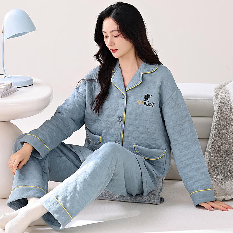 Pijama de algodón tipo sándwich para mujer, de manga larga, para otoño e invierno, grueso y cálido, para el hogar, cárdigan con solapa, traje de talla grande