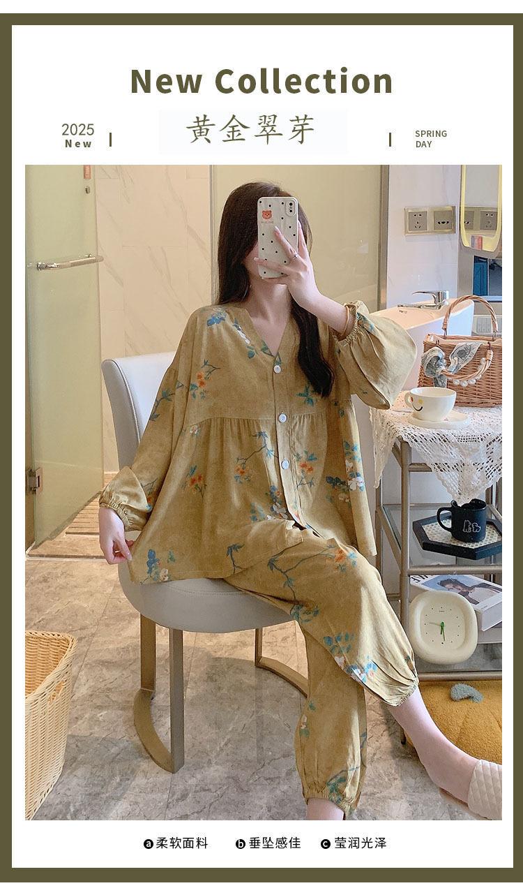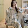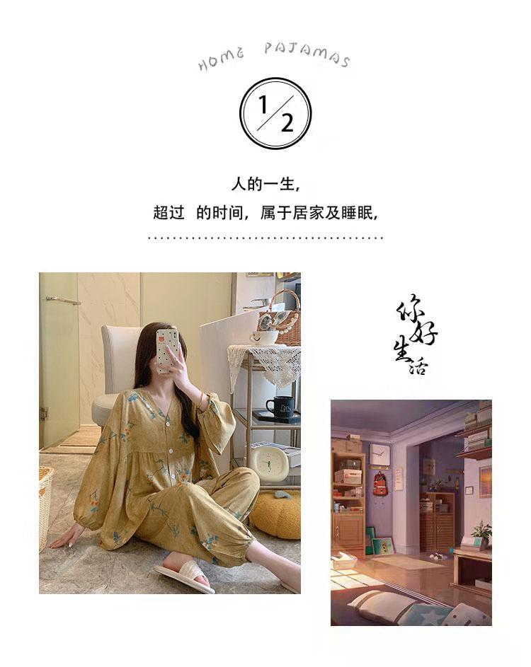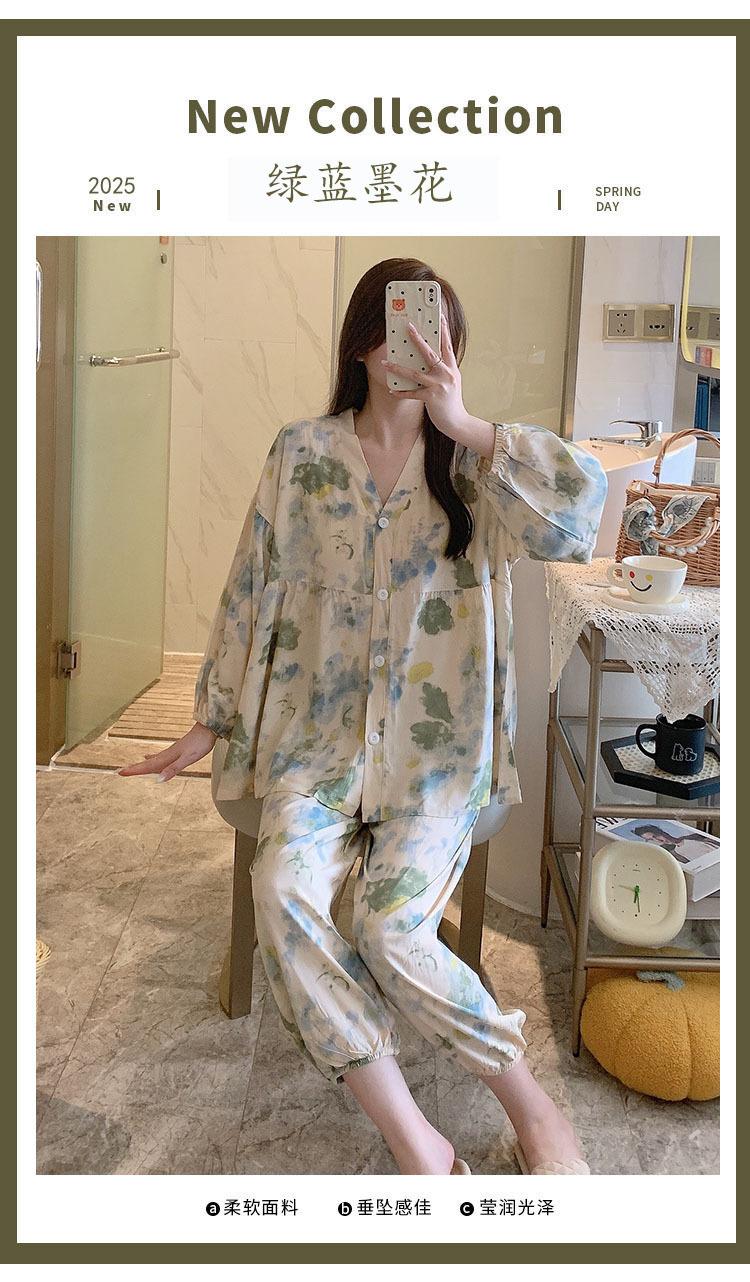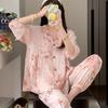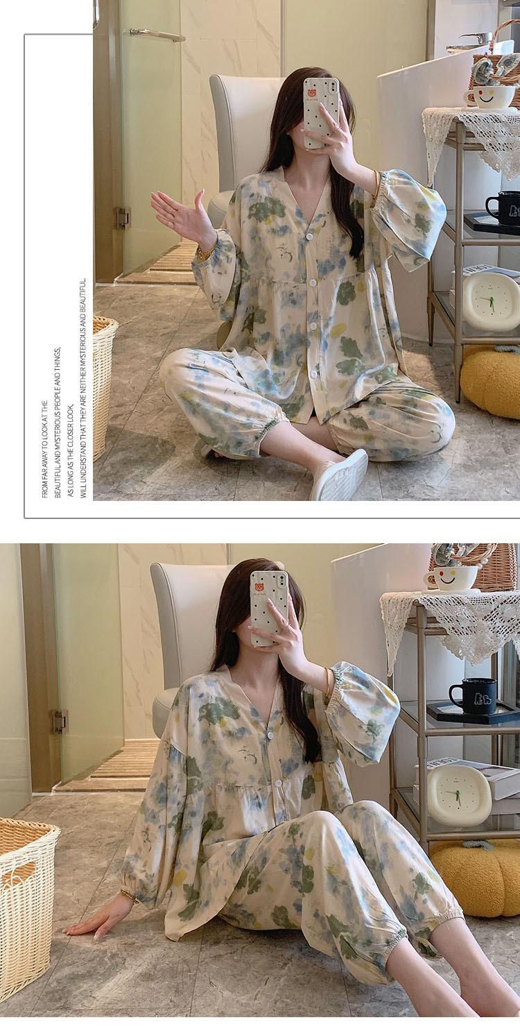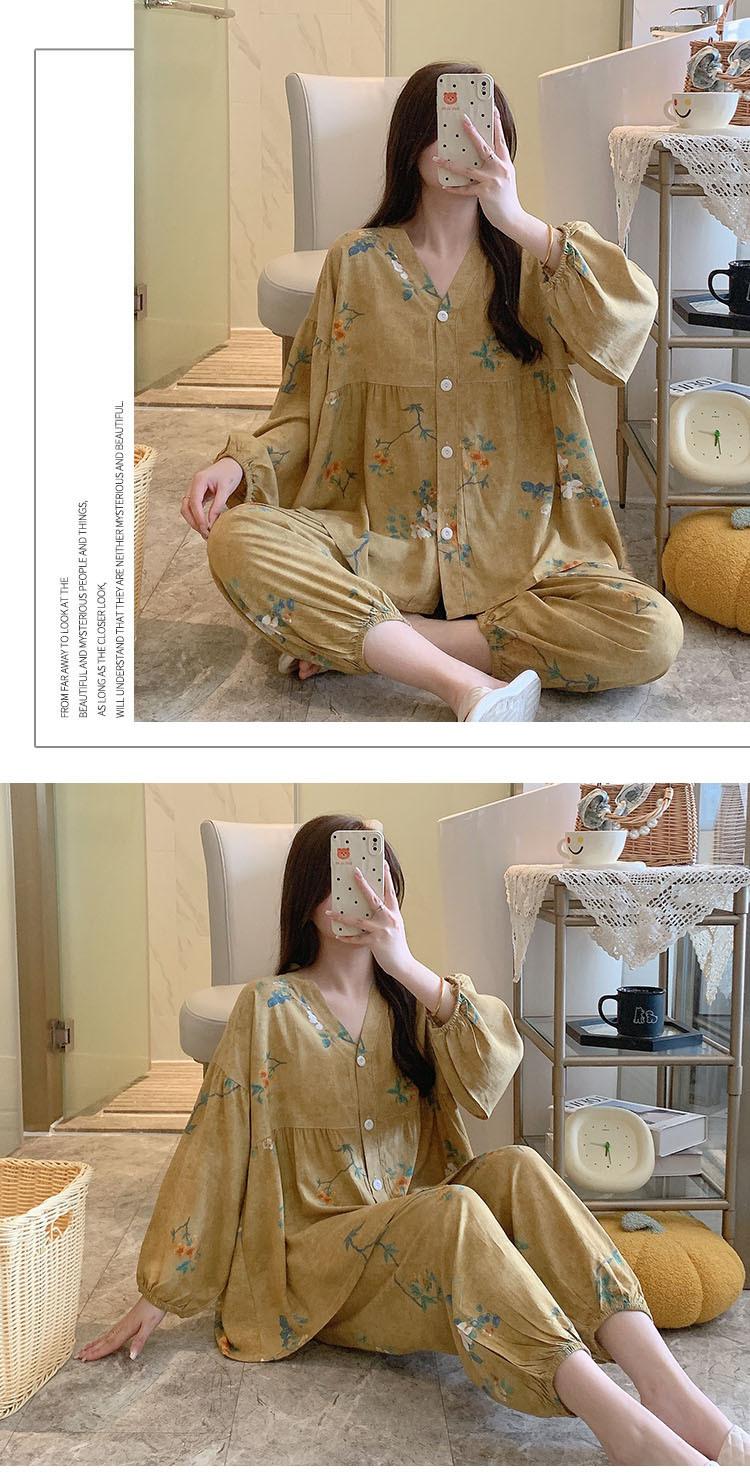Pijama de Algodón Seda para Mujer de Primavera y Otoño, Conjunto de Pantalón Largo de Manga Larga, Cárdigan de Algodón Seda para Estar en Casa, Cuello en V, Simple y Casual