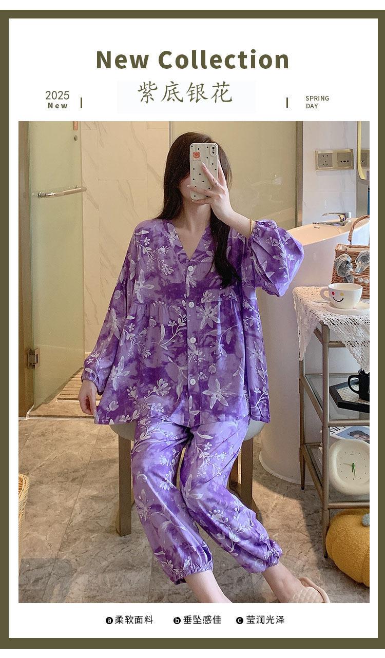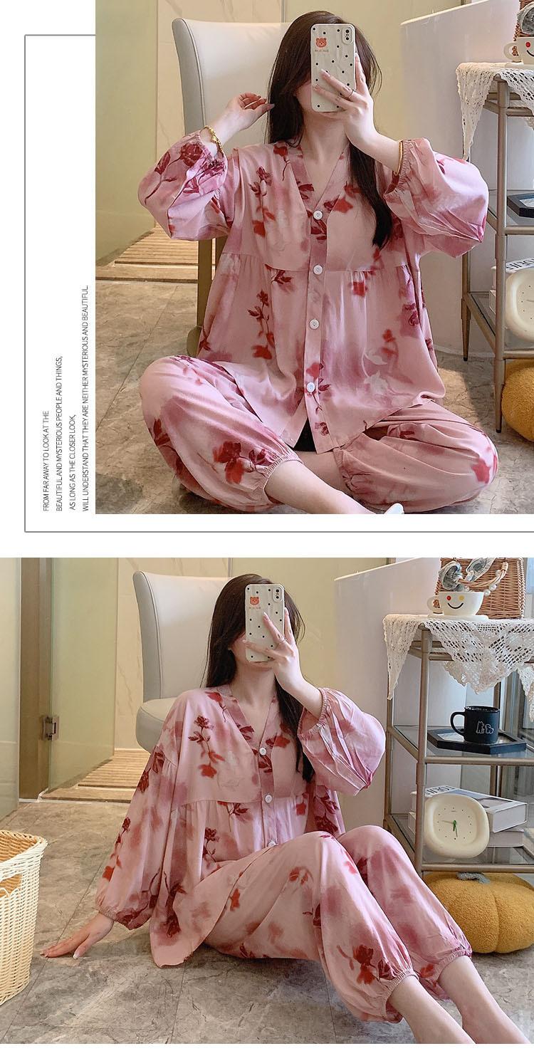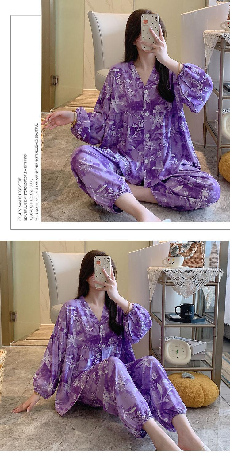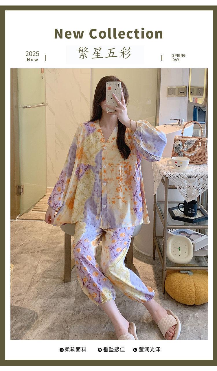 Pijama de Algodón Seda para Mujer de Primavera y Otoño, Conjunto de Pantalón Largo de Manga Larga, Cárdigan de Algodón Seda para Estar en Casa, Cuello en V, Simple y Casual