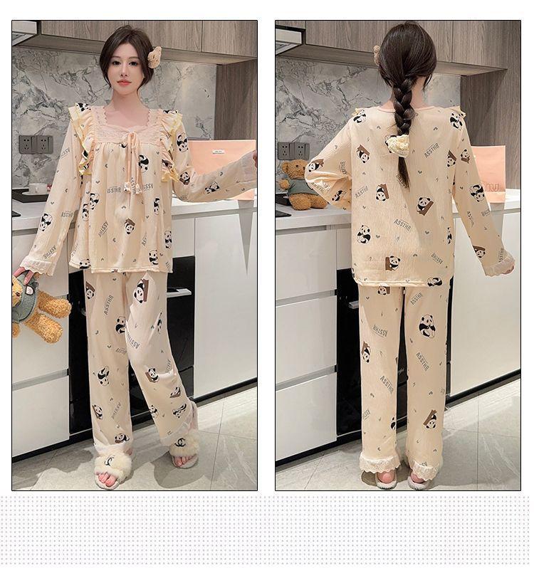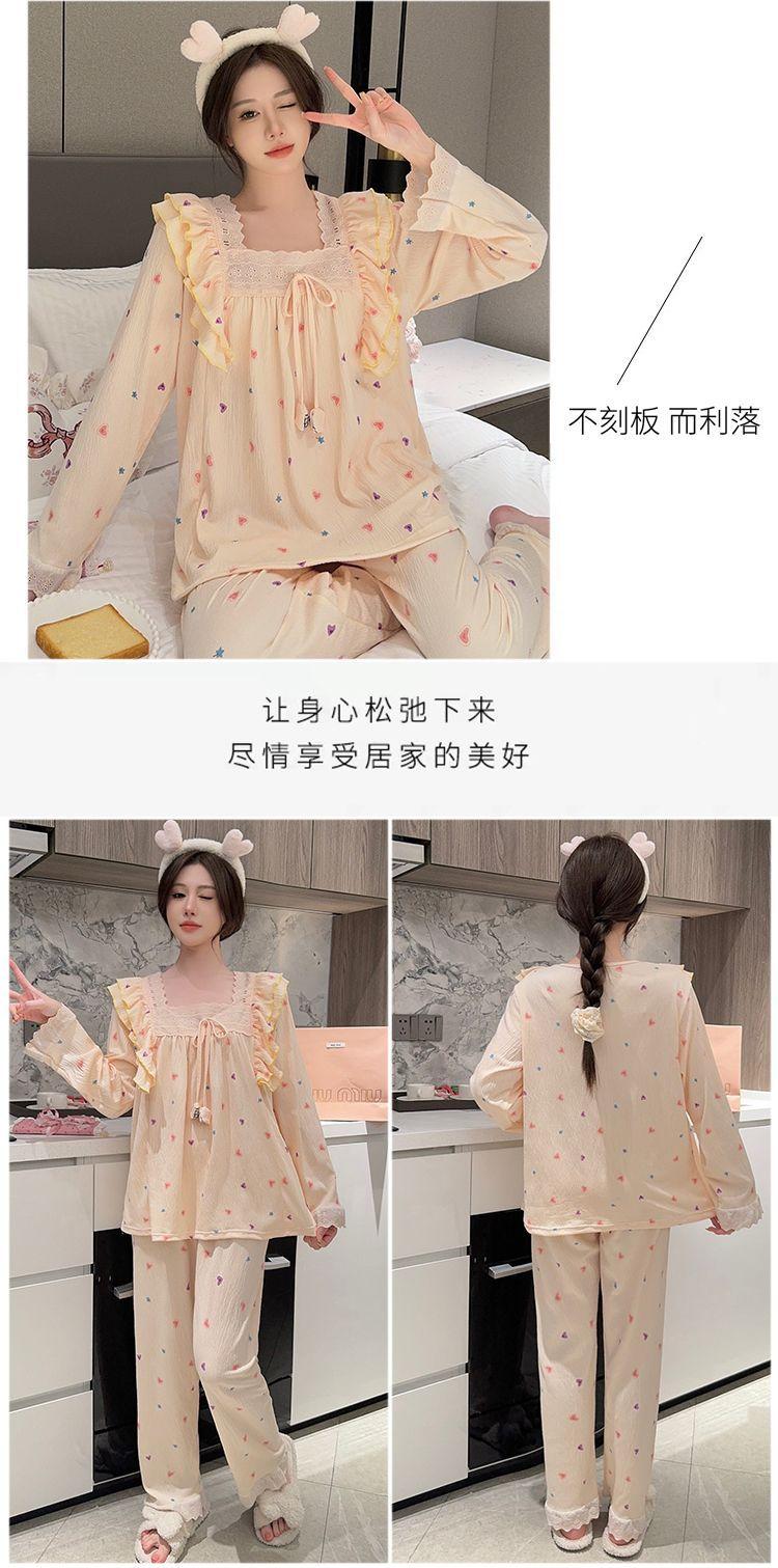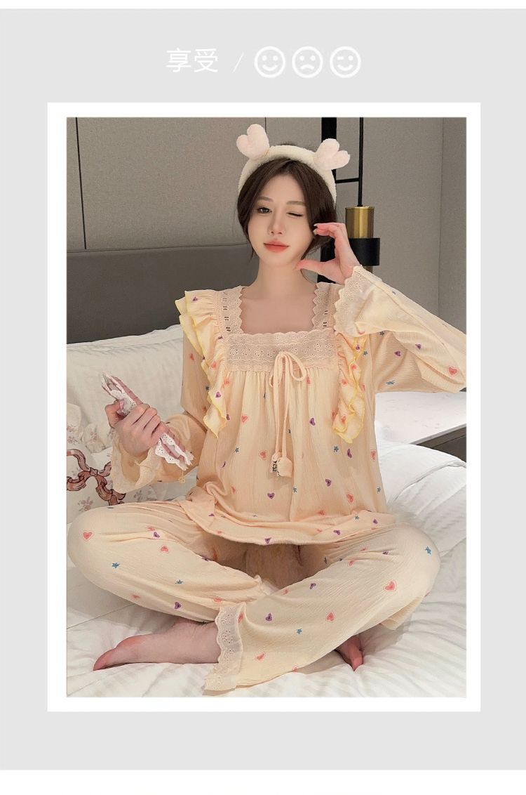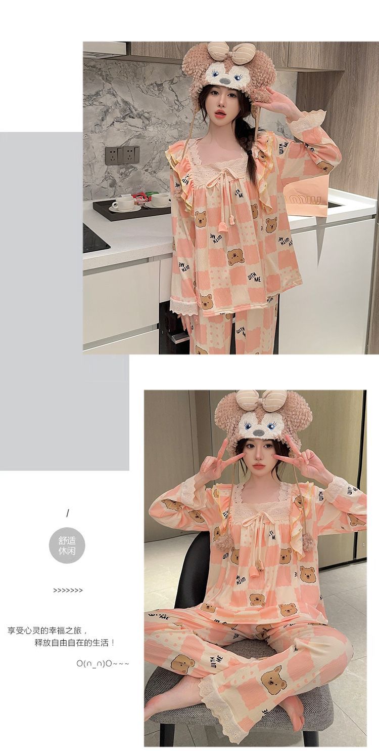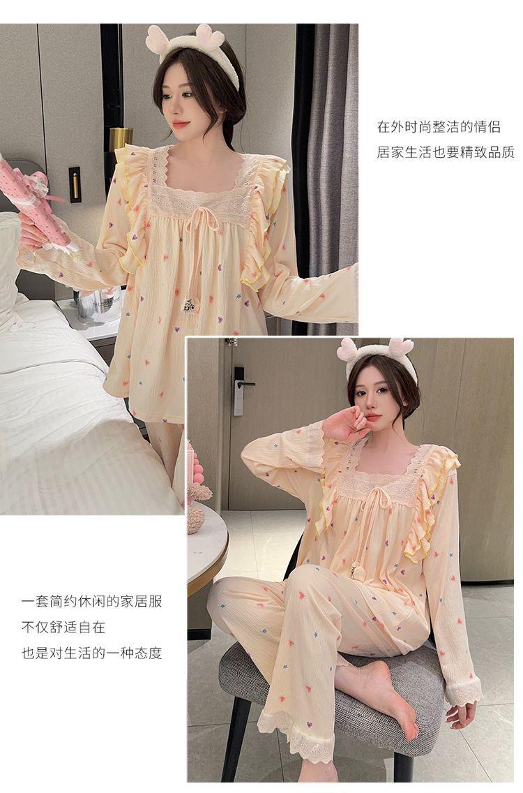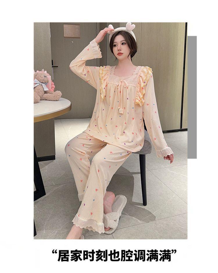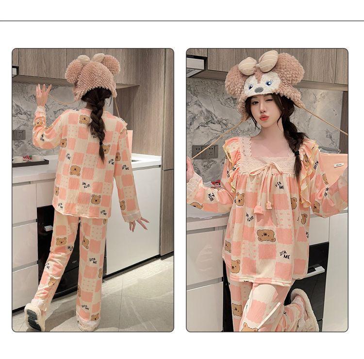 Pijama Arrugado para Mujer Moda Primavera y Otoño Estilo Princesa Dulce Pantalones de Manga Larga Talla Grande 120kg Conjunto de Ropa para el Hogar