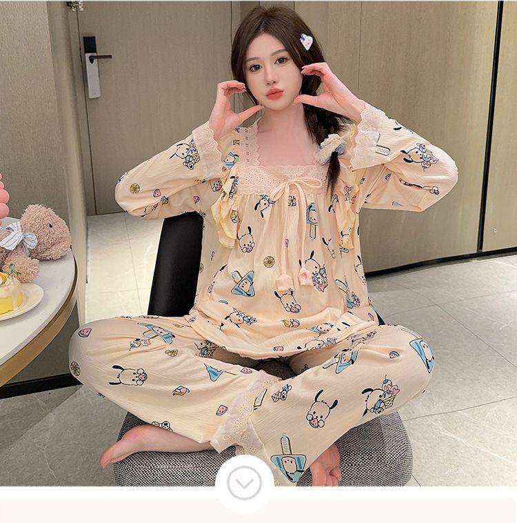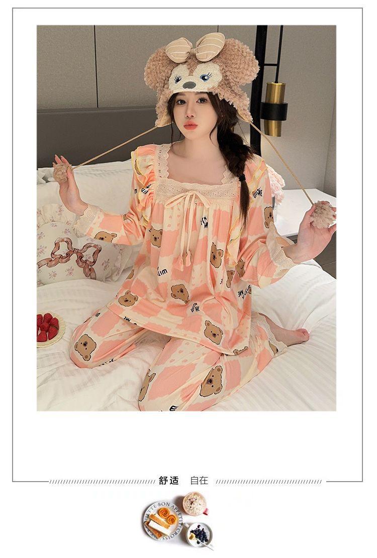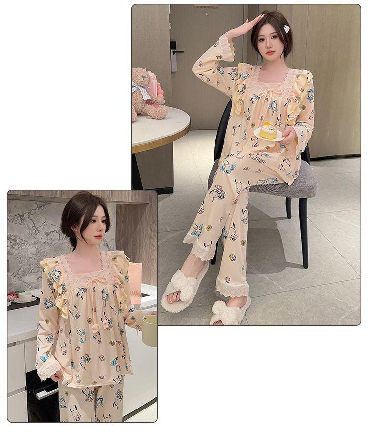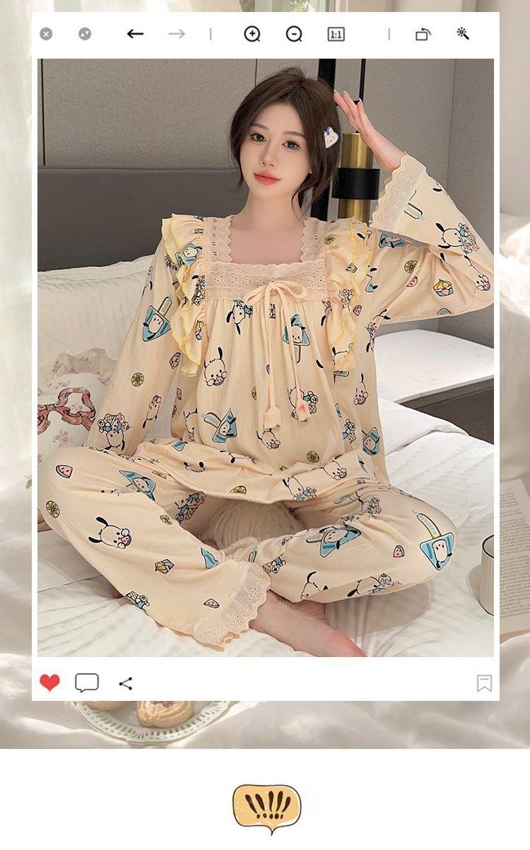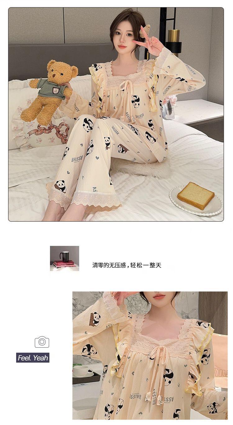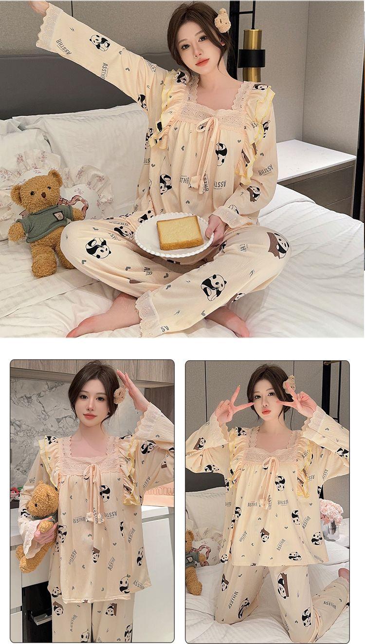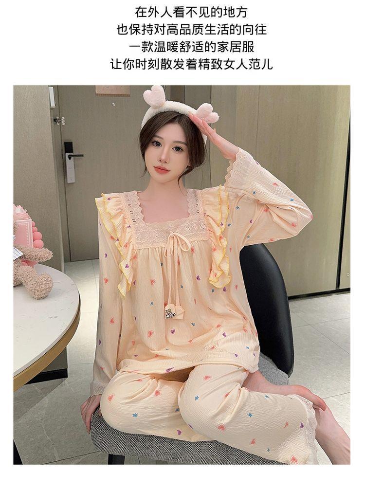 Pijama Arrugado para Mujer Moda Primavera y Otoño Estilo Princesa Dulce Pantalones de Manga Larga Talla Grande 120kg Conjunto de Ropa para el Hogar