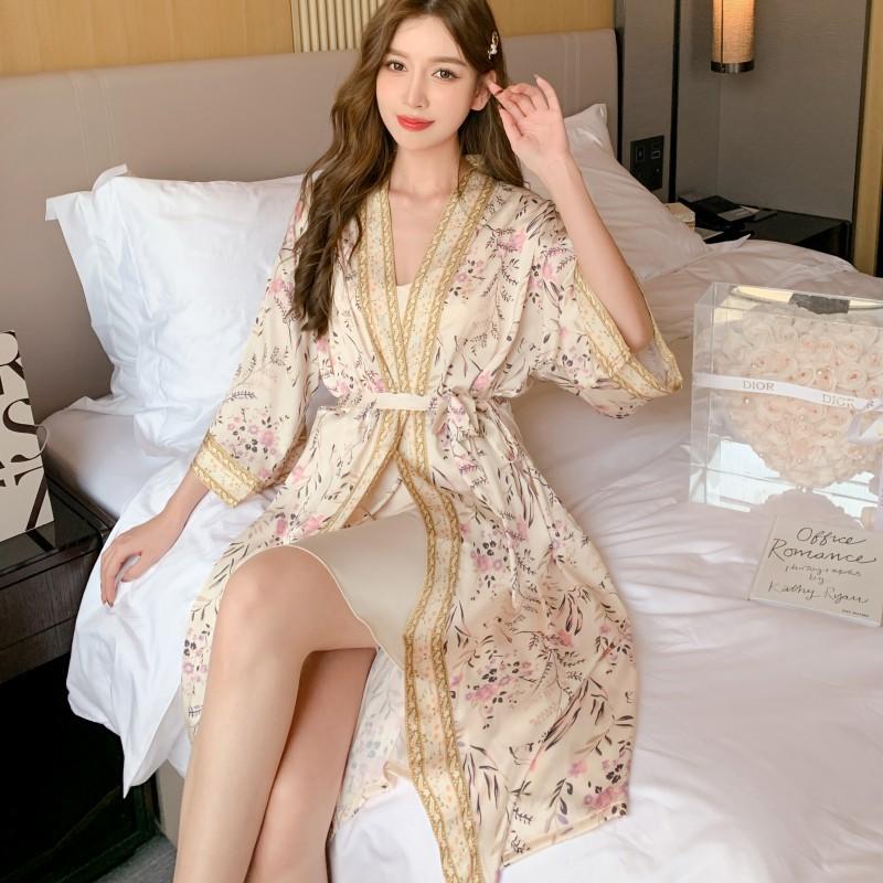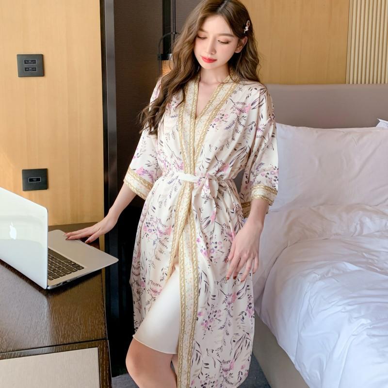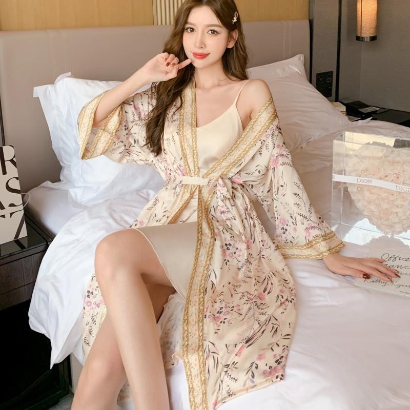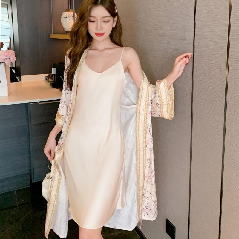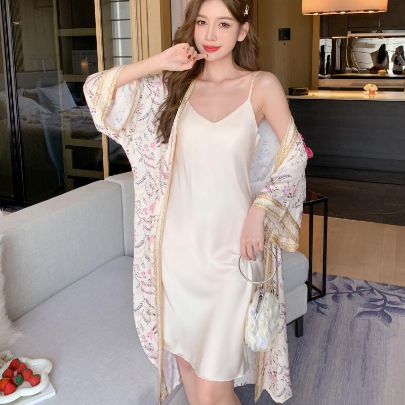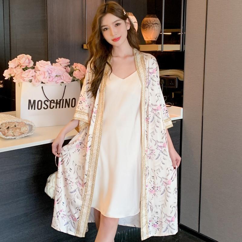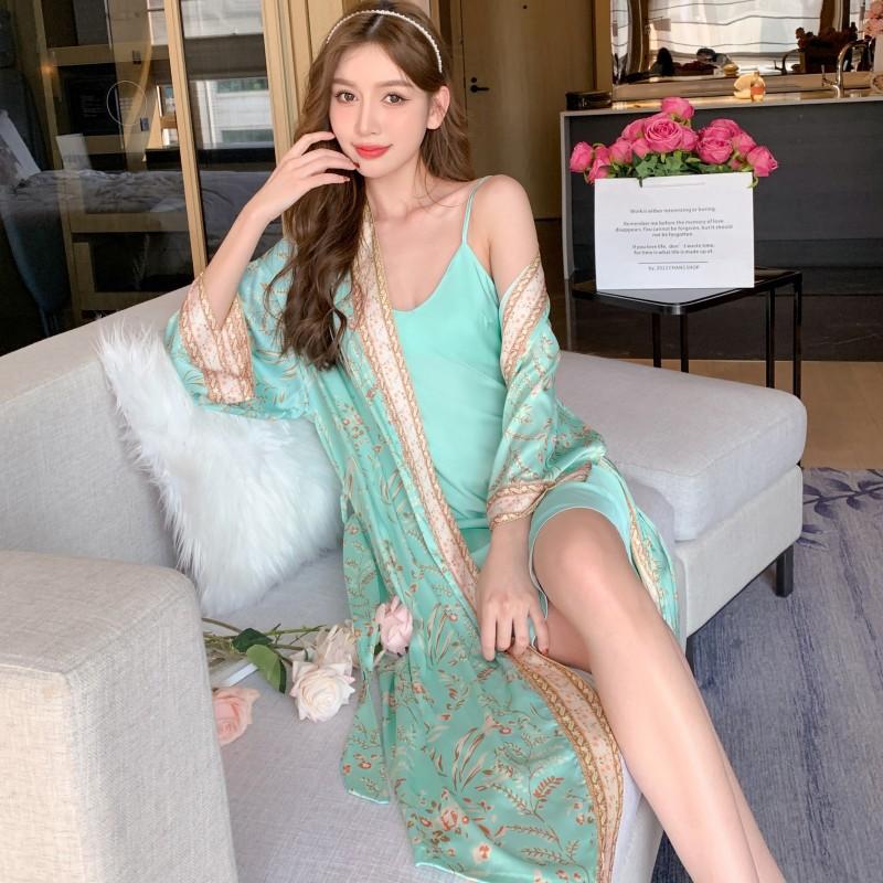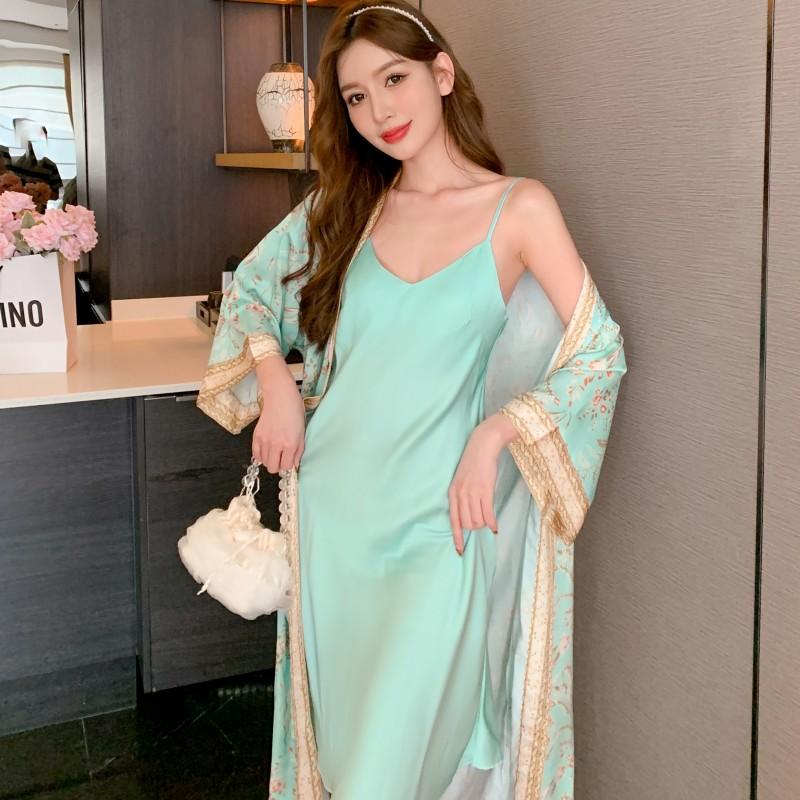 Pijamas de seda nuevos de primavera y otoño para mujer, camisón largo estampado de palacio fino, conjunto de dos piezas, ropa de casa para mujer