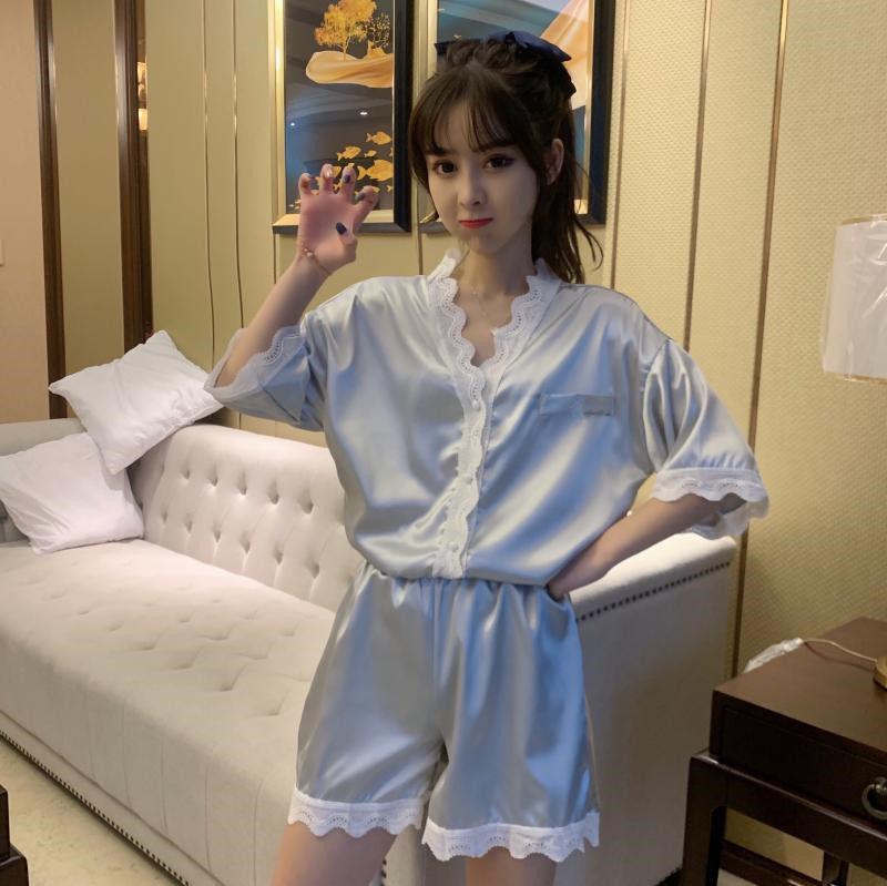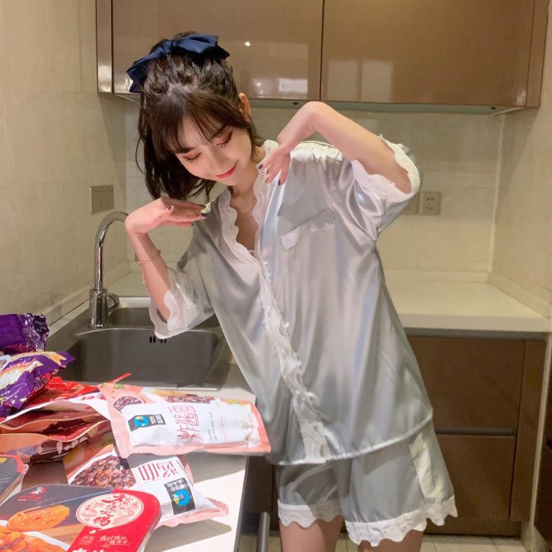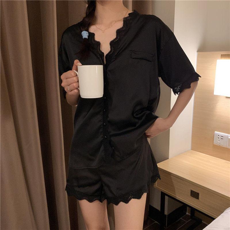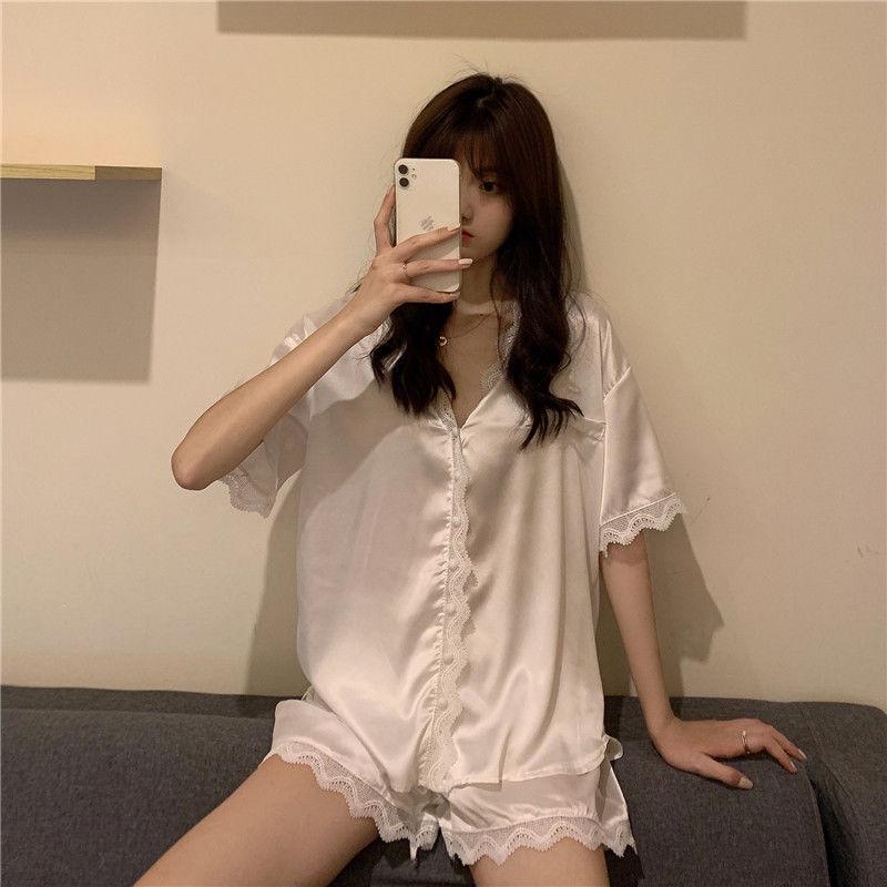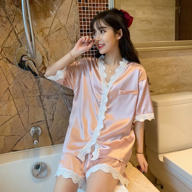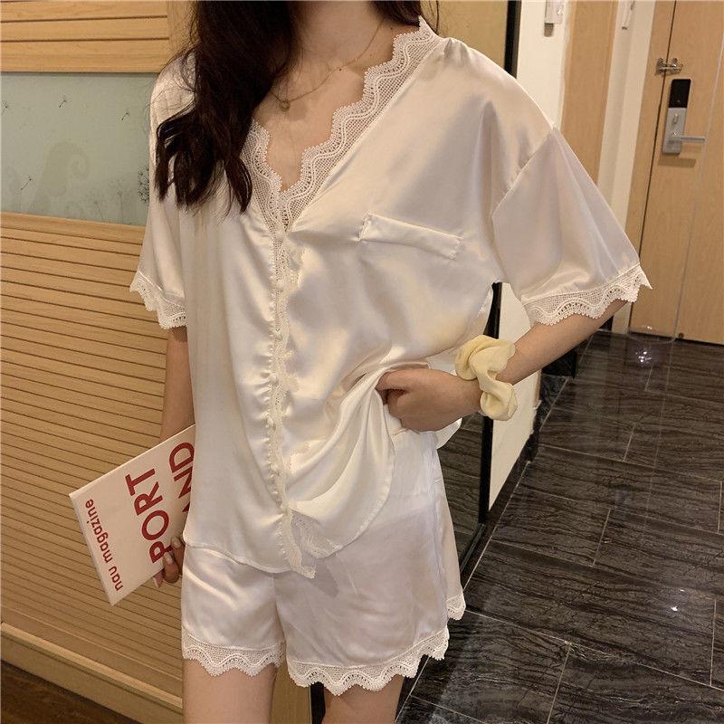 Pijama de verano para mujer, de seda fina, de manga corta, con encaje sexy, pantalones cortos, conjunto informal para el hogar, 2021