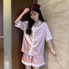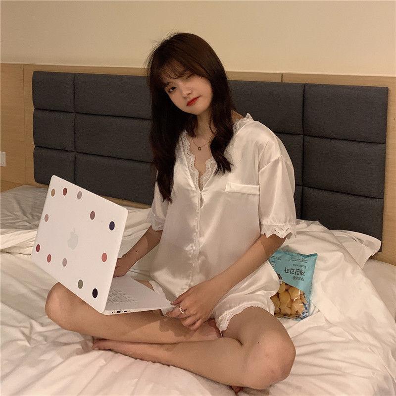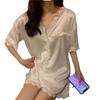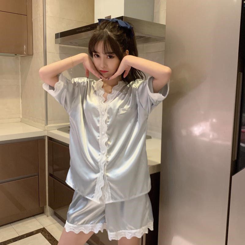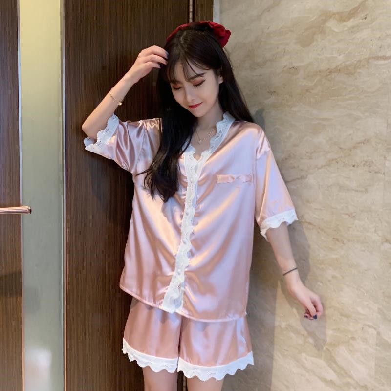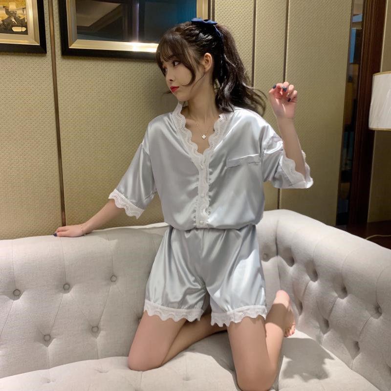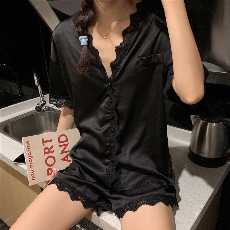Pijama de verano para mujer, de seda fina, de manga corta, con encaje sexy, pantalones cortos, conjunto informal para el hogar, 2021