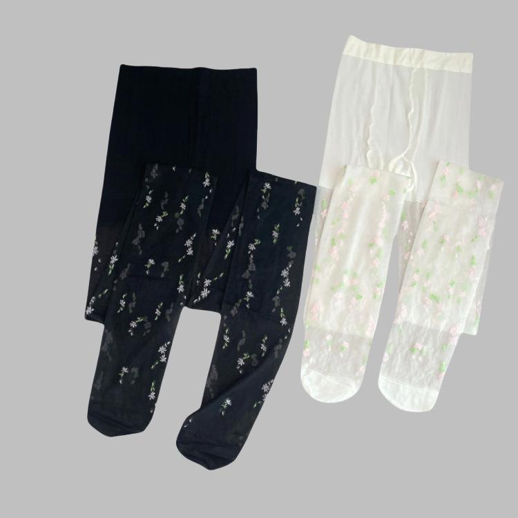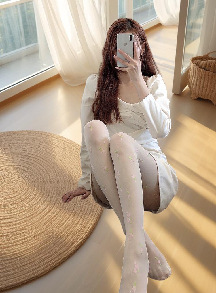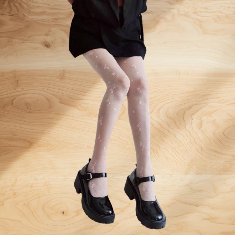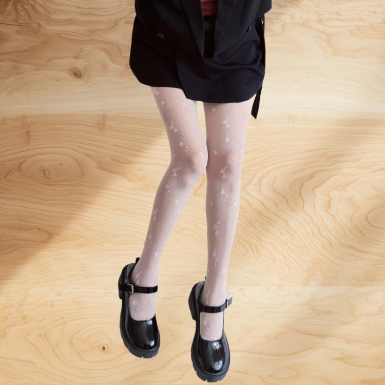 Medias de seda japonesas con estampado floral blanco leche para mujer, ultrafinas, transparentes, sexys, de jacquard de seda negra, para verano