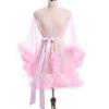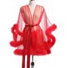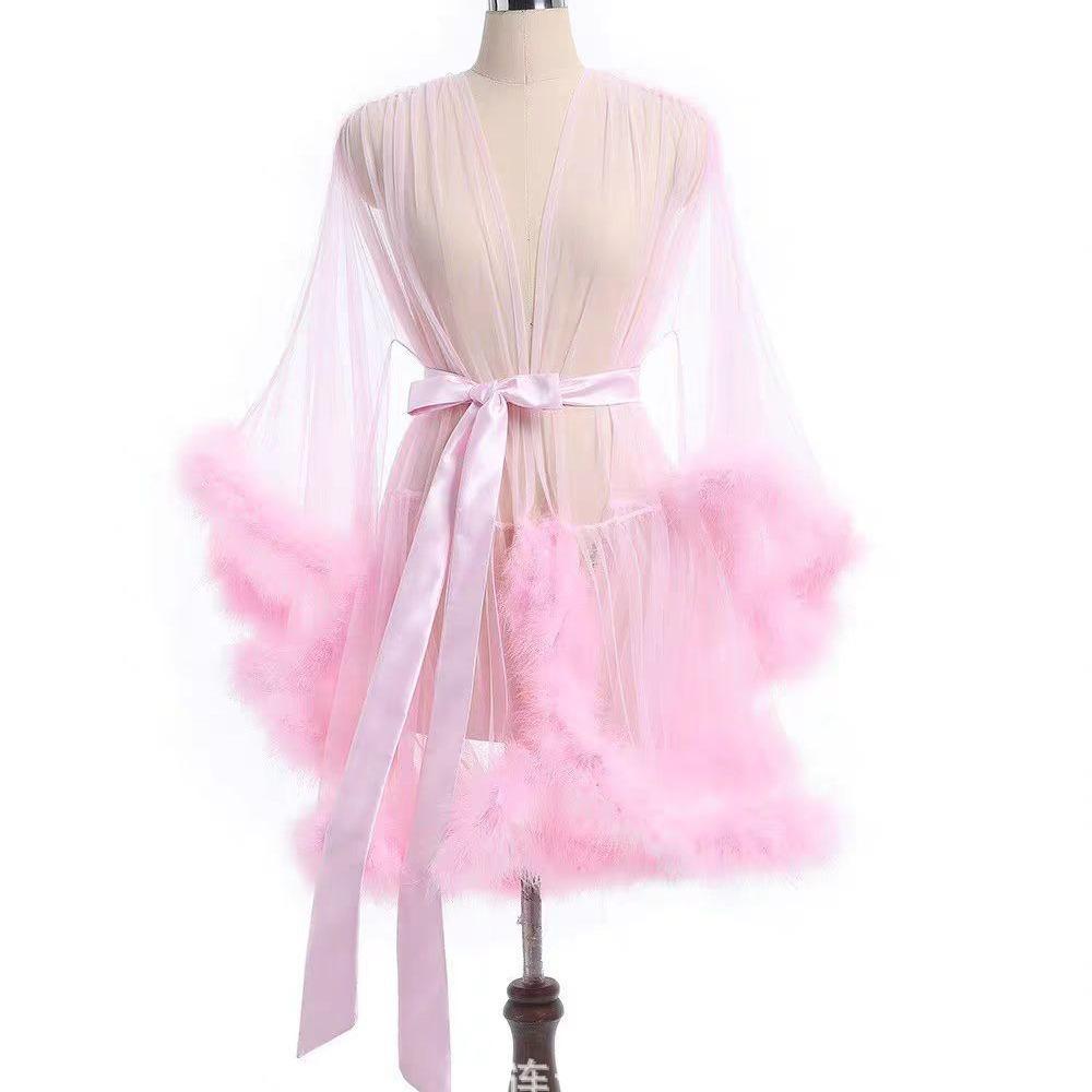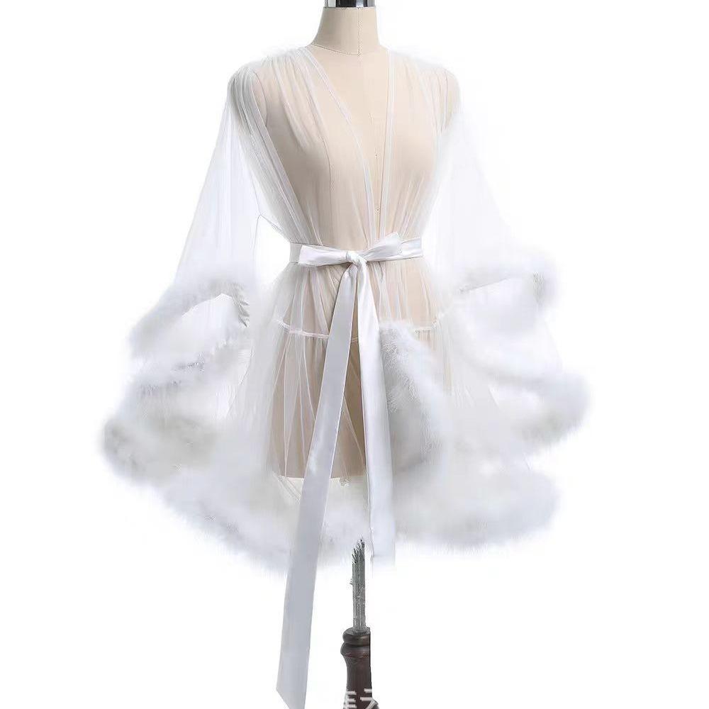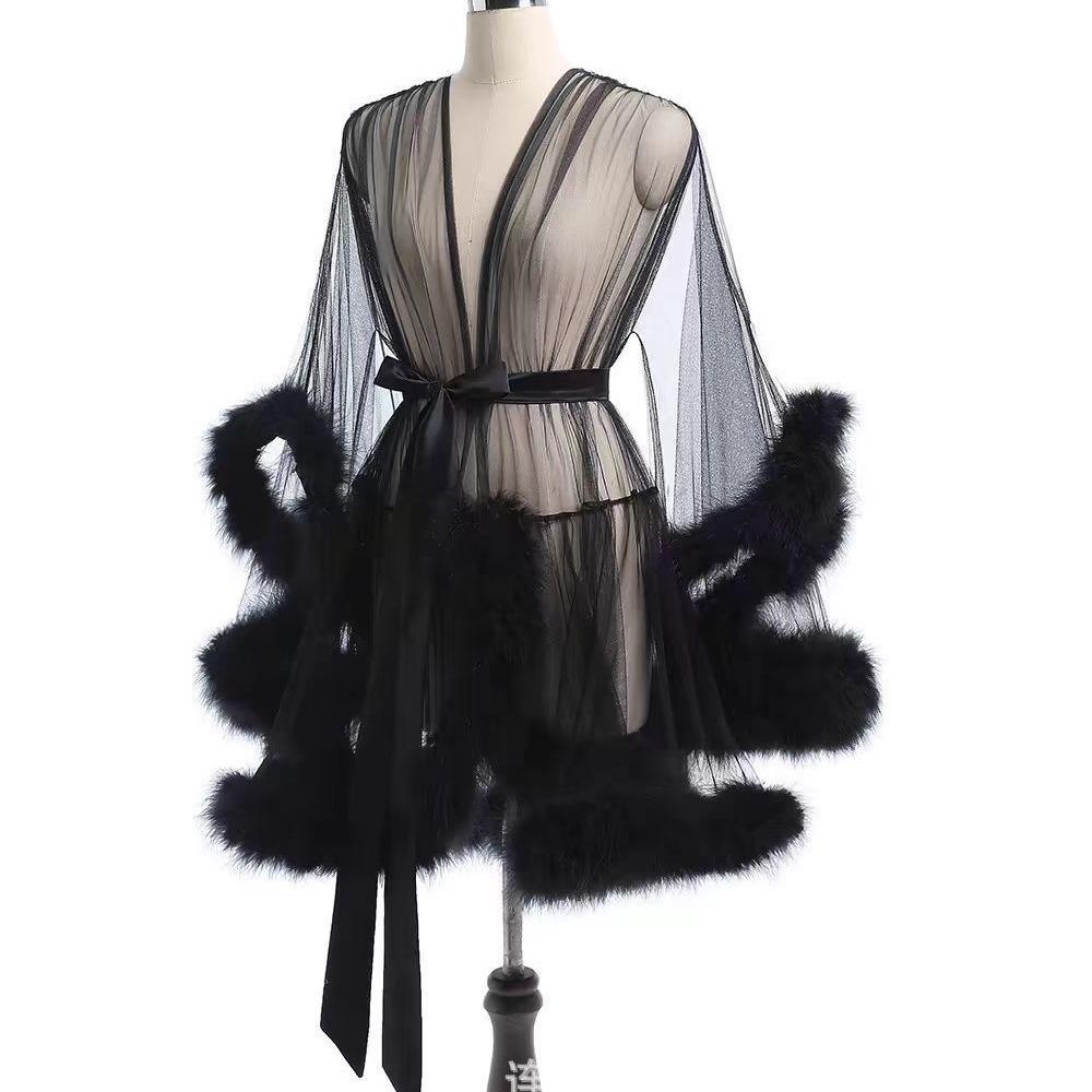 Bata exterior sexy de malla transparente, bata de baño, camisón, ropa de casa transparente, mangas empalmadas peludas, ropa exterior de longitud media