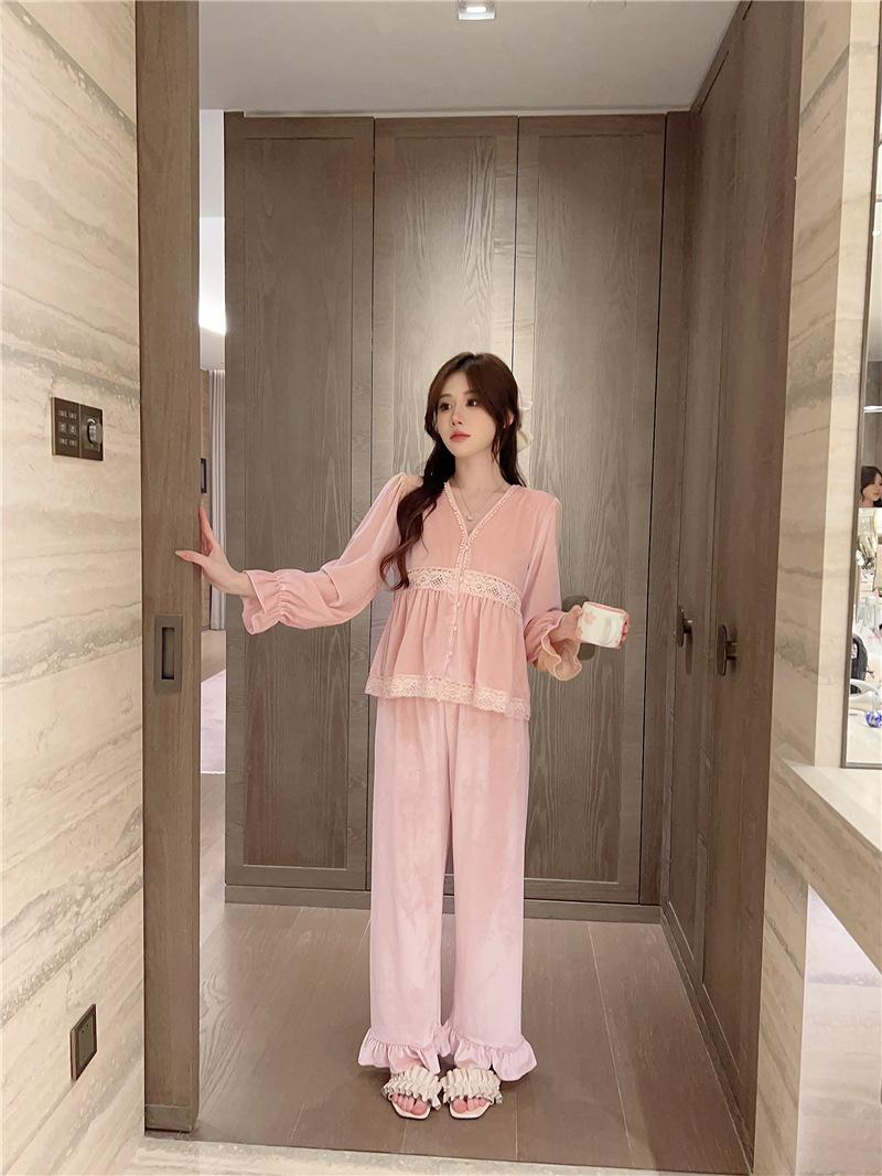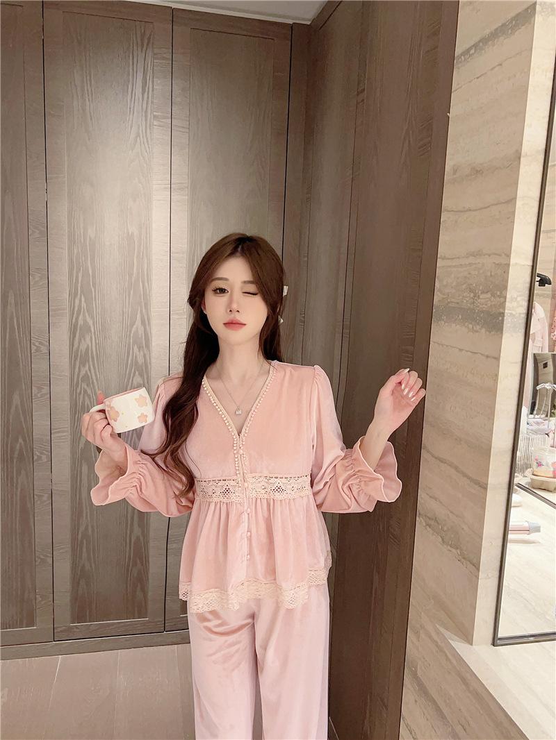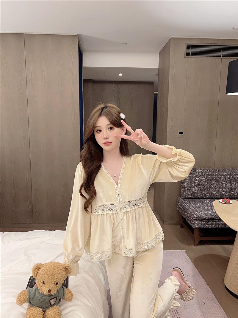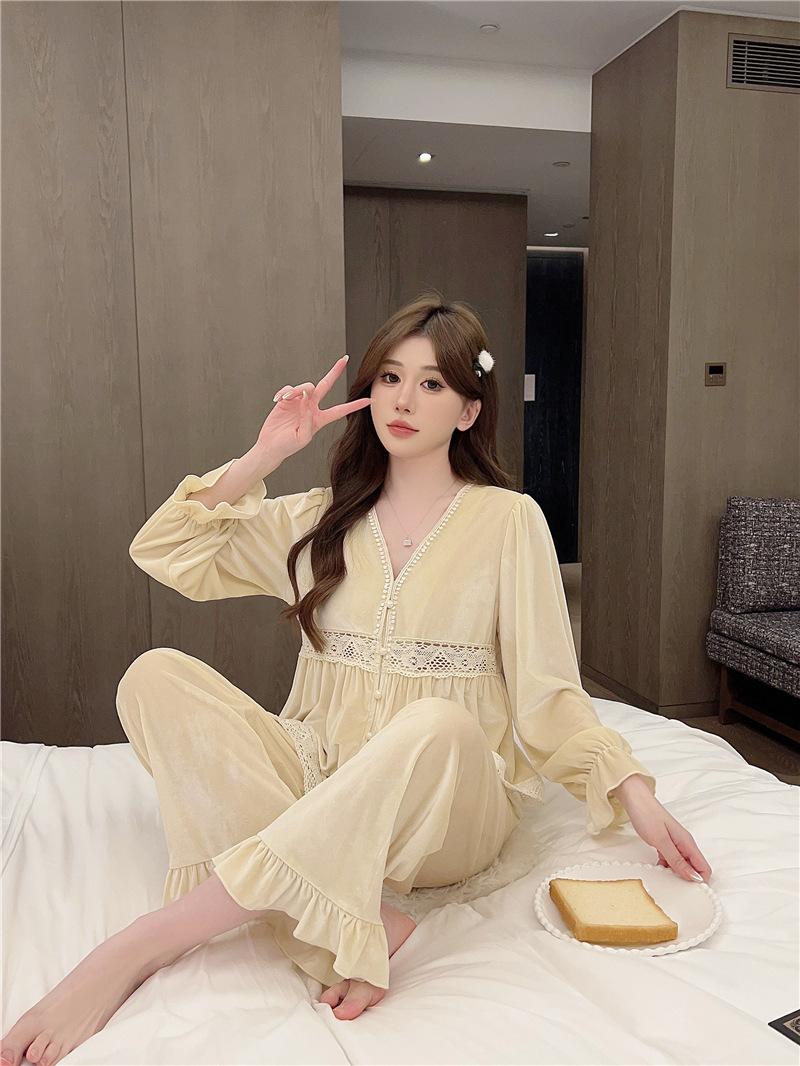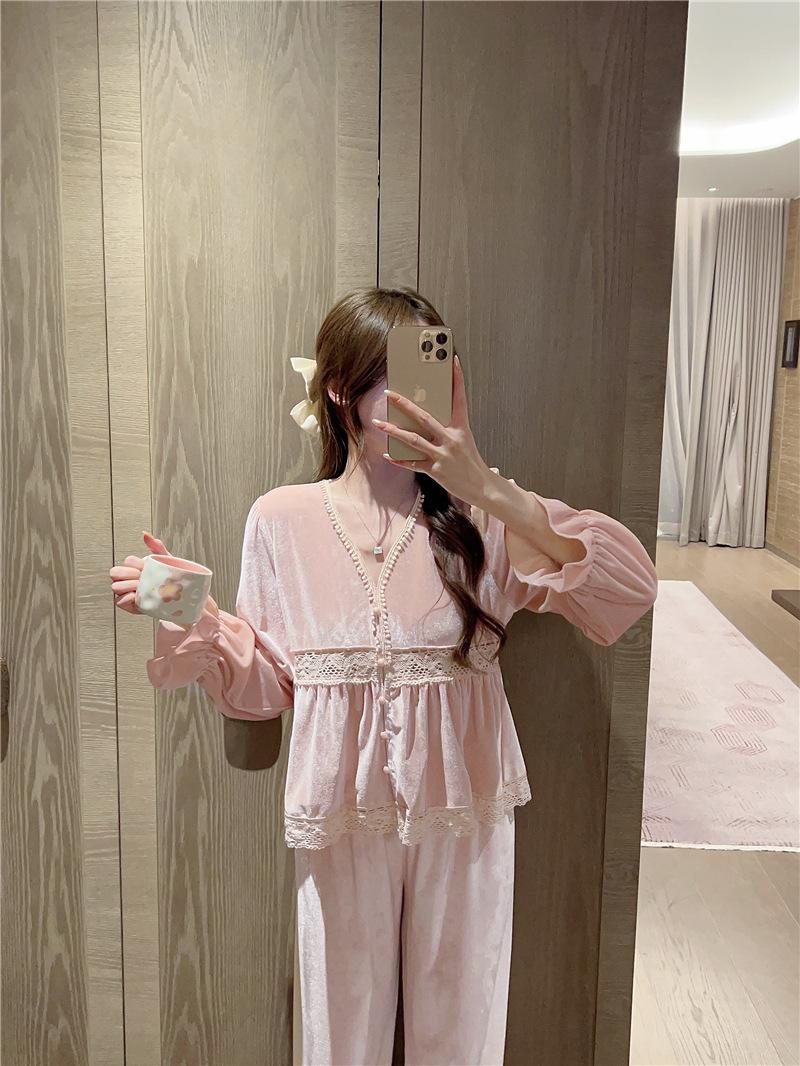 Pijama de Mujer Otoño e Invierno Nuevo Terciopelo Coreano Cálido Dulce Lindo Manga Larga Pantalones Traje Dulce Ropa para el Hogar