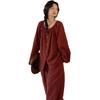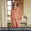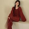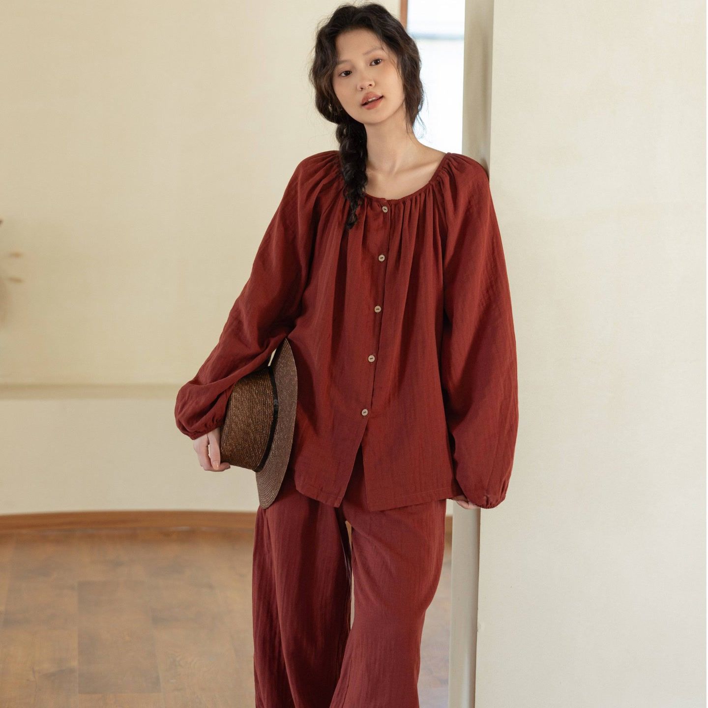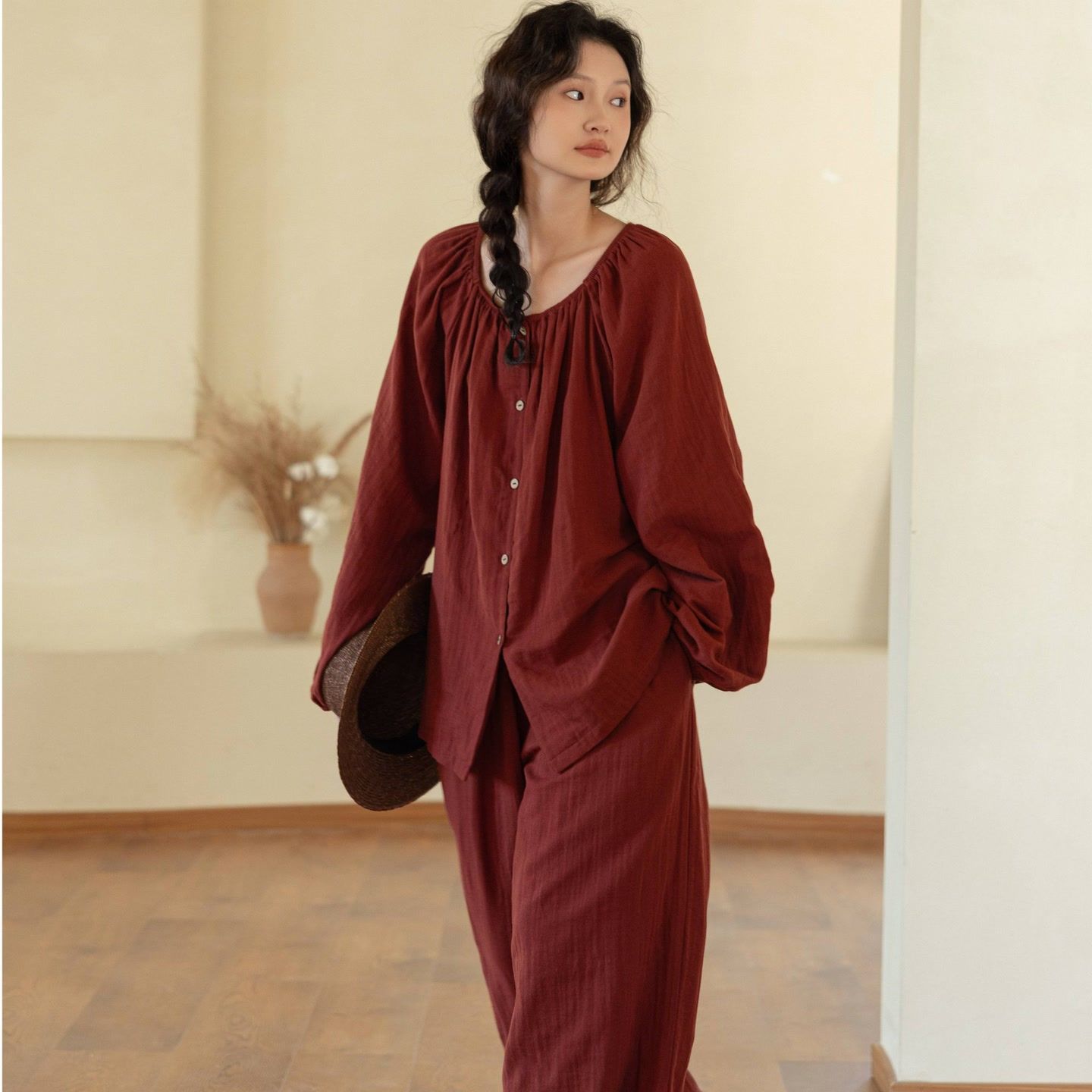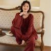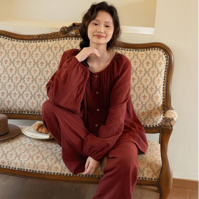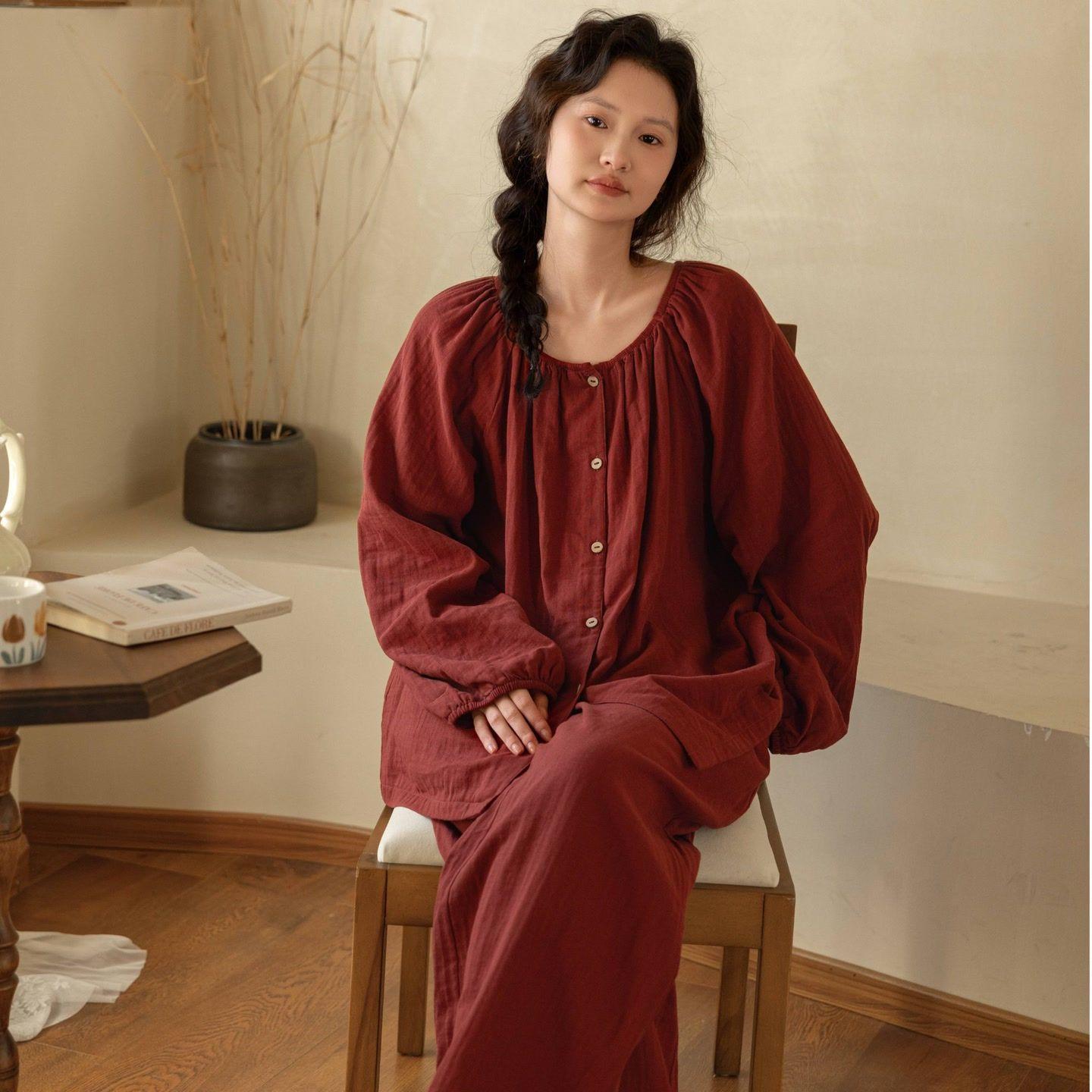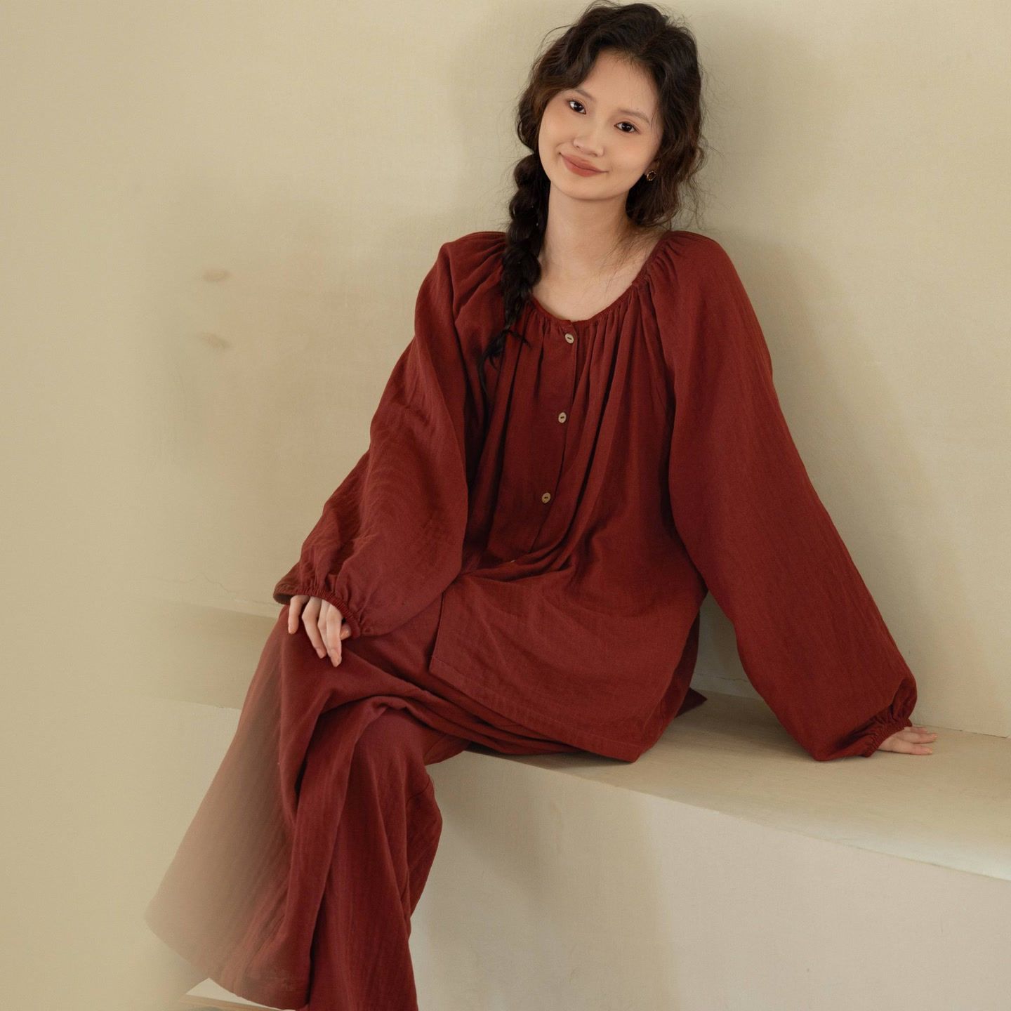Pijamas Zumashi para Mujer, Primavera y Otoño, Gasa de Algodón Puro, Rojo Brillante, Nuevo de Manga Larga, Conjunto de Ropa de Descanso de Talla Grande 175