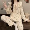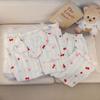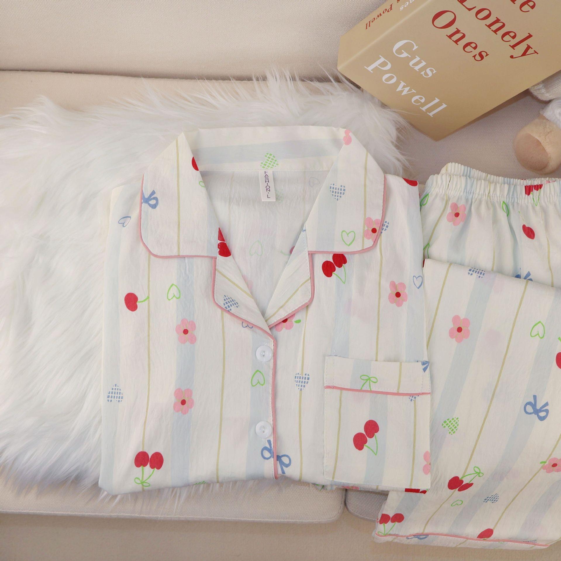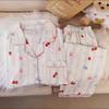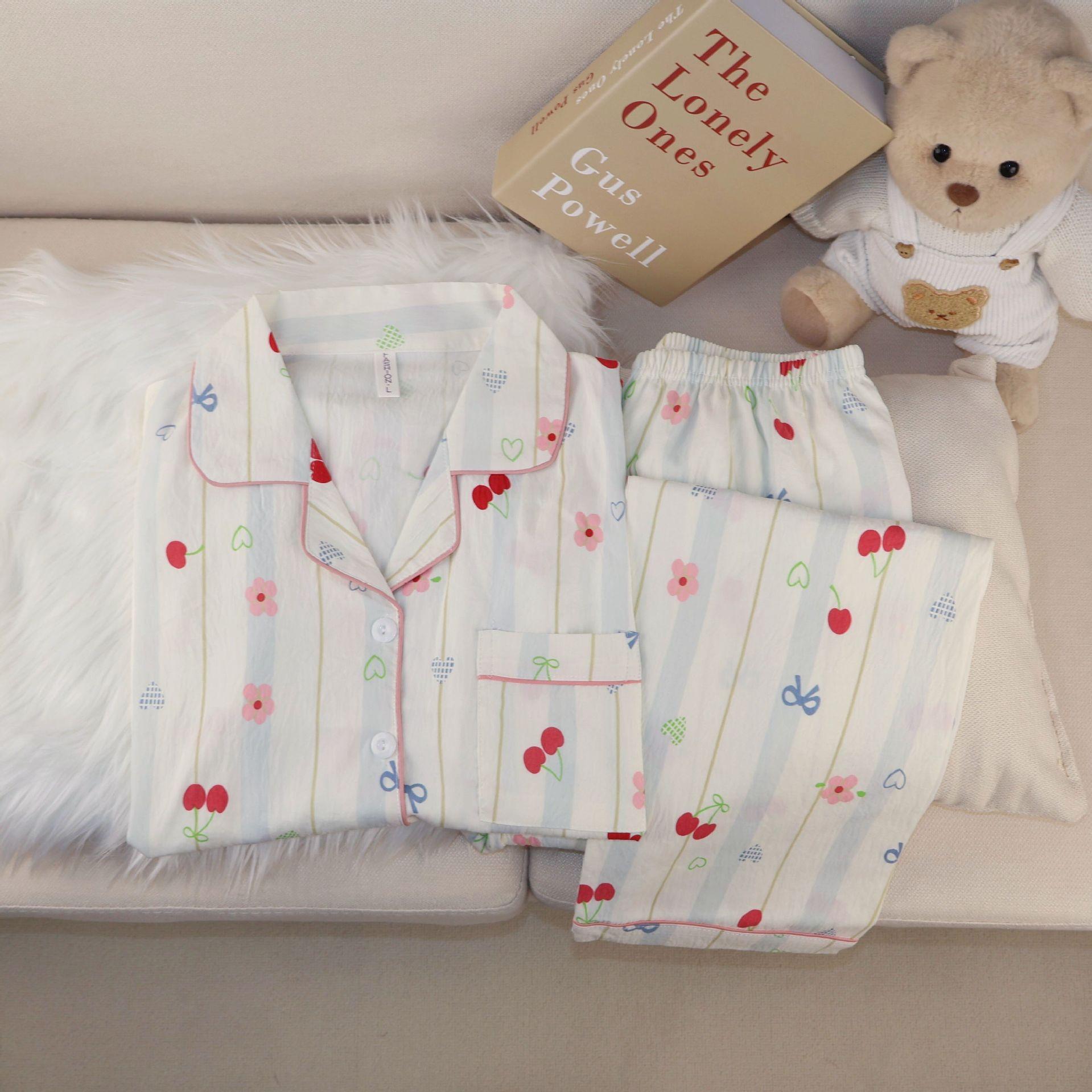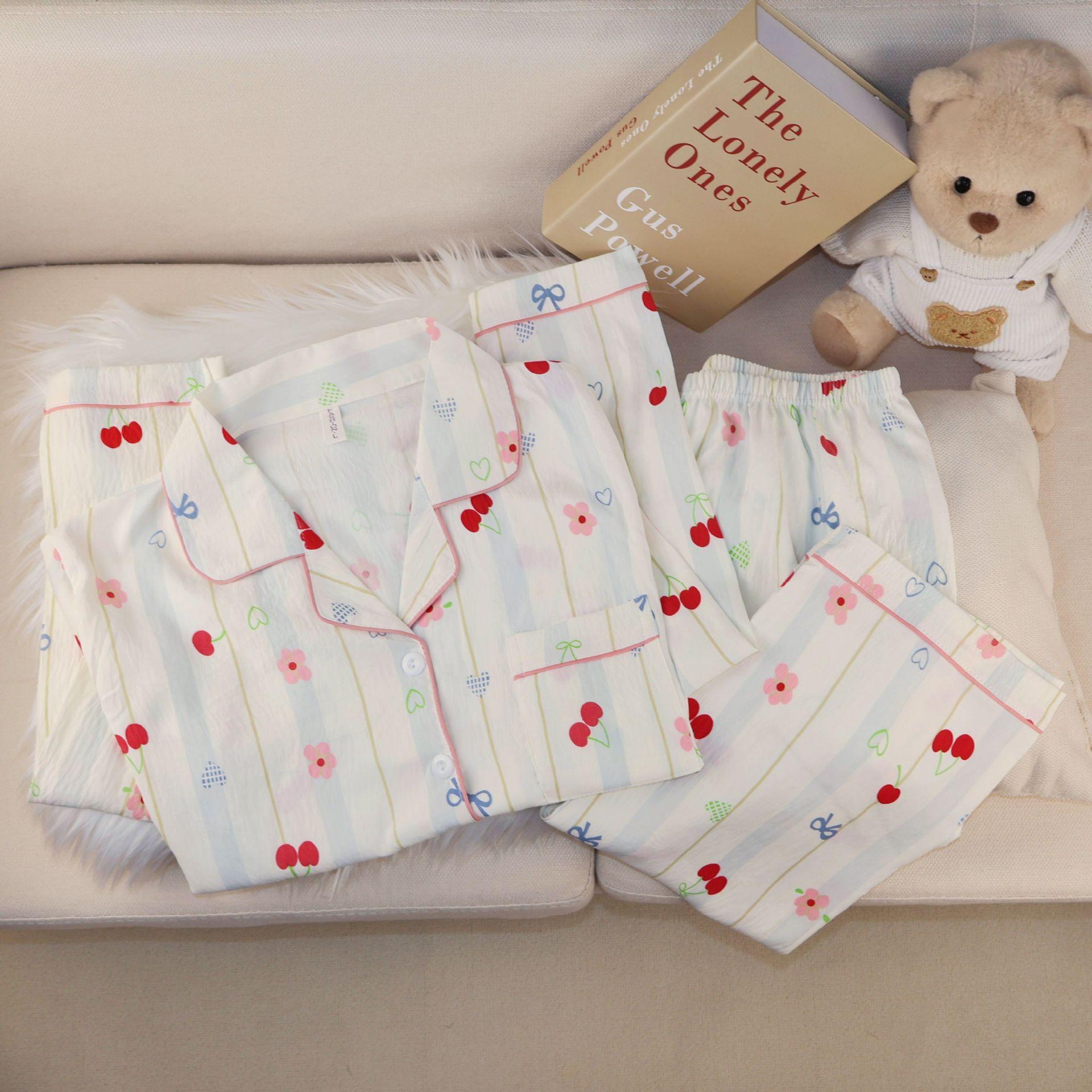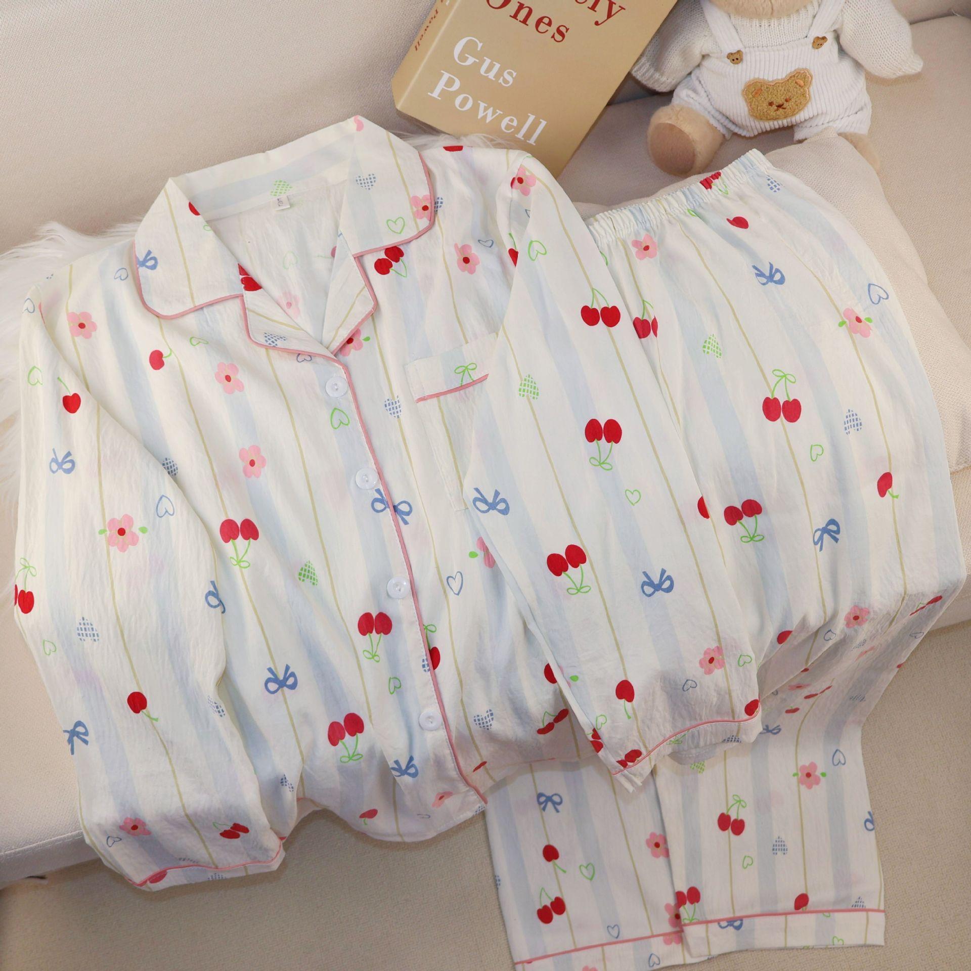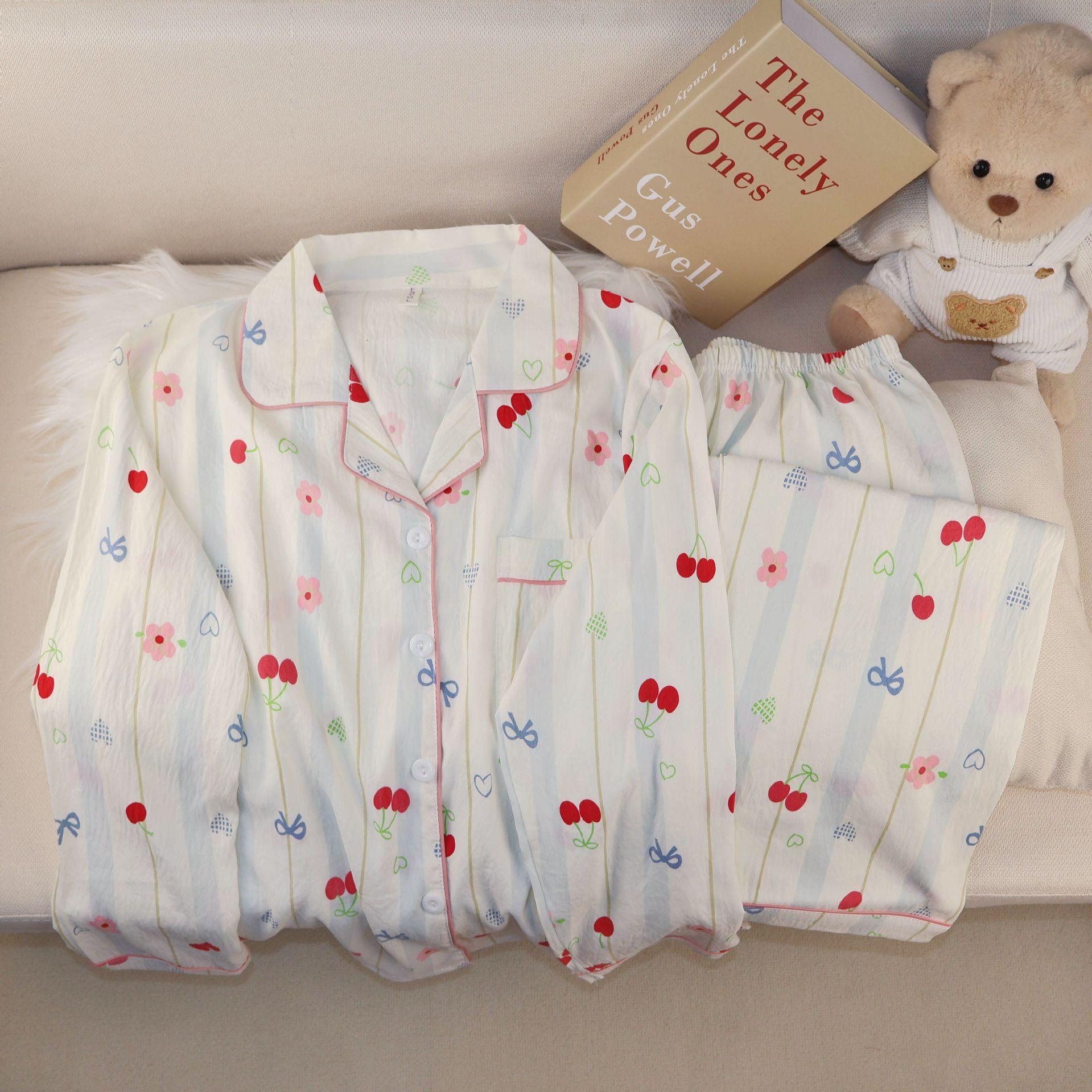 2025 Pijama Nuevo Algodón Nube Estampado Cerezas Femenino Dulce Solapa Cárdigan Dos Piezas Ropa para el Hogar Venta al por Mayor