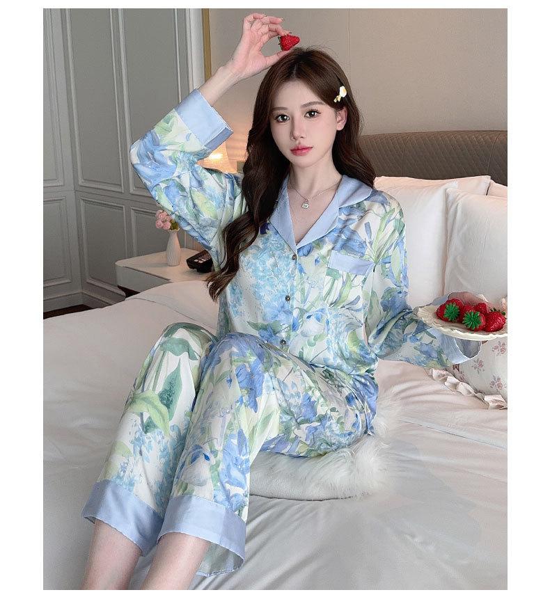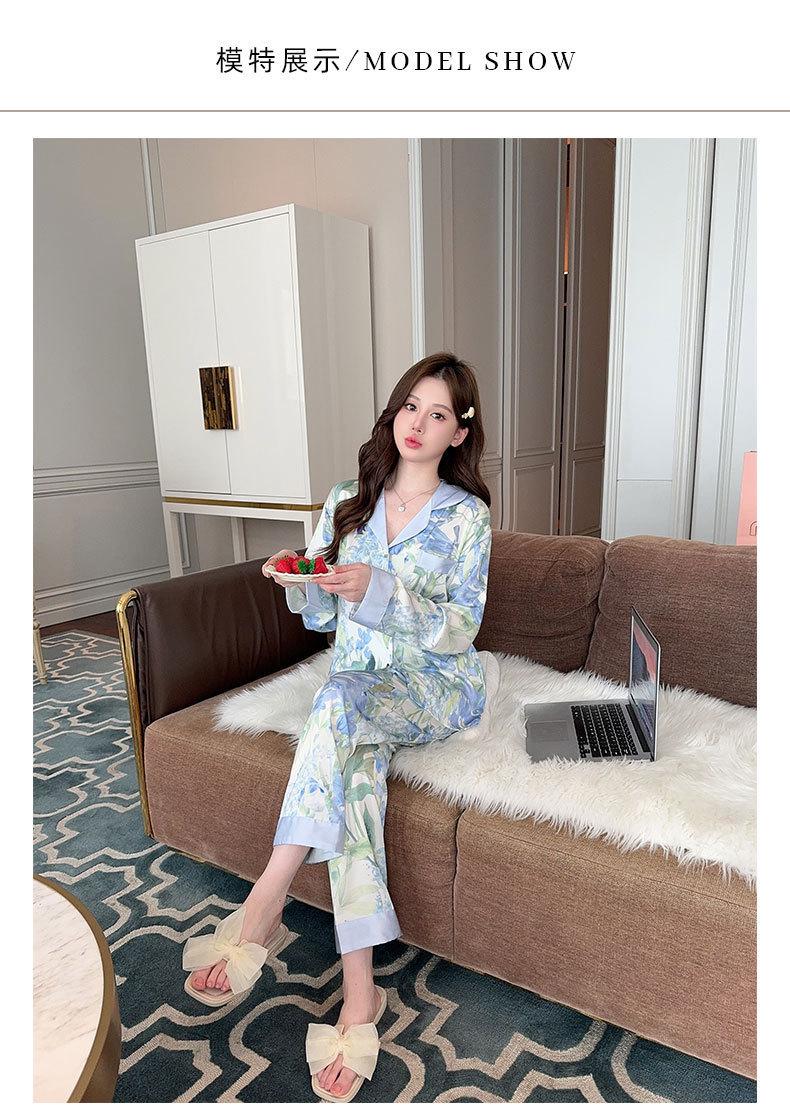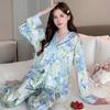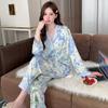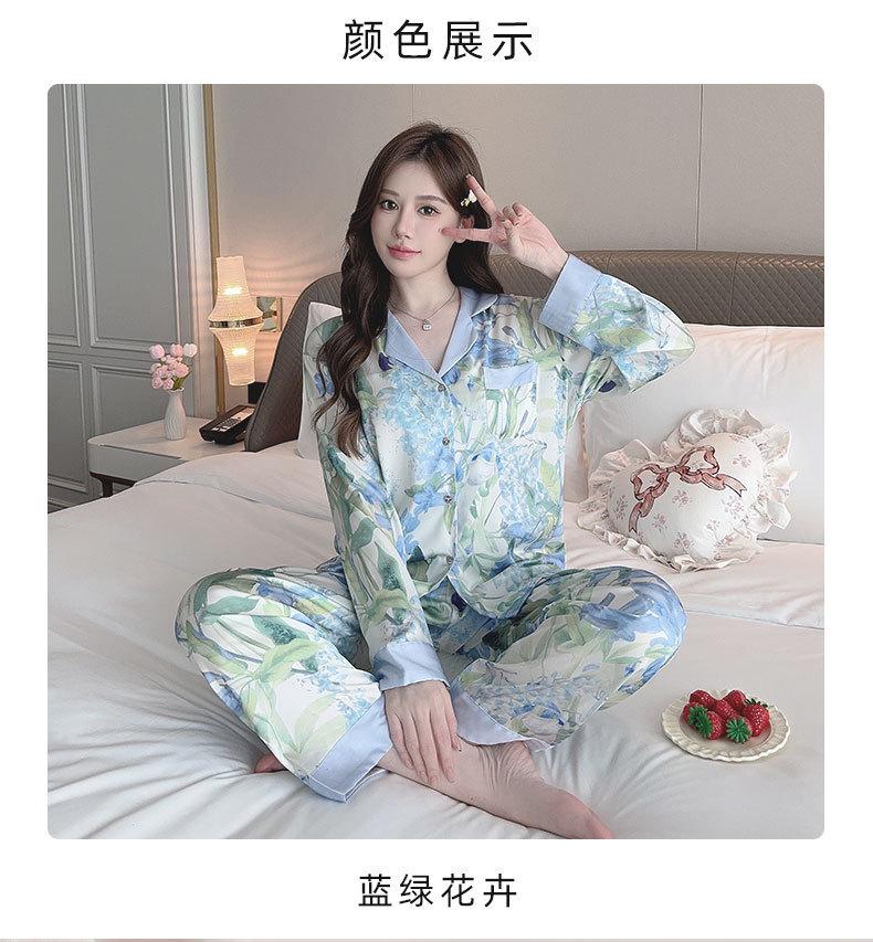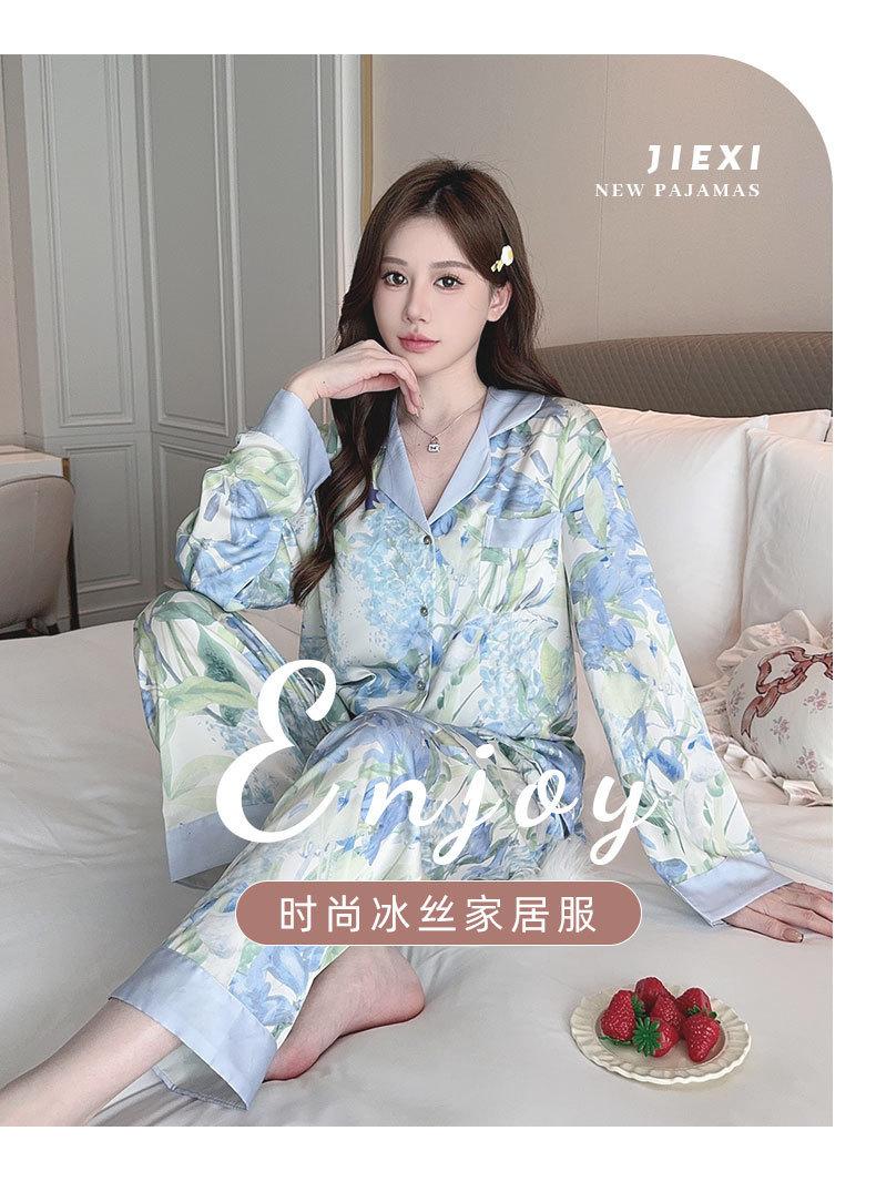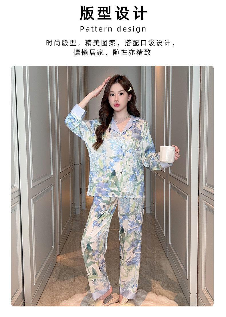 2024 principios de primavera nuevos pijamas de seda de hielo de manga larga para mujer talla grande trajes estampados estilo celebridad de internet ropa de verano para exteriores ropa de casa