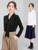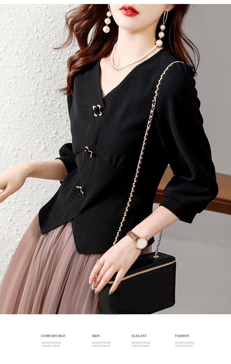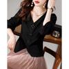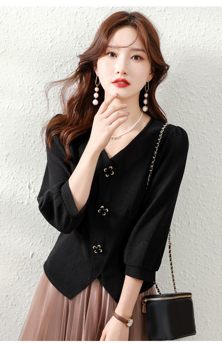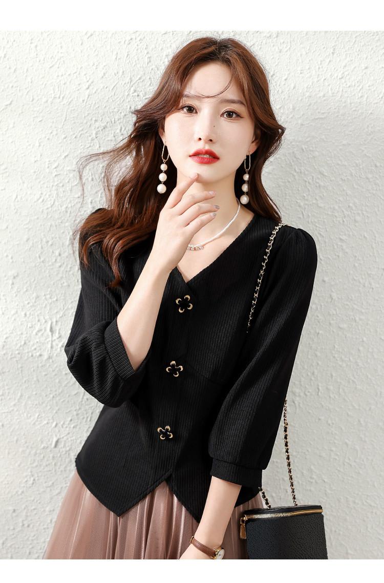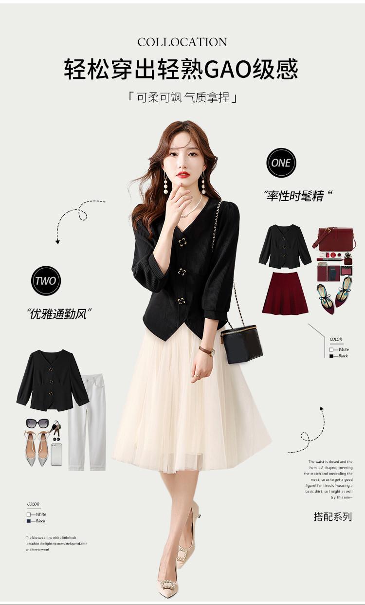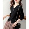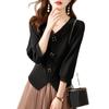 Diseño Nicho Camisa para Mujer Primavera 2025 Nueva Manga Tres Cuartos Cuello V Estilo Occidental Negro Ajustado a la Cintura Look Adelgazante Top Trendy