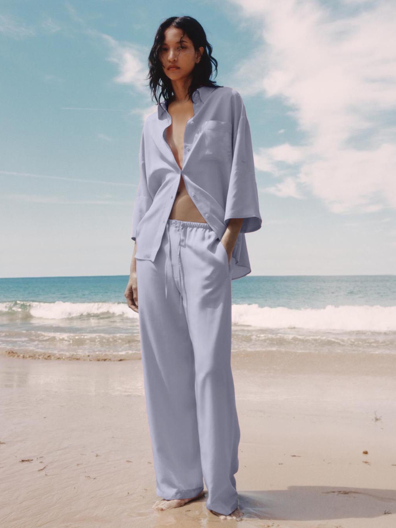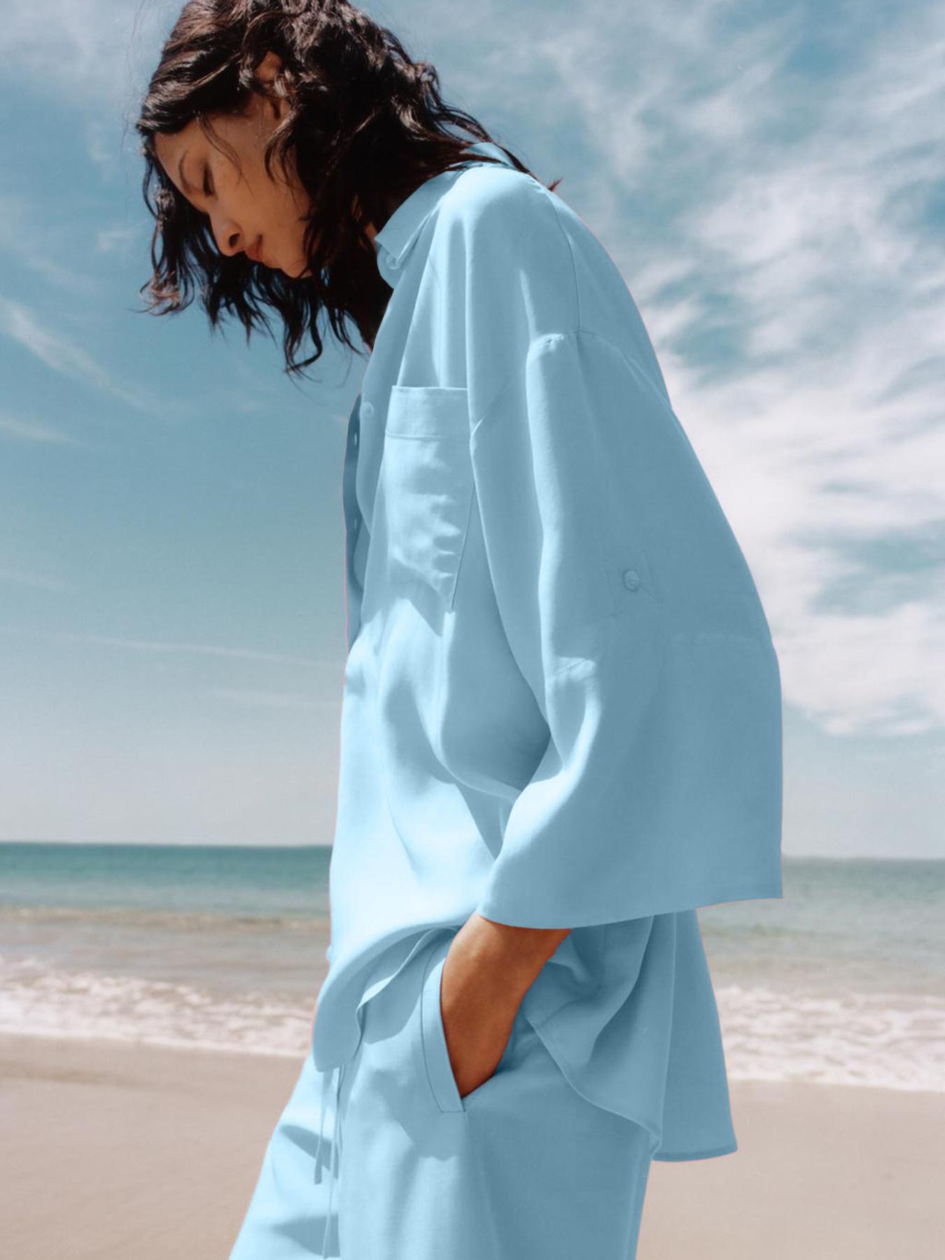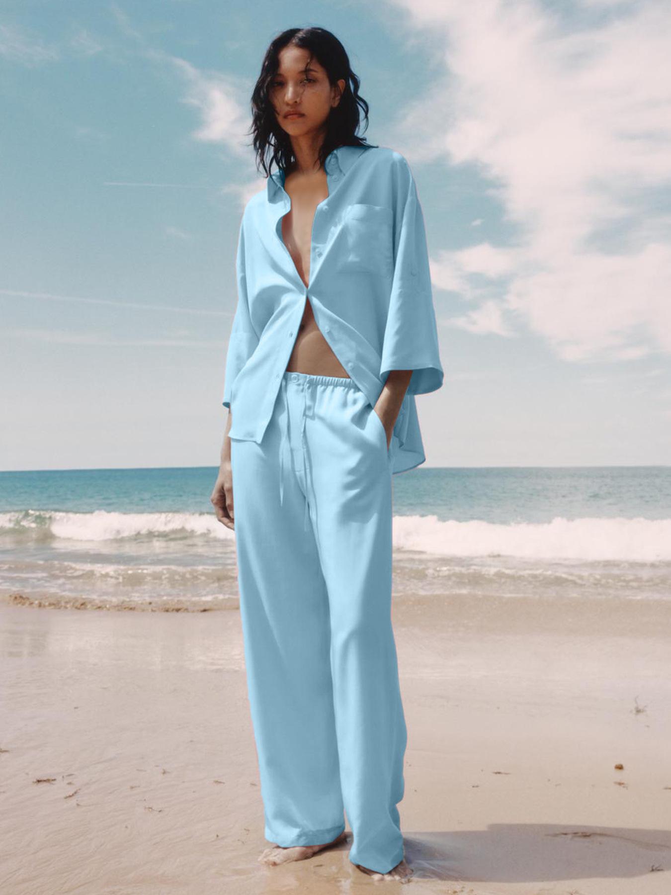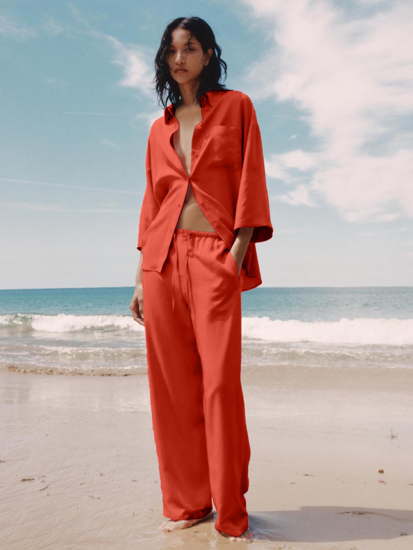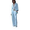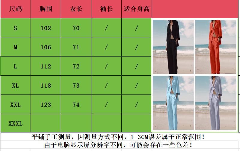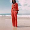 Traje de dos piezas con botones y camisa de color sólido con textura de satén de seda para mujer, estilo europeo y americano, verano 2024