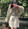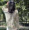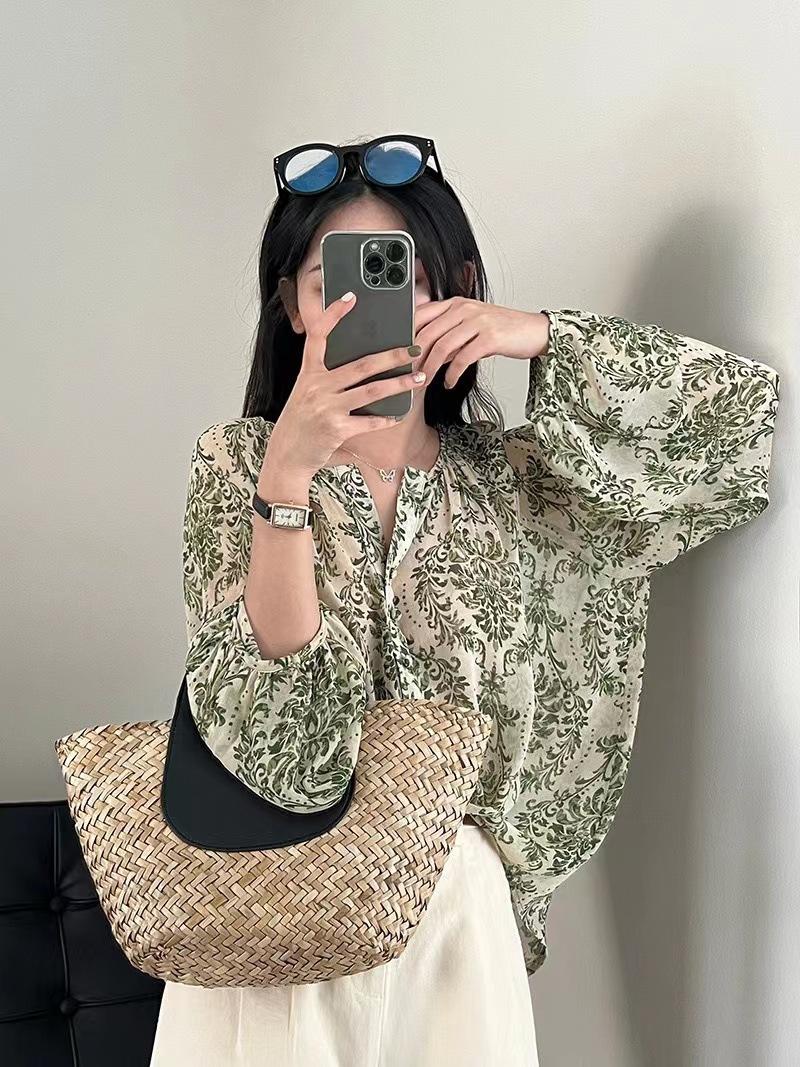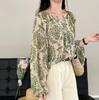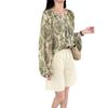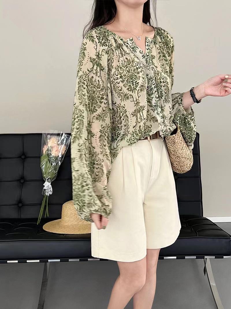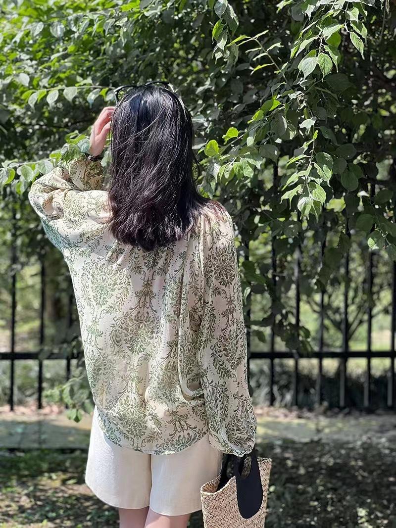 Comercio exterior transfronterizo pequeño de retro holgado adelgazante verde floral manga linterna microtransparente camisa de gasa bf camisa de protección solar Mujer
