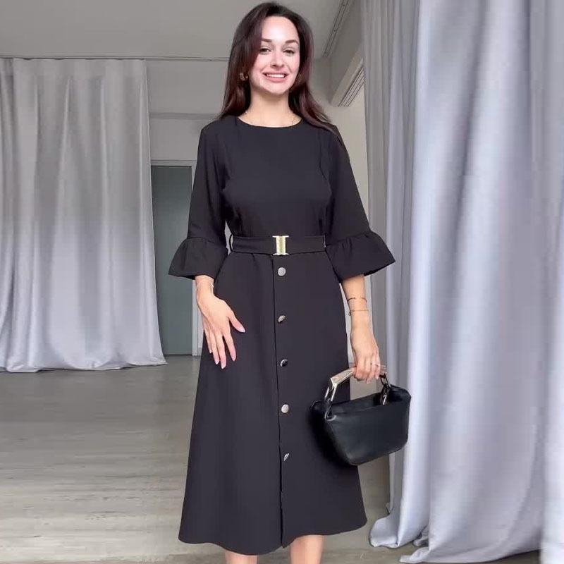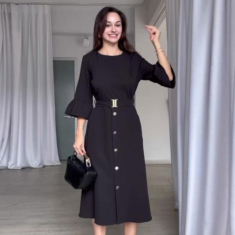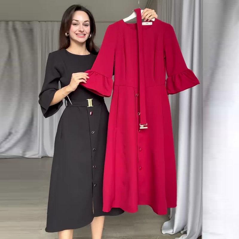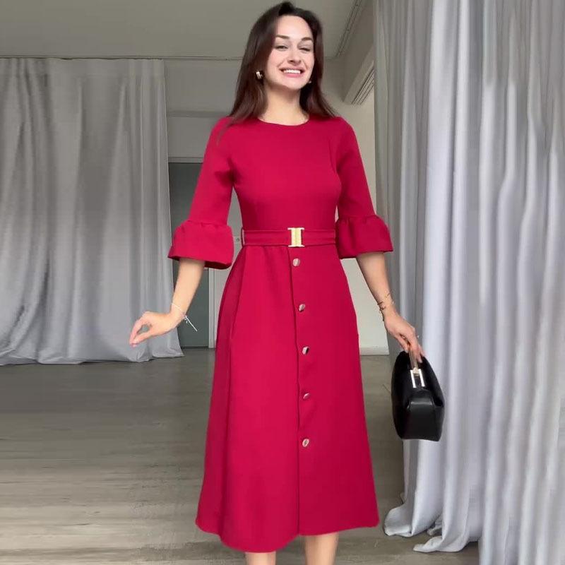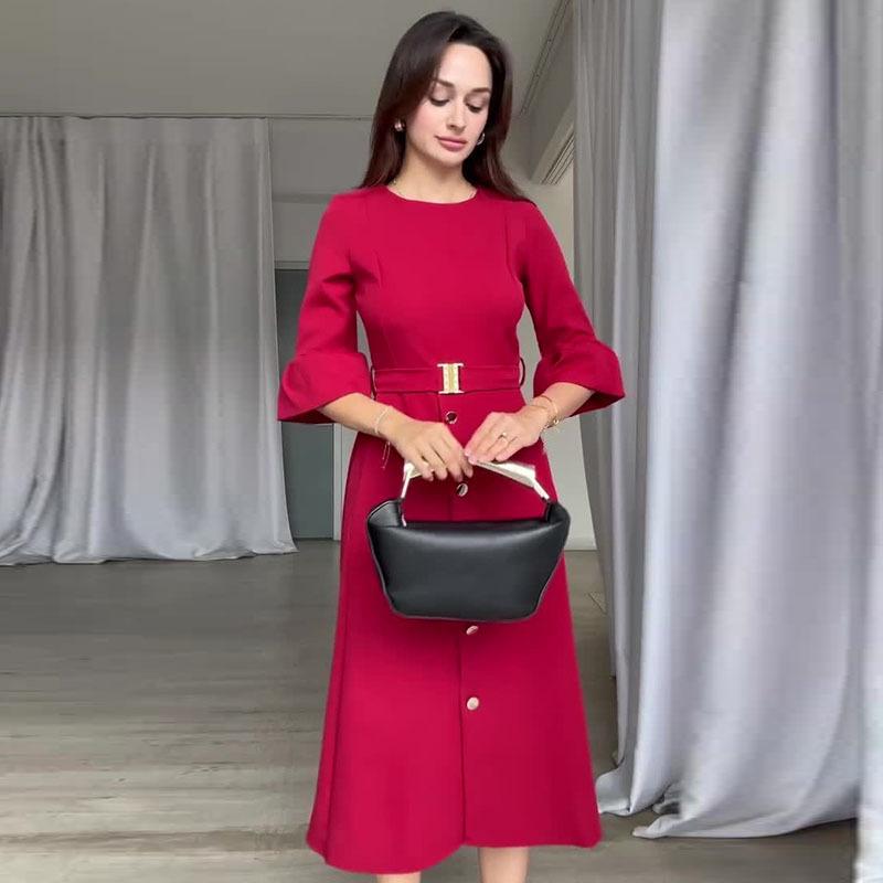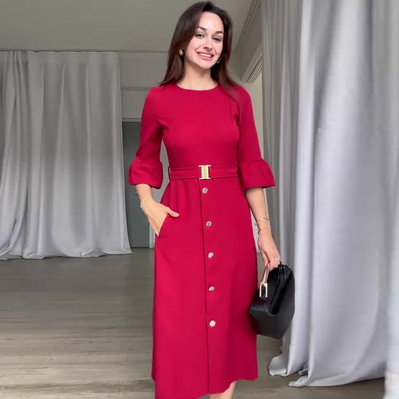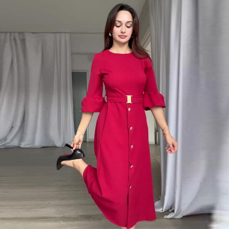 Amazon Transfronterizo 2024 Temperamento Otoñal Europeo y Americano Nueva Moda Cuello Redondo Color Sólido Vestido Slim con Cinturón