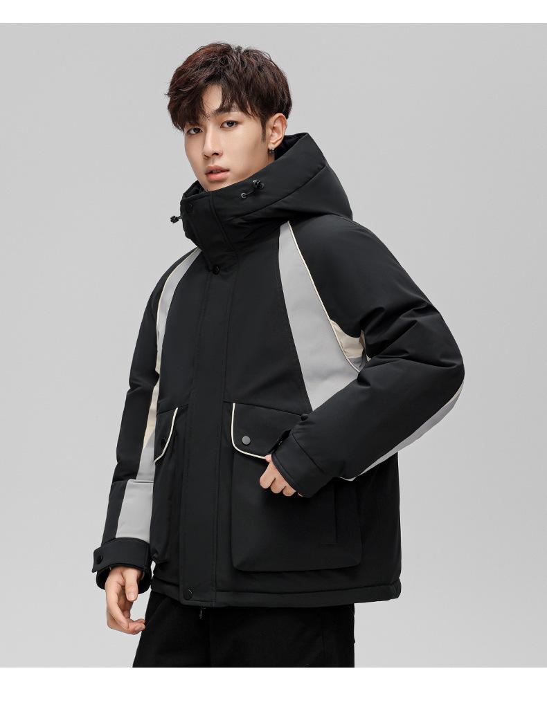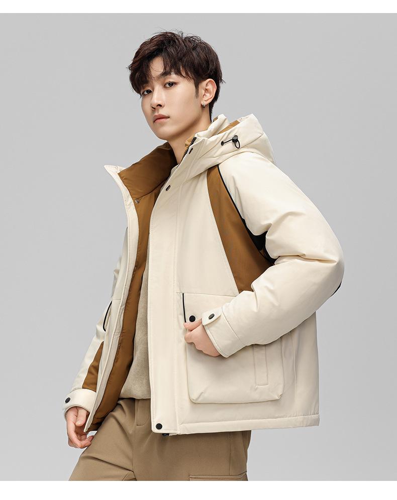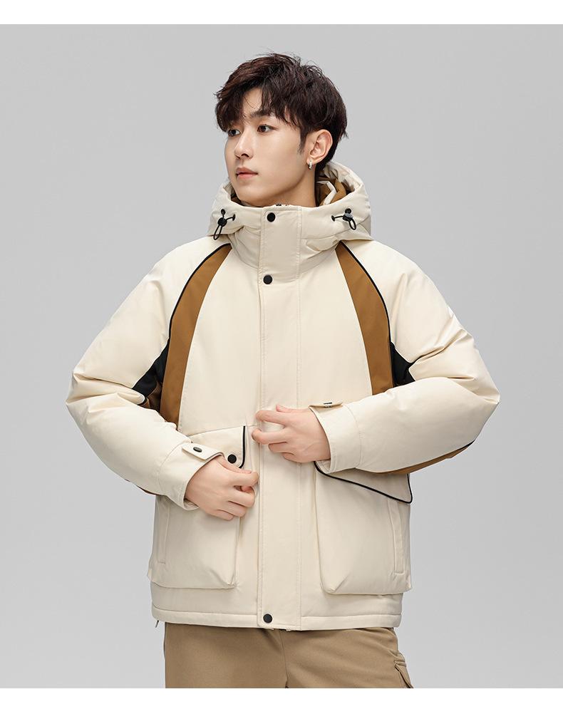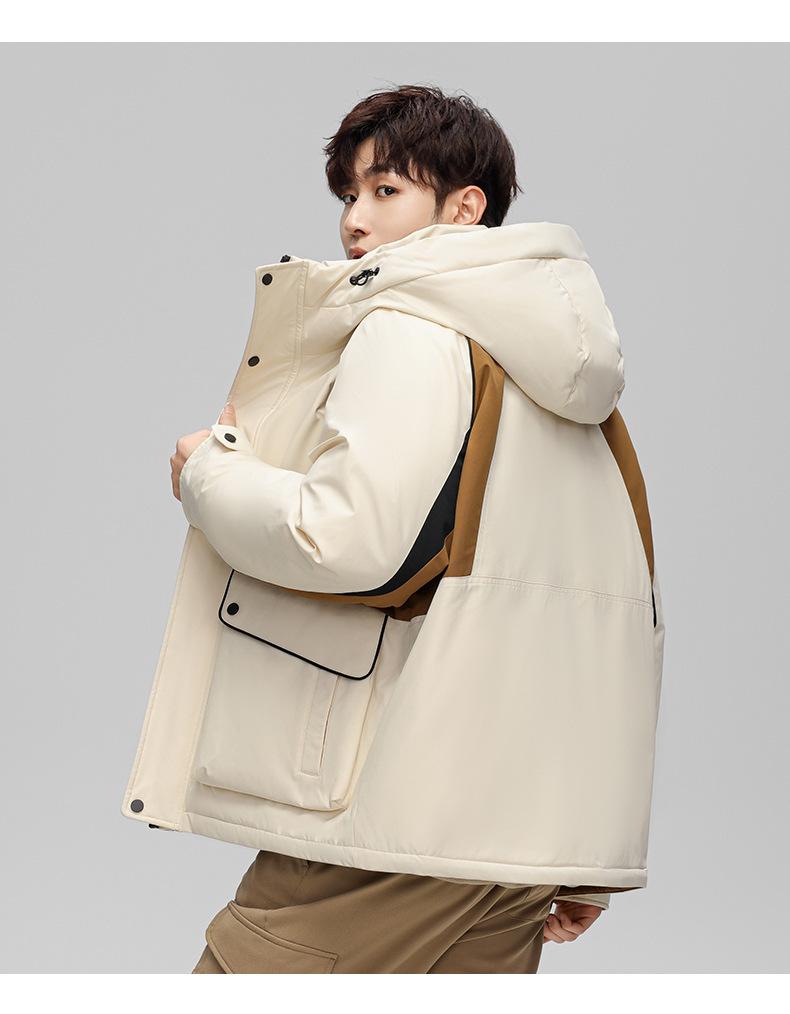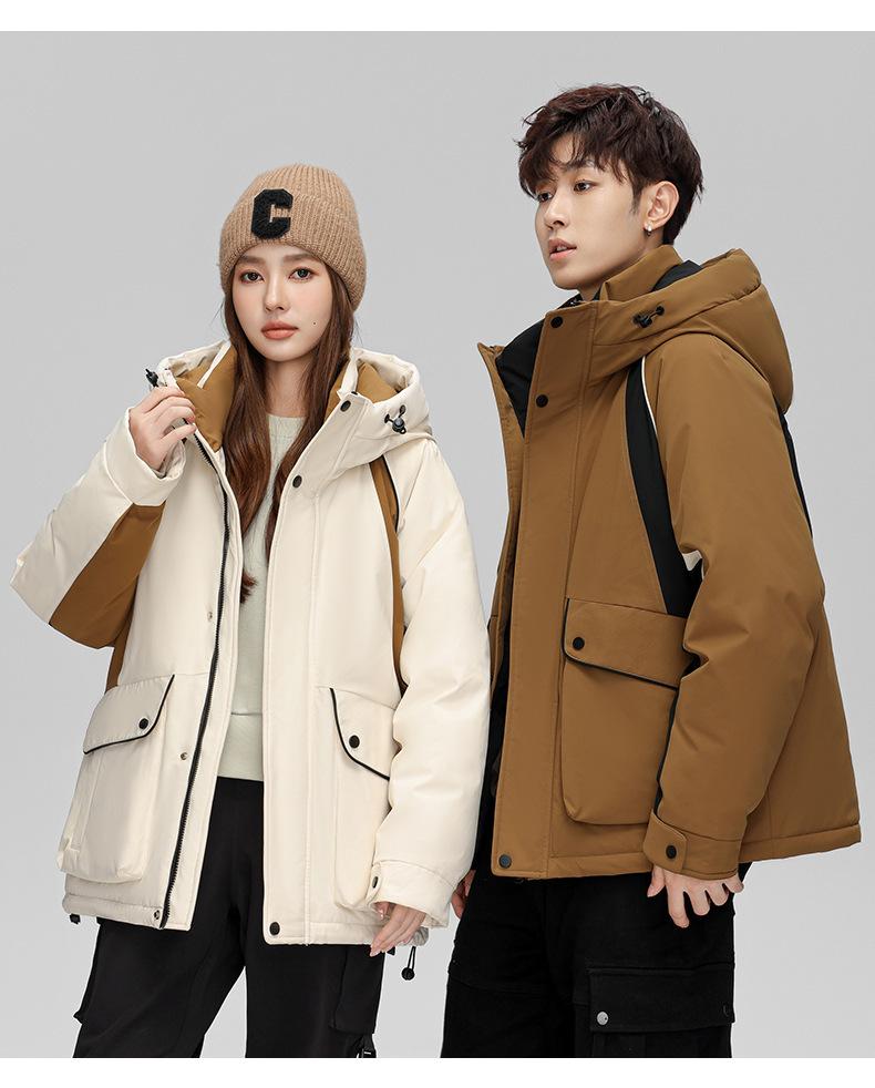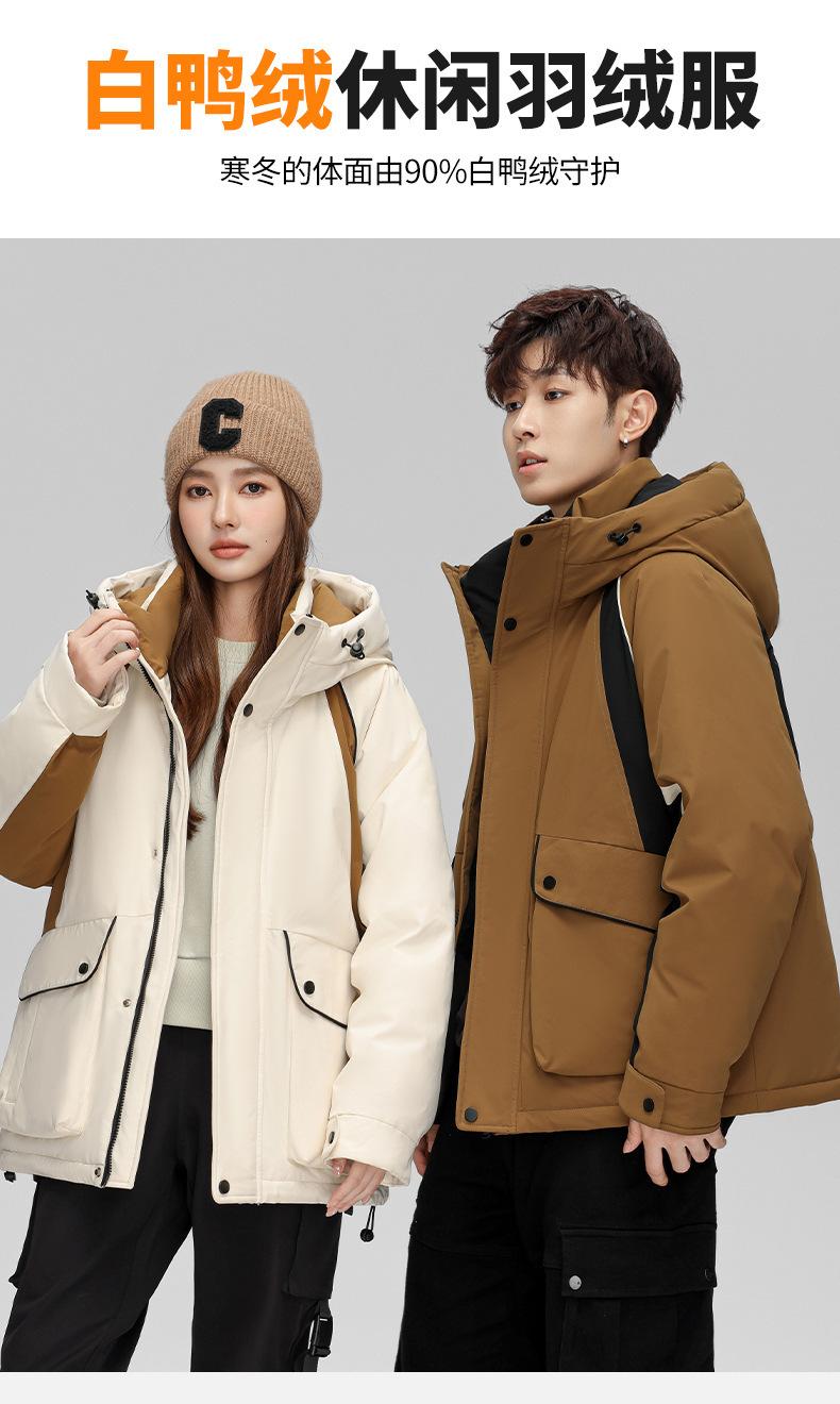 Chamarra de plumón de pato blanco 90 de cuello medio alto invierno marca estadounidense de moda empalmado chamarra de plumón para hombre adolescentes pareja top con capucha